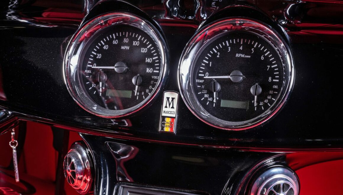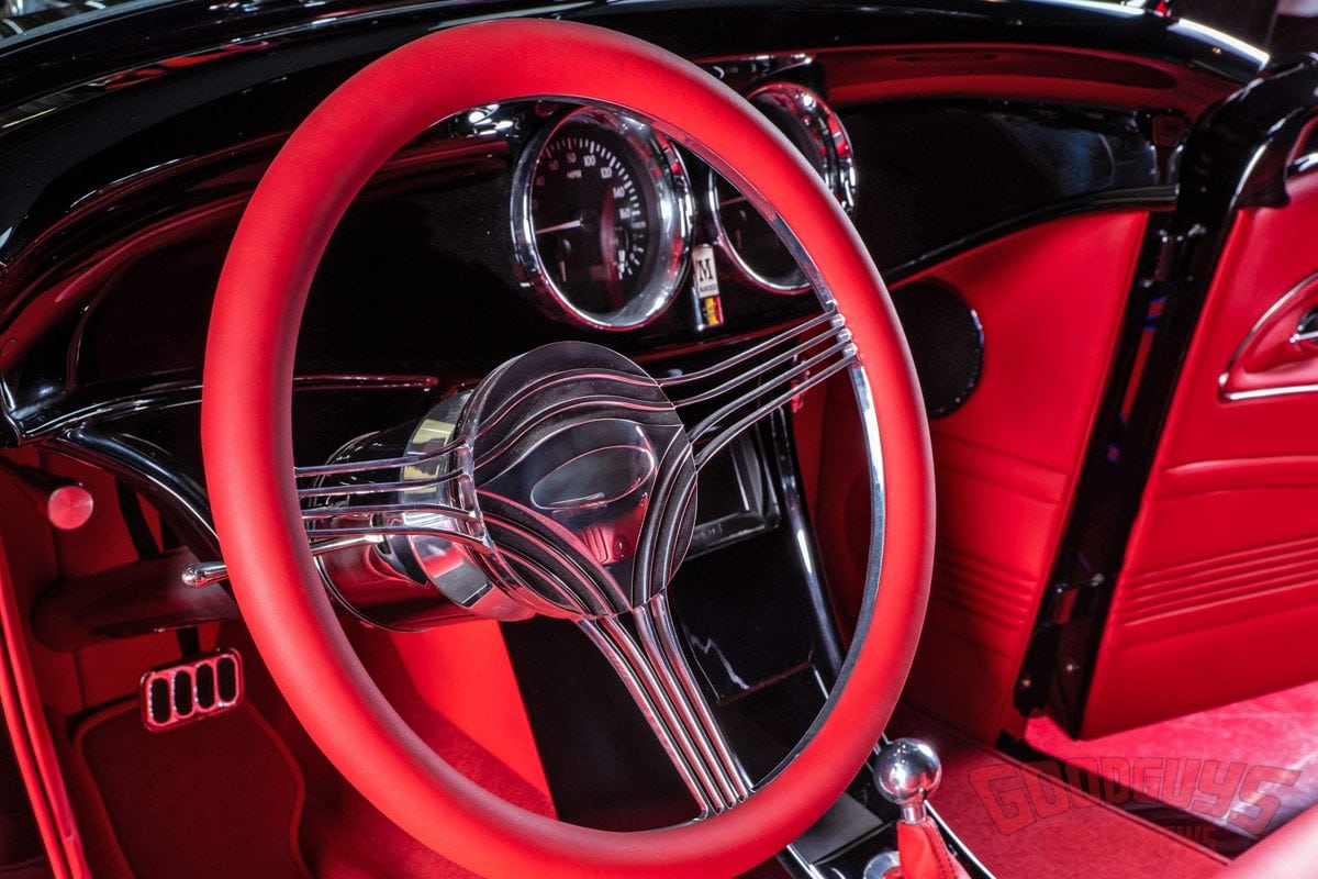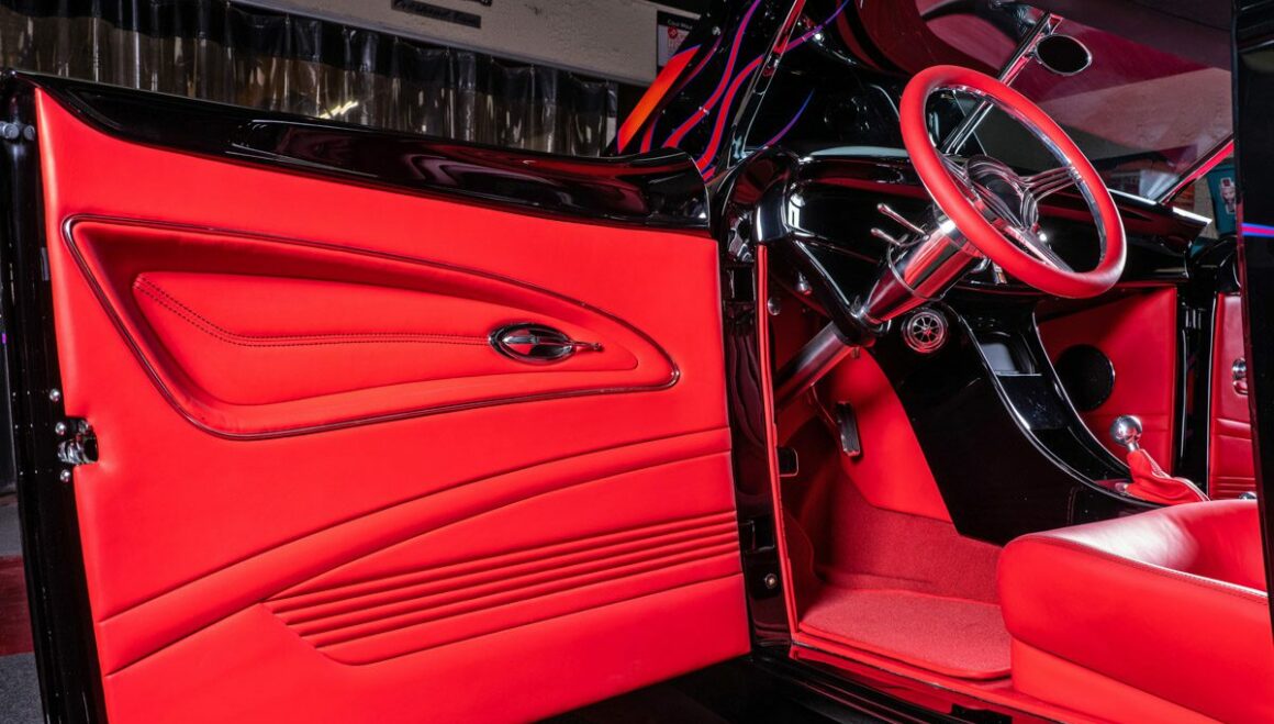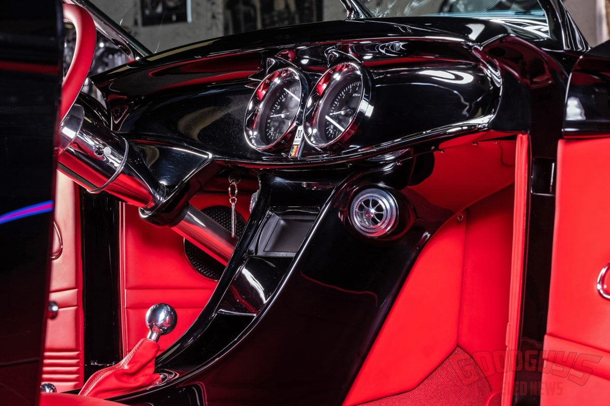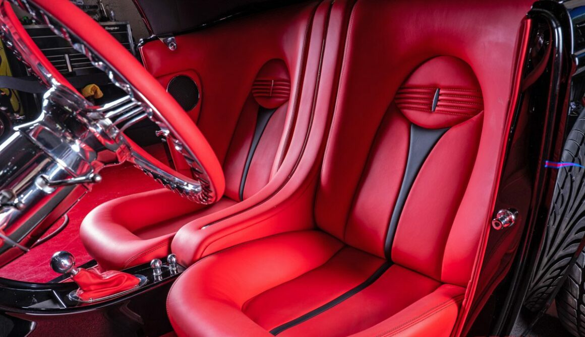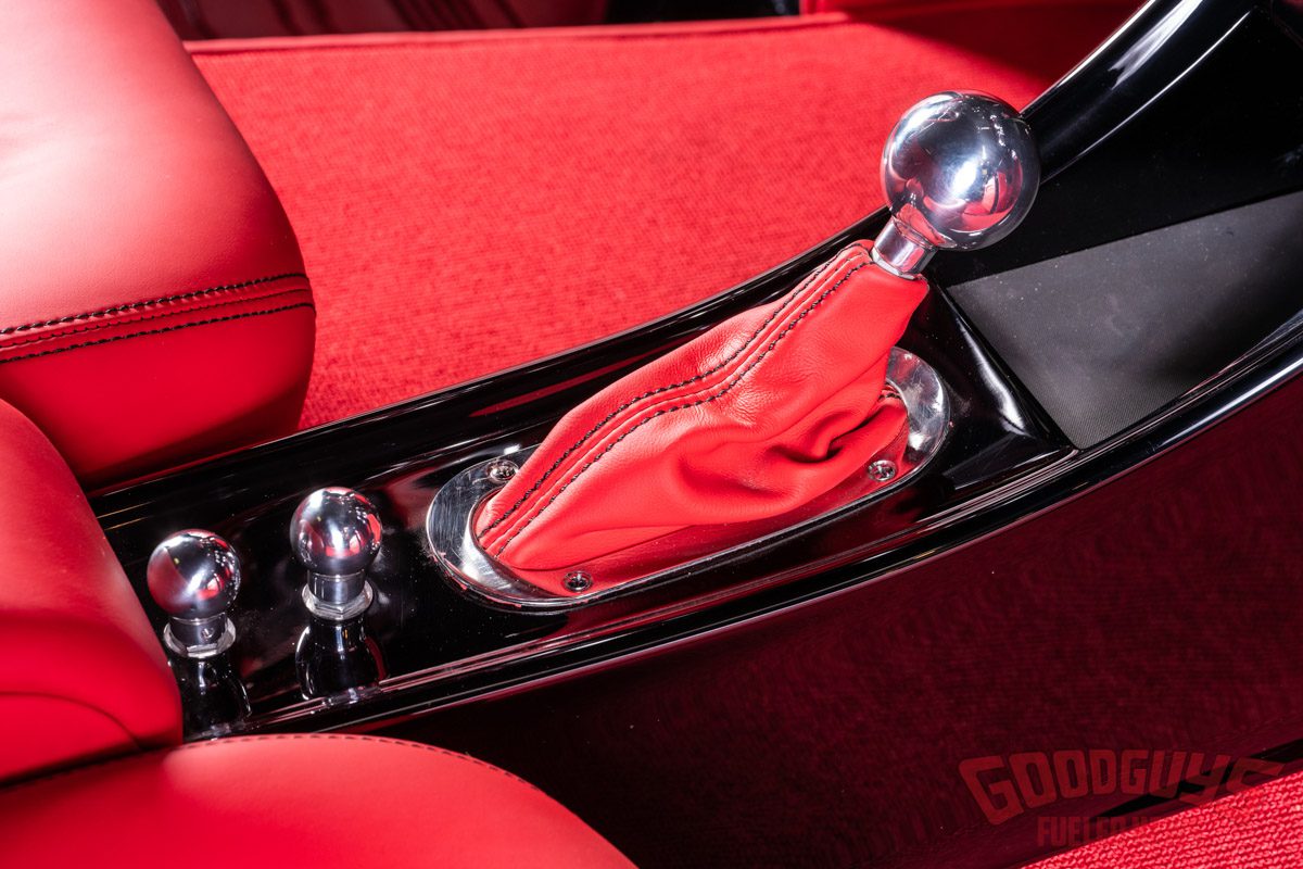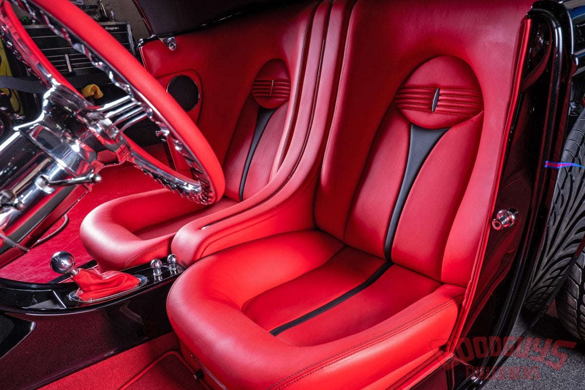 La sellerie personnalisée de Gabe a donné au cockpit un impact égal avec une sellerie en cuir rouge vif et des garnitures personnalisées. Reconstruit et meilleur que jamais, le Monty’s Muroc est le mélange parfait d’attitude classique de Hot Rod et de raffinement moderne…