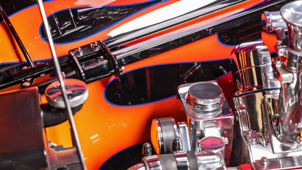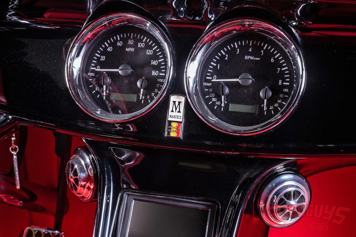 Ce sont des 16 et 18po. Le V8 est un LS1 surmonté d’une injection Hilborn. La carrosserie est maintenant magnifiquement recouverte d’une riche peinture noire PPG surmontée de flammes, l’une des spécialités de Doug Jerger chez Squeeg’s Kustoms.