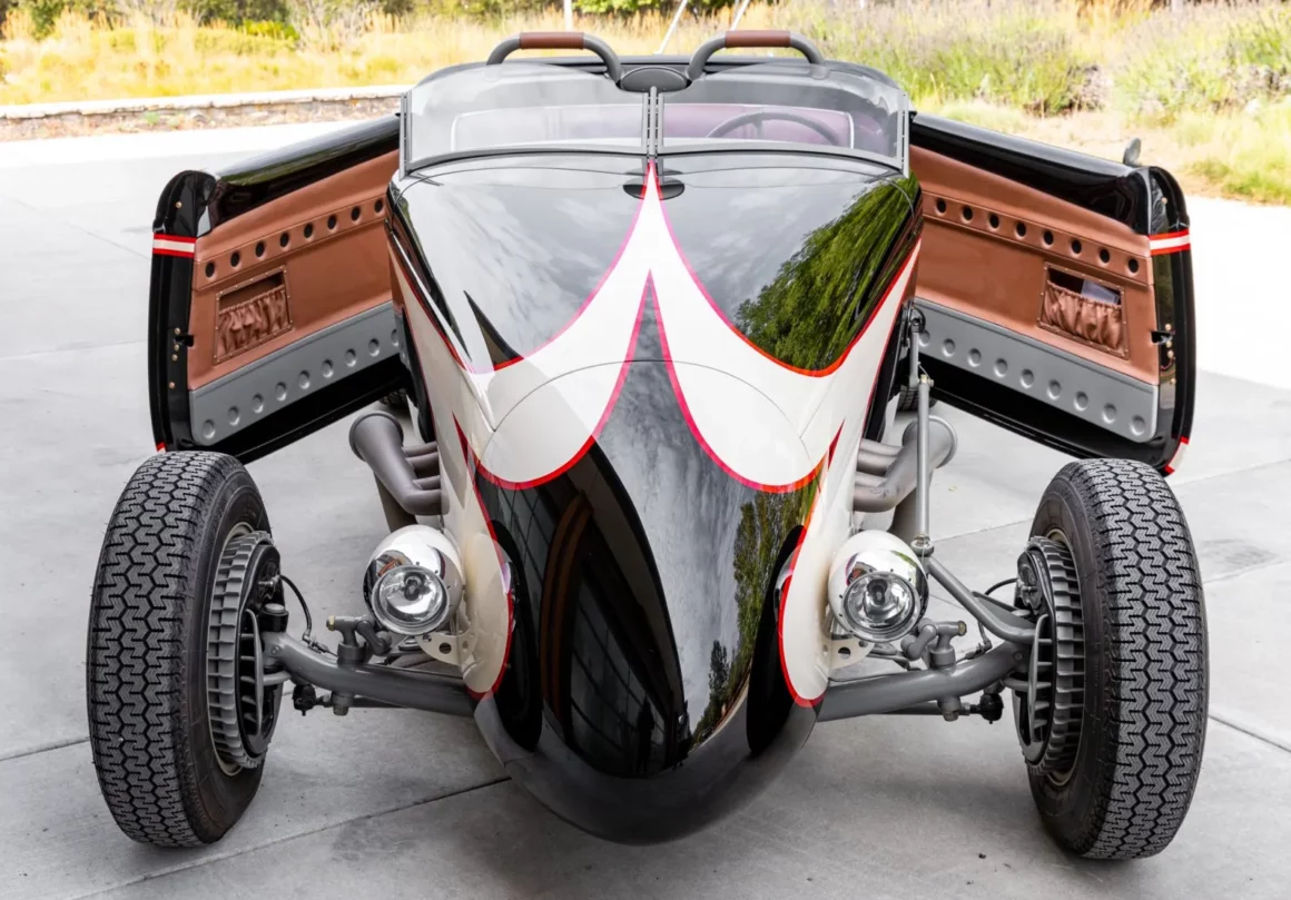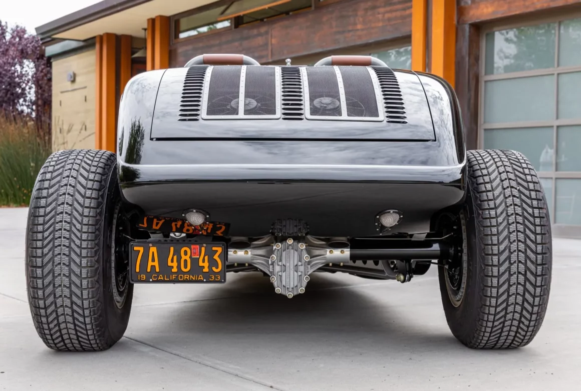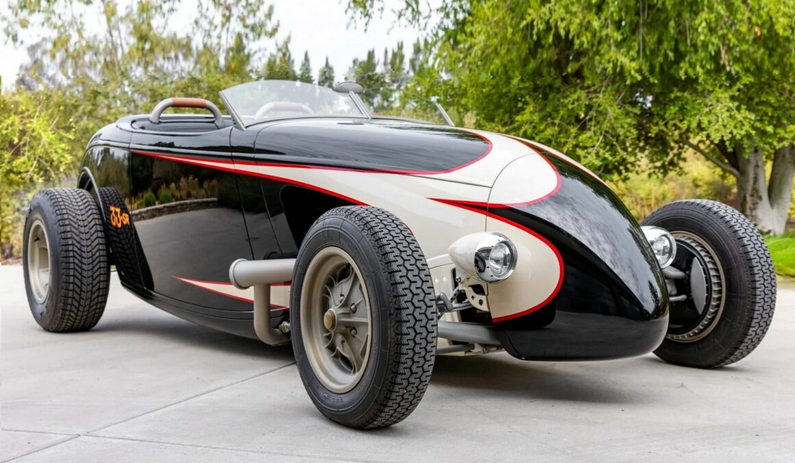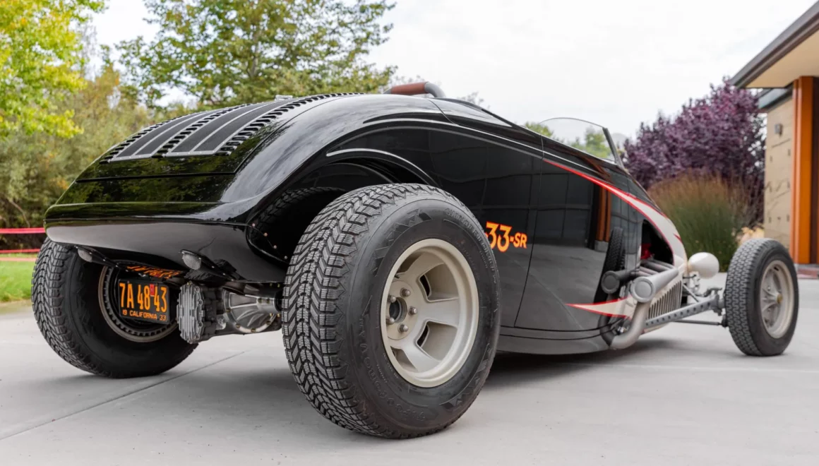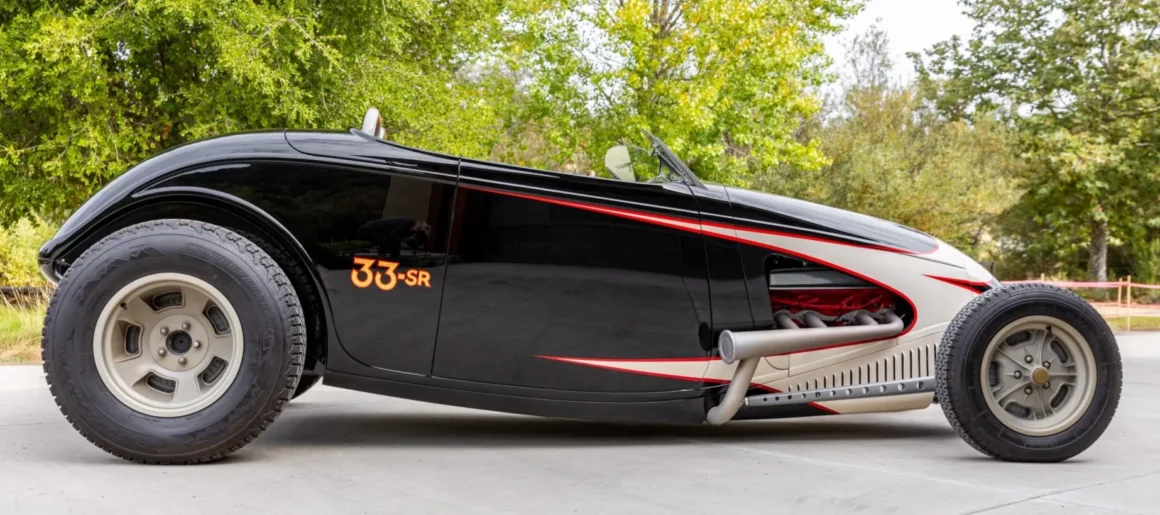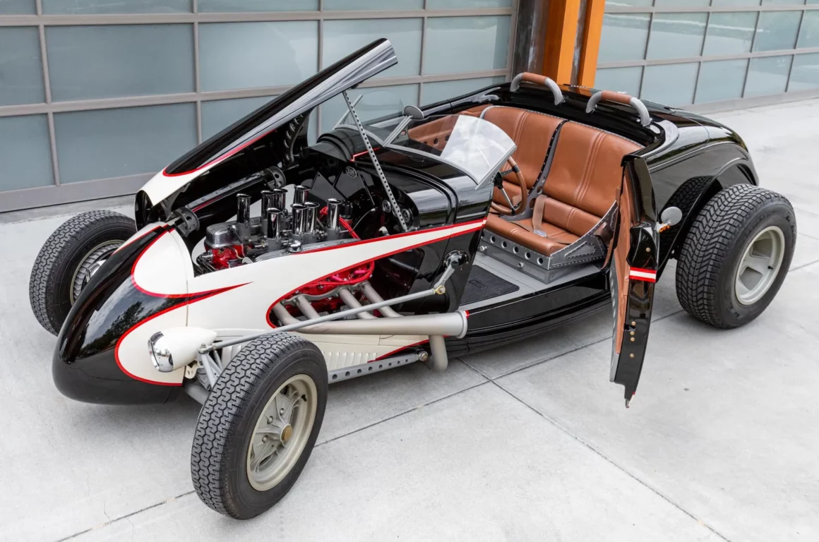 Ce Hot Rod personnalisé s’inspire des voitures de course sur lacs asséchés qui faisaient fureur en 1950. Il a été construit entre 2007 et 2010 par “Roadster Shop” situé dans l’Illinois/USA, au départ d’une carrosserie en acier “Speed33” de chez “American Speed Cy”, redessinée par le designer automobile “Eric Brockmeyer” qui a osé créer un “nez de chenille profilé” ainsi qu’un pare-feu personnalisé, un capot et un panneau de coffre arrière.
