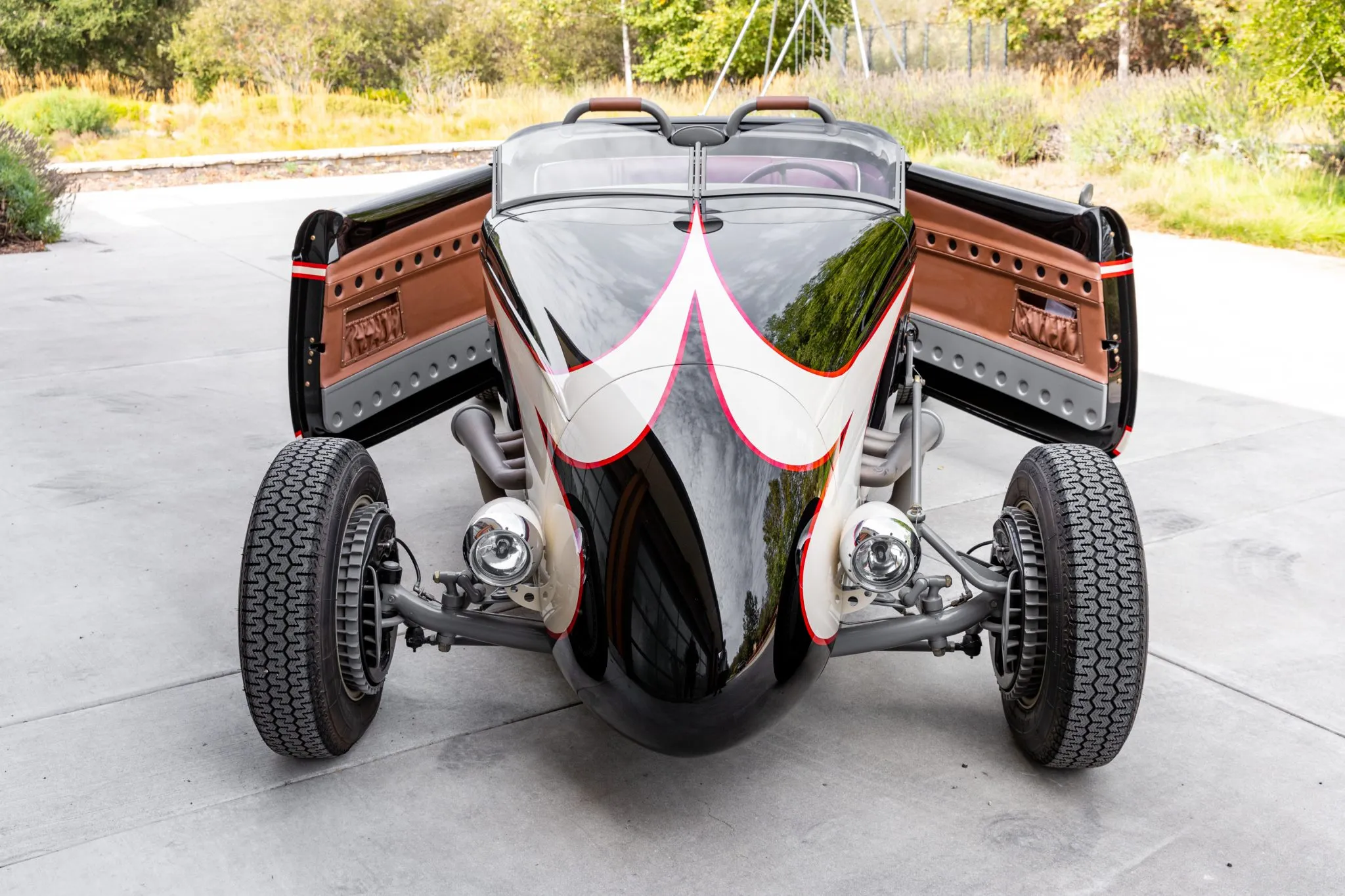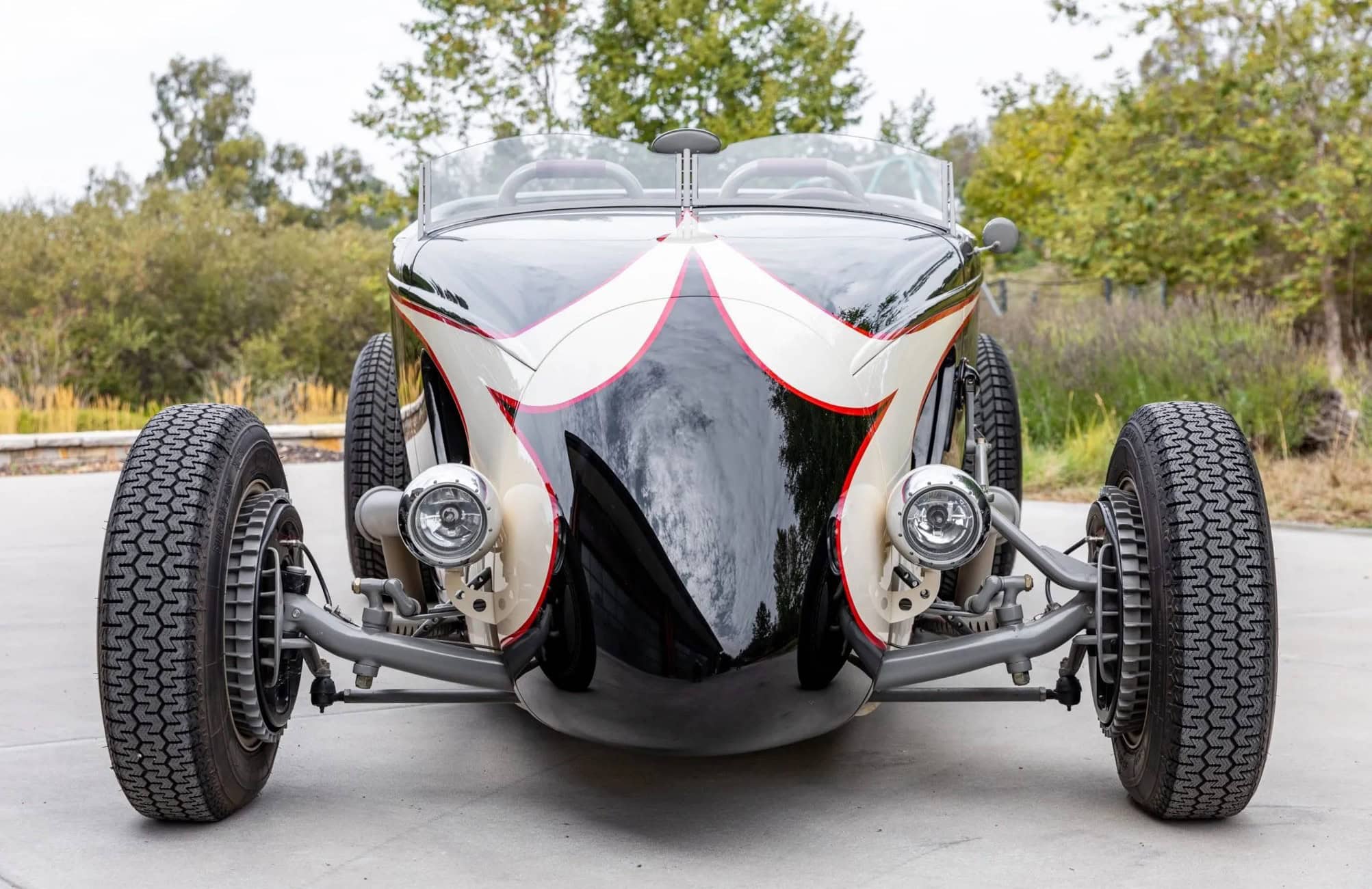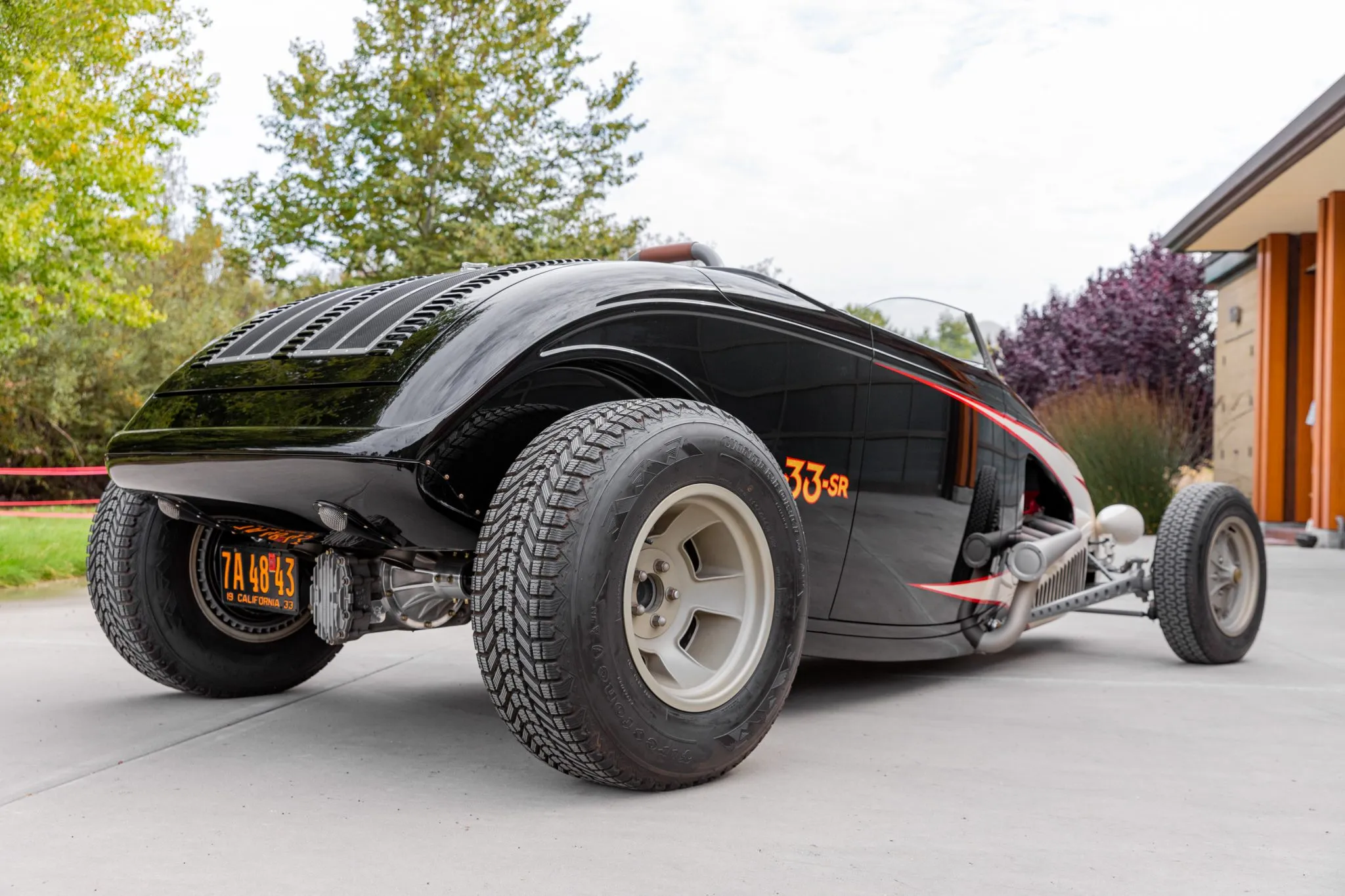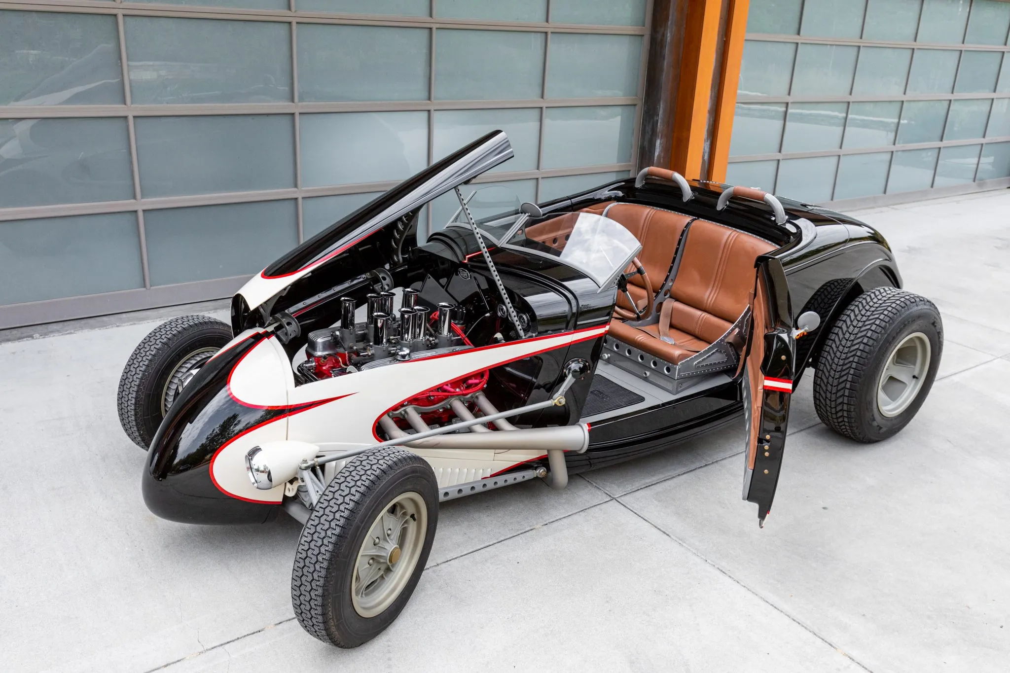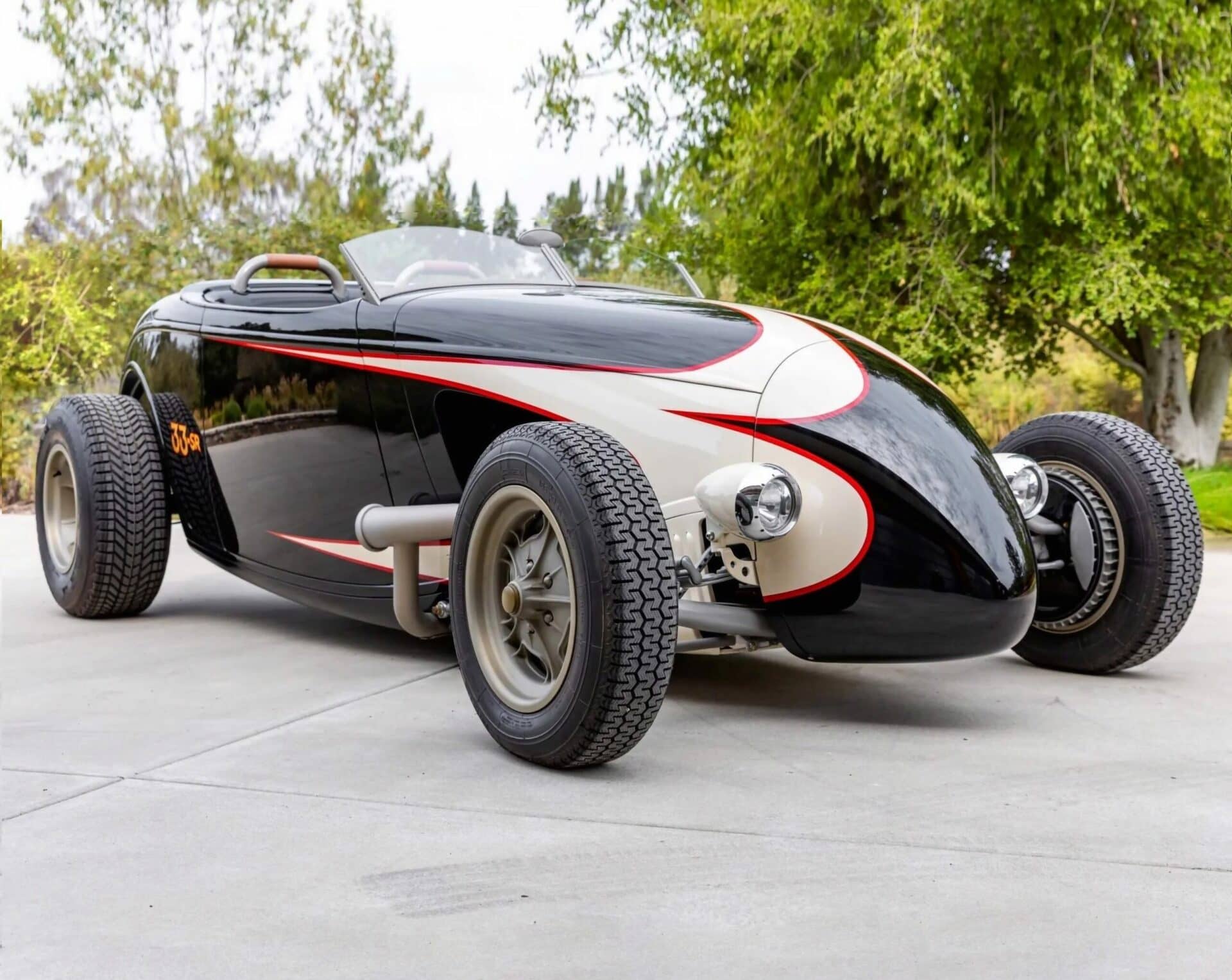 Ce Hot Rod personnalisé s’inspire des voitures de course sur lacs asséchés qui faisaient fureur en 1950. Il a été construit entre 2007 et 2010 par “Roadster Shop” situé dans l’Illinois/USA, au départ d’une carrosserie en acier “Speed33” de chez “American Speed Cy”, redessinée par le designer automobile “Eric Brockmeyer” qui a osé créer un “nez de chenille profilé” ainsi qu’un pare-feu personnalisé, un capot et un panneau de coffre arrière.