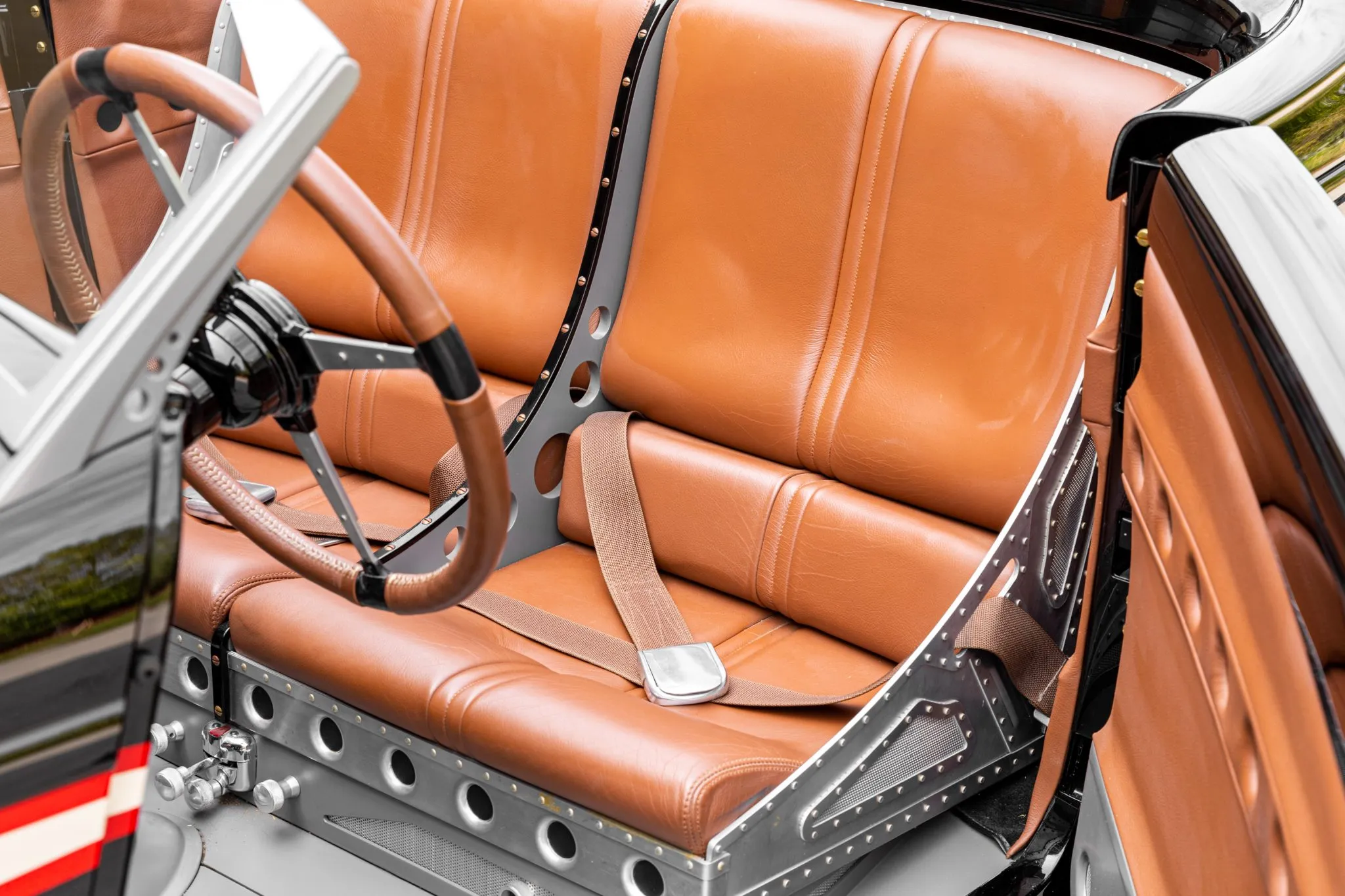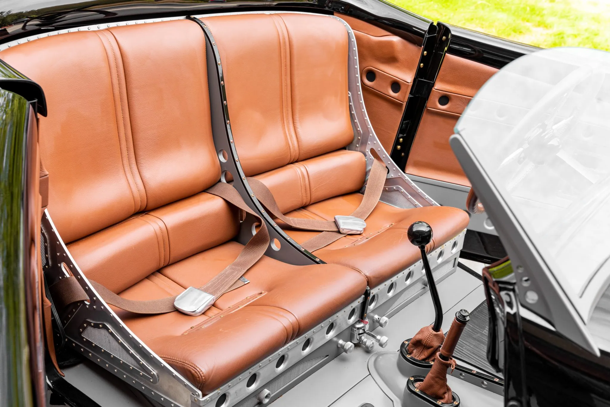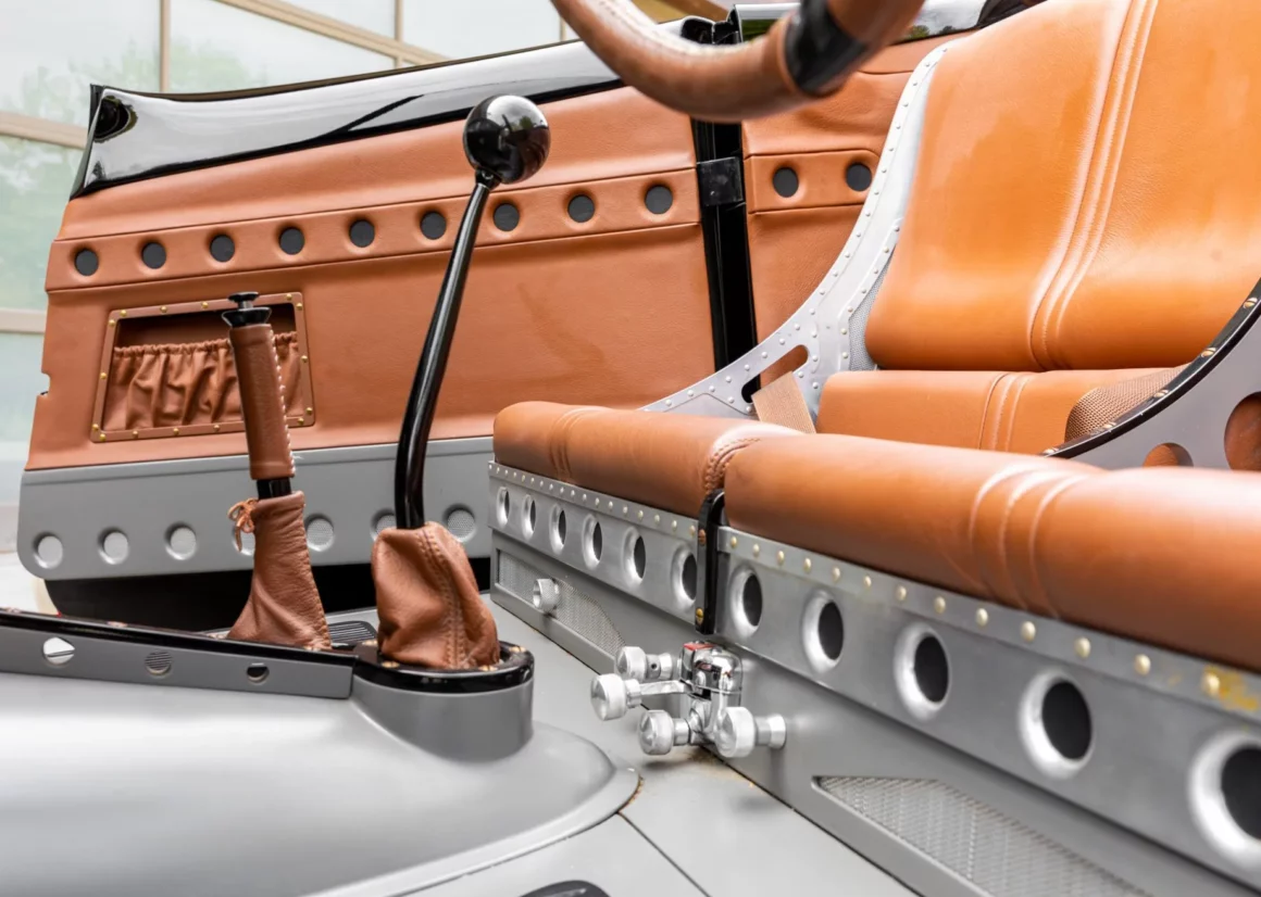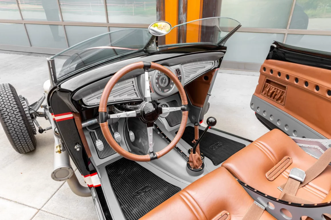 L’équipement supplémentaire comprend un pare-brise divisé personnalisé, deux faux arceaux de sécurité et des portes suicides. Les baquets de phares sont peints pour correspondre “aux coquilles Saint-Jacques”, et le carter de sécurité arrière intègre des feux LED. L’habitacle a également été conçu par Eric Brockmeyer et comporte une banquette personnalisée de style bombardier garnie de cuir marron avec des panneaux latéraux et de portes assortis.