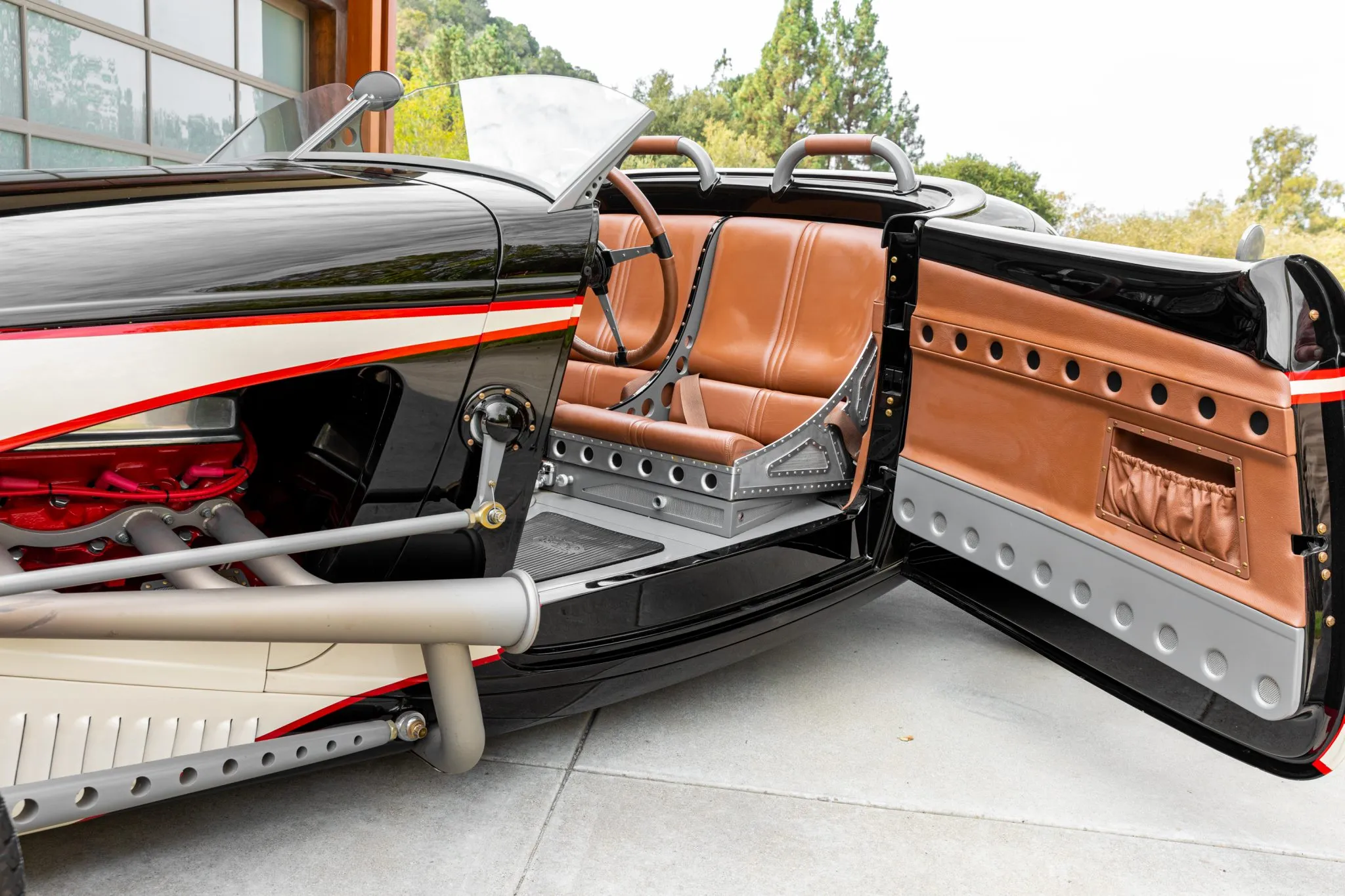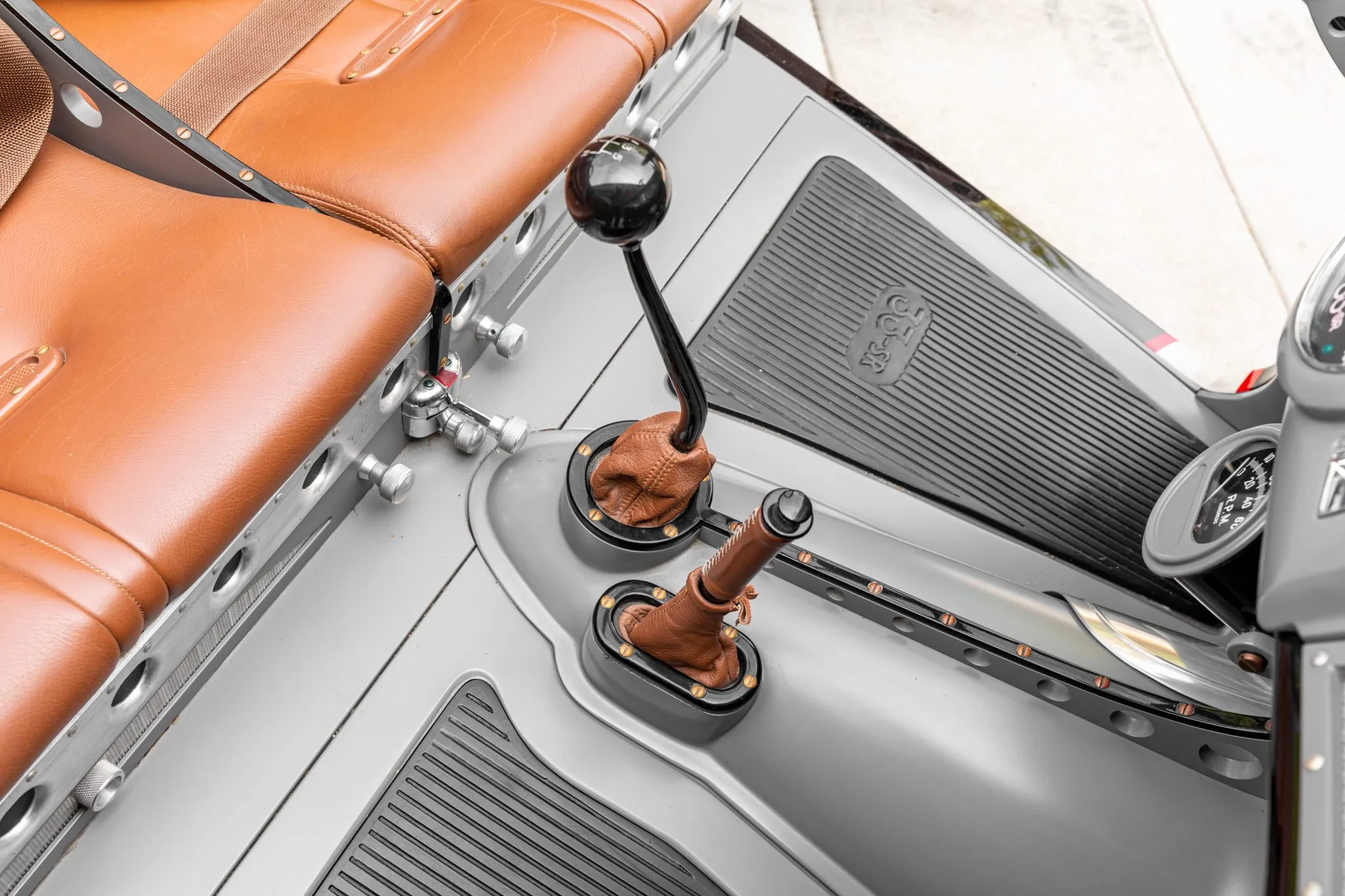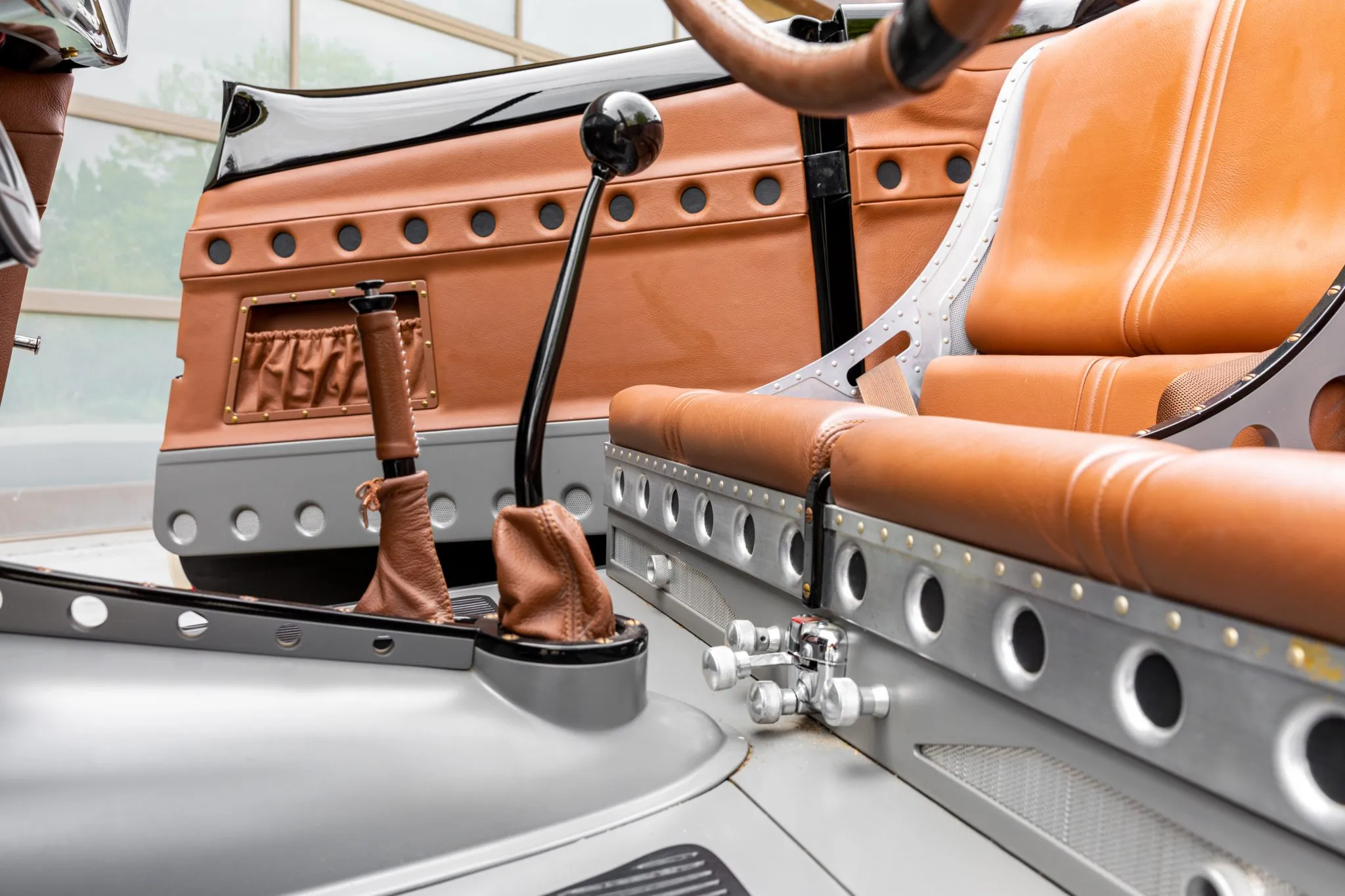 L’équipement supplémentaire comprend un pare-brise divisé personnalisé, deux faux arceaux de sécurité et des portes suicides. Les baquets de phares sont peints pour correspondre “aux coquilles Saint-Jacques”, et le carter de sécurité arrière intègre des feux LED. L’habitacle a également été conçu par Eric Brockmeyer et comporte une banquette personnalisée de style bombardier garnie de cuir marron avec des panneaux latéraux et de portes assortis.