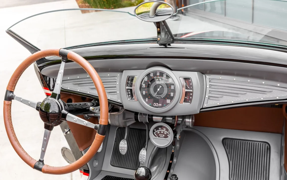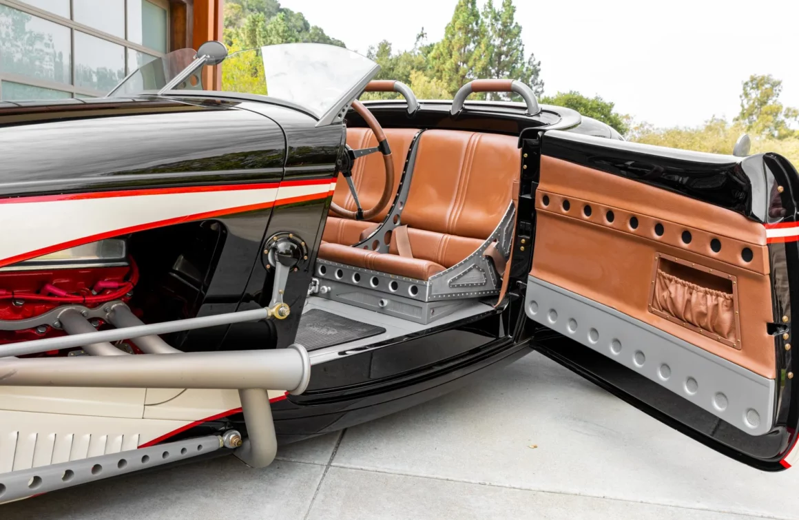 Ce fut réalisé par le tapissier californien Tom Sewell. Des tapis en caoutchouc noir bordent les sols et les ceintures abdominales proviennent d’une Ford Thunderbird des années 1950. Notez que l’appareillage de commutation a été déplacé sur la base du siège, à l’arrière du levier de vitesses. Le volant à quatre branches gainé de cuir provient de chez “Johnson’s Hot Rod Shop”, et le tableau de bord est équipé d’un groupe d’instruments d’époque remis à neuf.