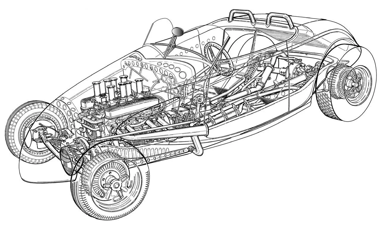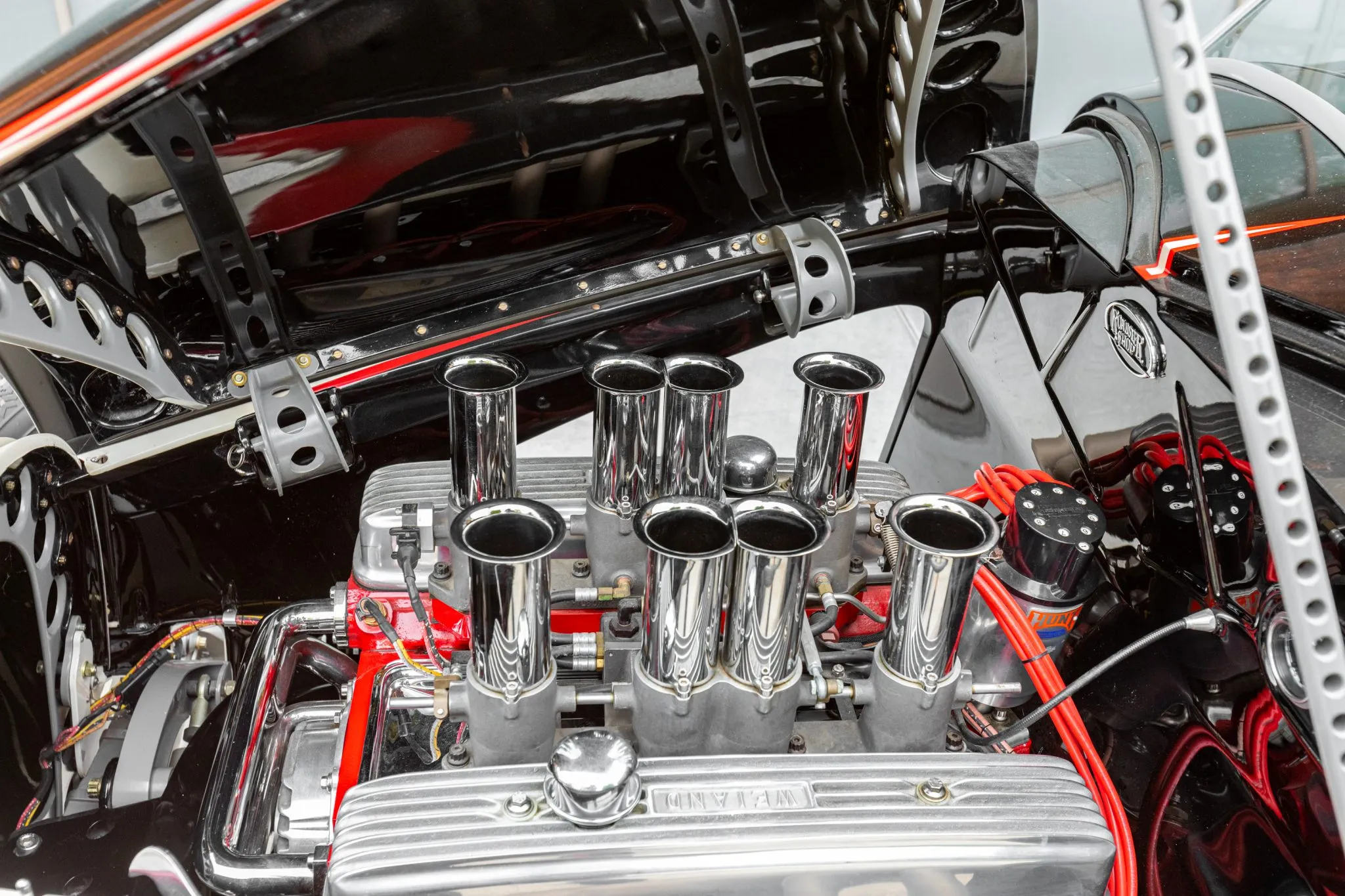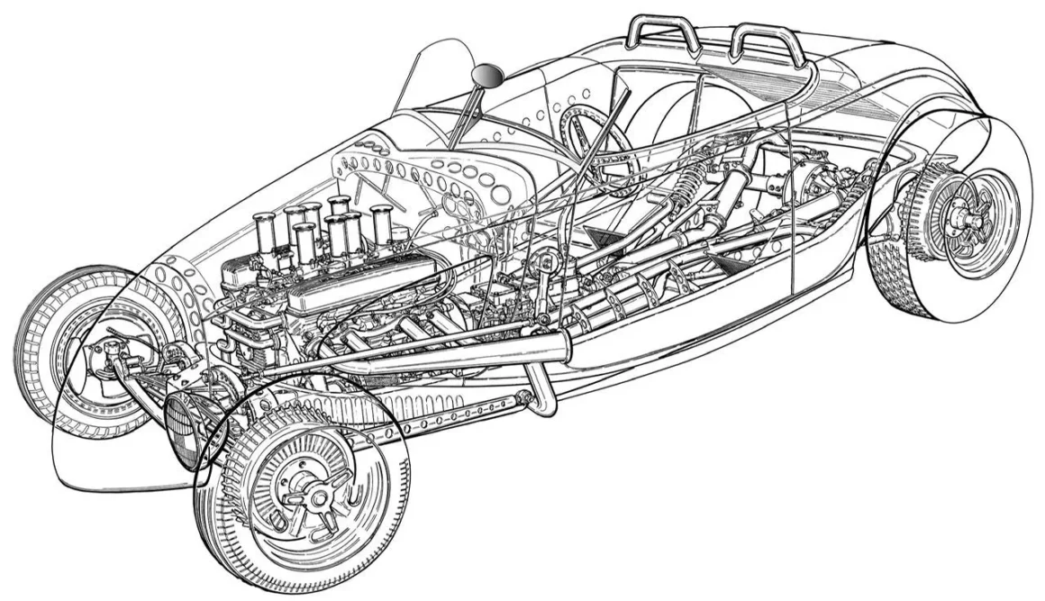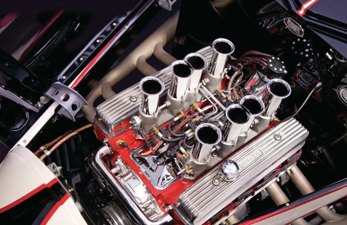 Il est adapté à ce que le radiateur d’eau y devait être positionné et ventilé en conséquence. Il a donc fallu réaliser un châssis adapté sur mesure qui a été réalisé par “Plymouth Township Cars” situé dans le Michigan. Toutes les sociétés citées étant Américaines. La puissance provient d’un V8 Buick Nailhead poussé à 432ci doté d’une configuration d’injection de carburant électronique Hilborn contrôlée par un calculateur BigStuff3…