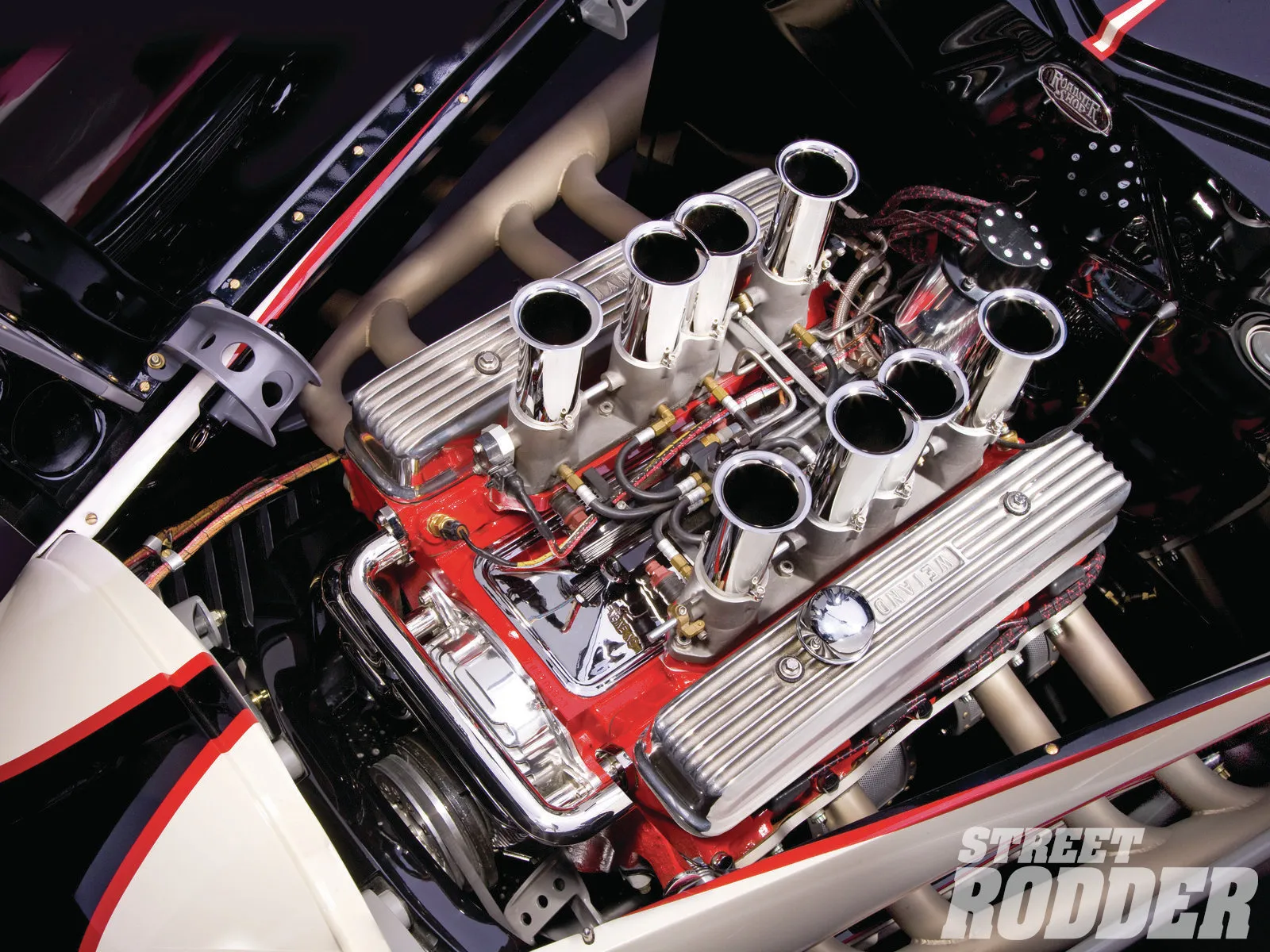 Les couvercles caches-soupapes sont des Weiand. Les échappements personnalisés dits de “style courses sur lacs asséchés” ont deux dérivations, l’une est en échappement libre, l’autre est pour la ville et la police.. La transmission manuelle à cinq vitesses est une “Tremec”. L’essieu tubulaire avant est un Ford 1937 doté d’un ressort à lames transversal, d’axes Ford 40 et d’amortisseurs avant en porte-à-faux fabriqués sur mesure.