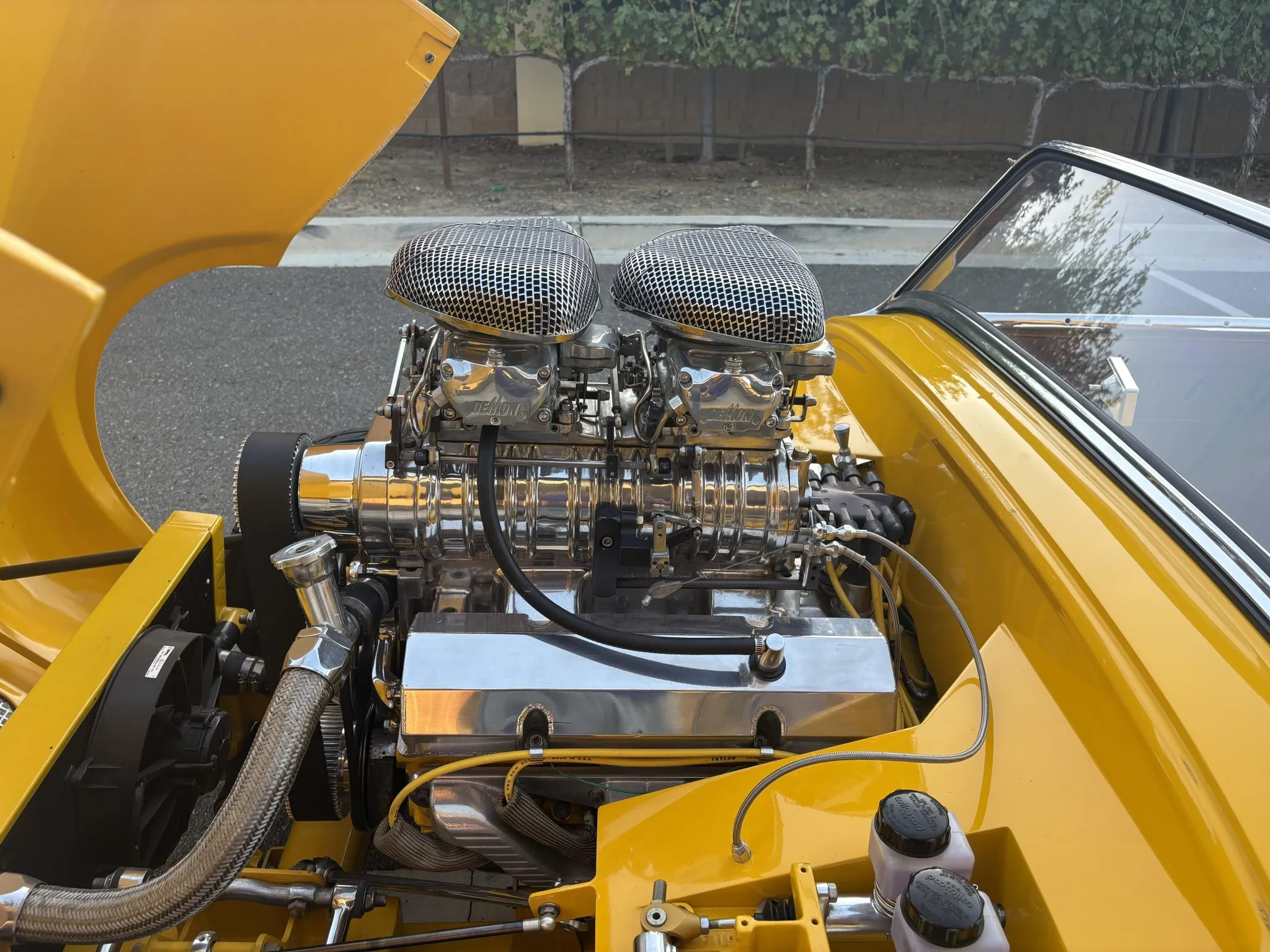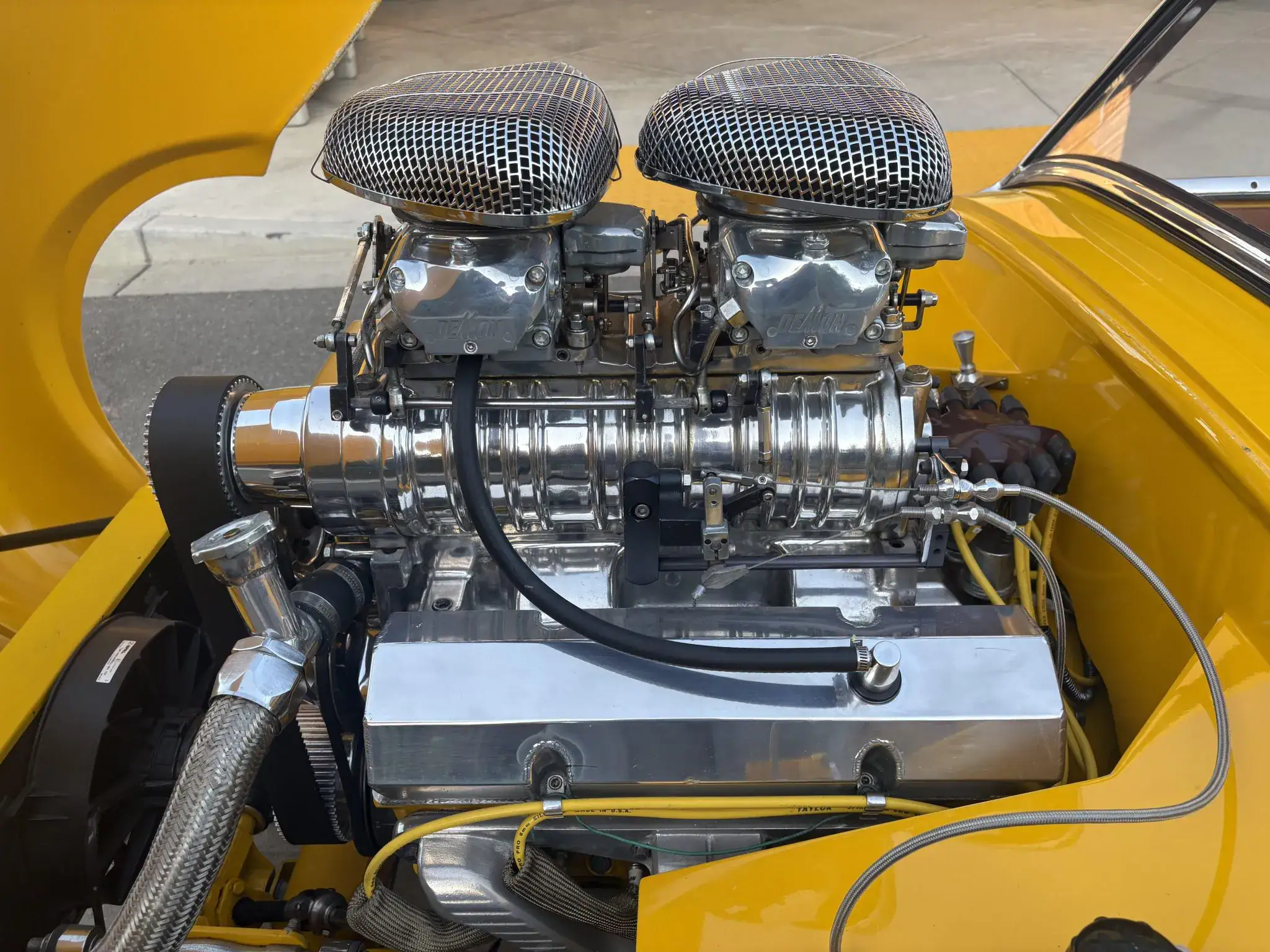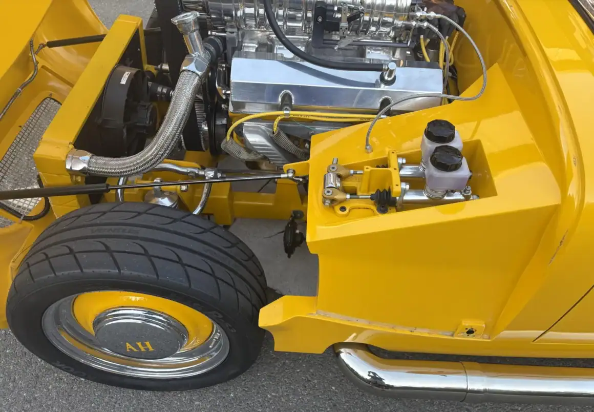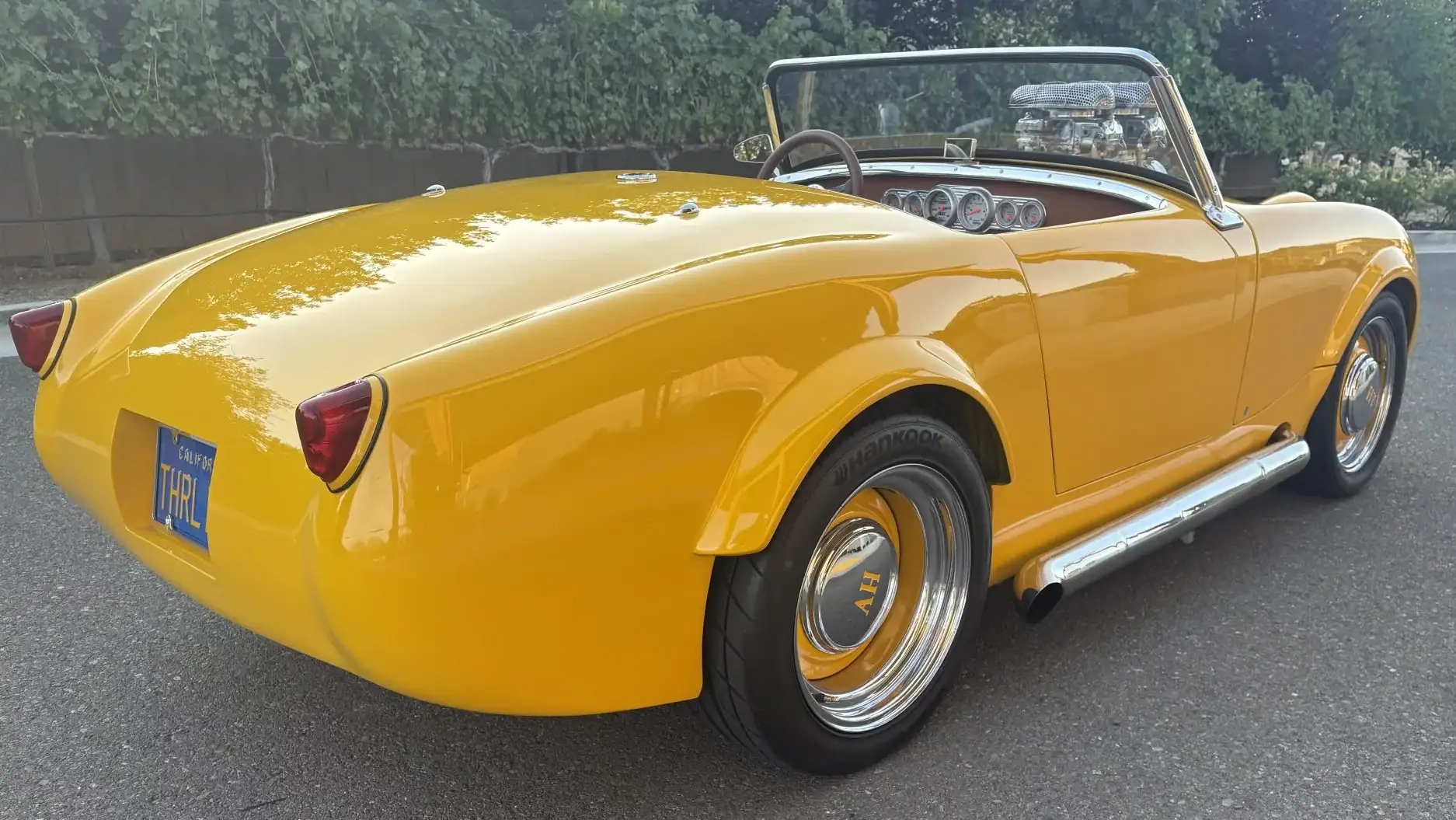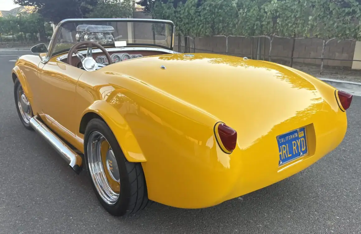Cette Austin-Healey Bugeye Sprite de 1960 a été motorisée d’un V8 Chevy 350ci équipé d’un compresseur B & M, de pistons forgés, d’un arbre à cames Crane, de deux carburateurs Demon 625cfm, d’un allumage Mallory et de collecteurs Sanderson. Les autres équipements comprennent une transmission automatique à trois vitesses TCI StreetFighter TH350, un convertisseur de couple B&M, un pont/différentiel Ford, d’une crémaillère de direction Mustang II, d’une colonne de direction Flaming River, de freins à disque avant Wilwood en 11po, de bras de suspension avant en acier inoxydable “Aldan American”.