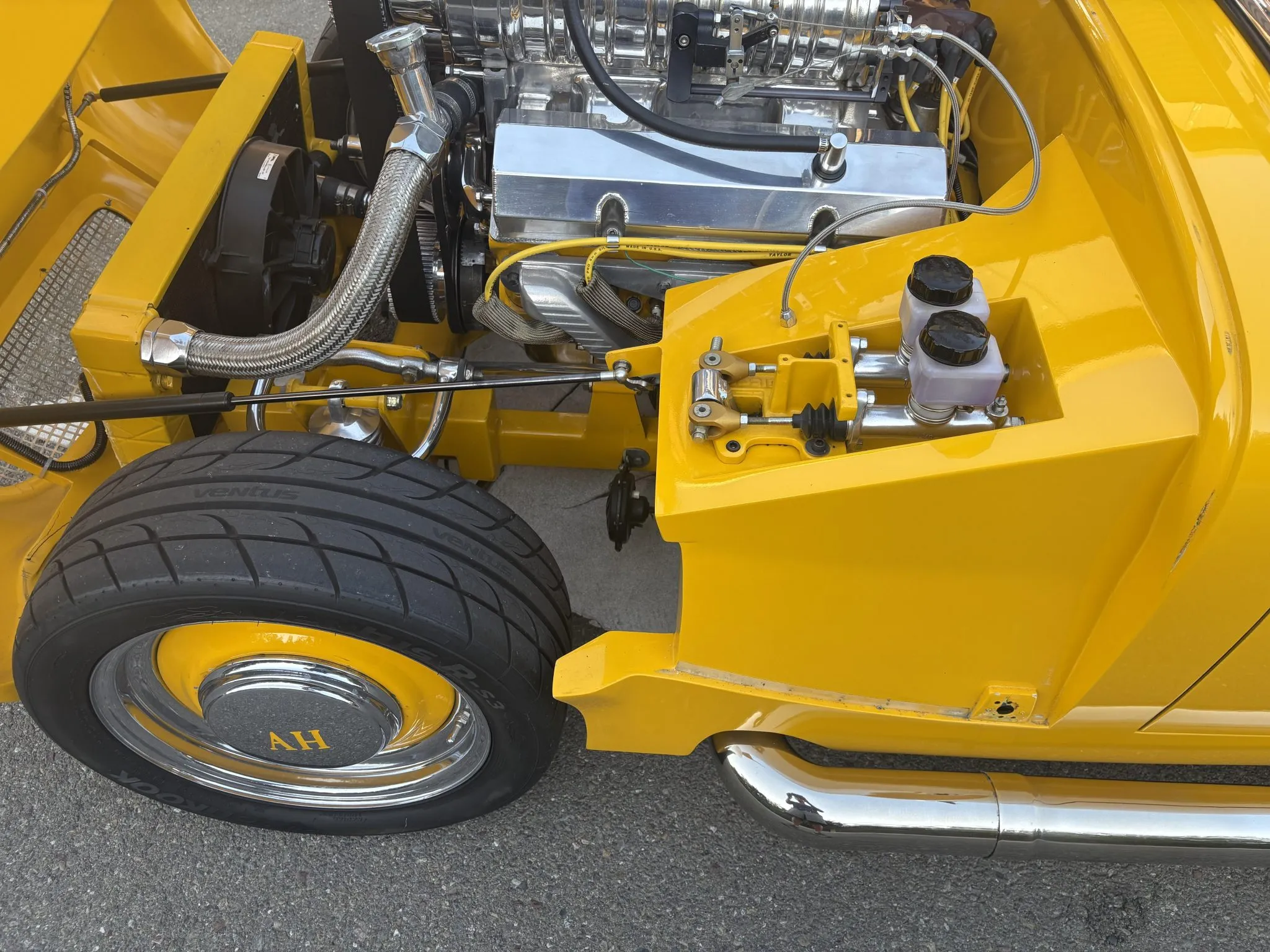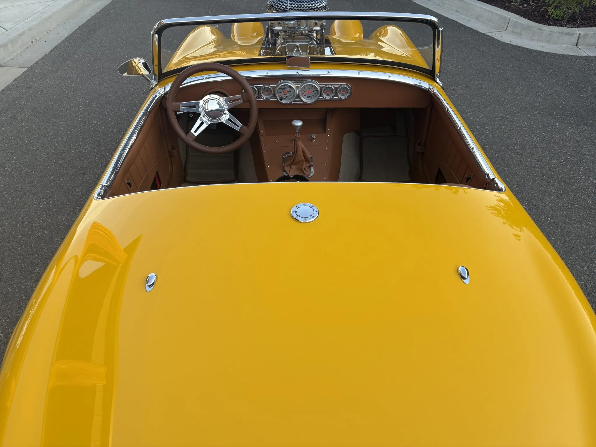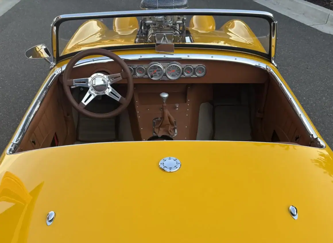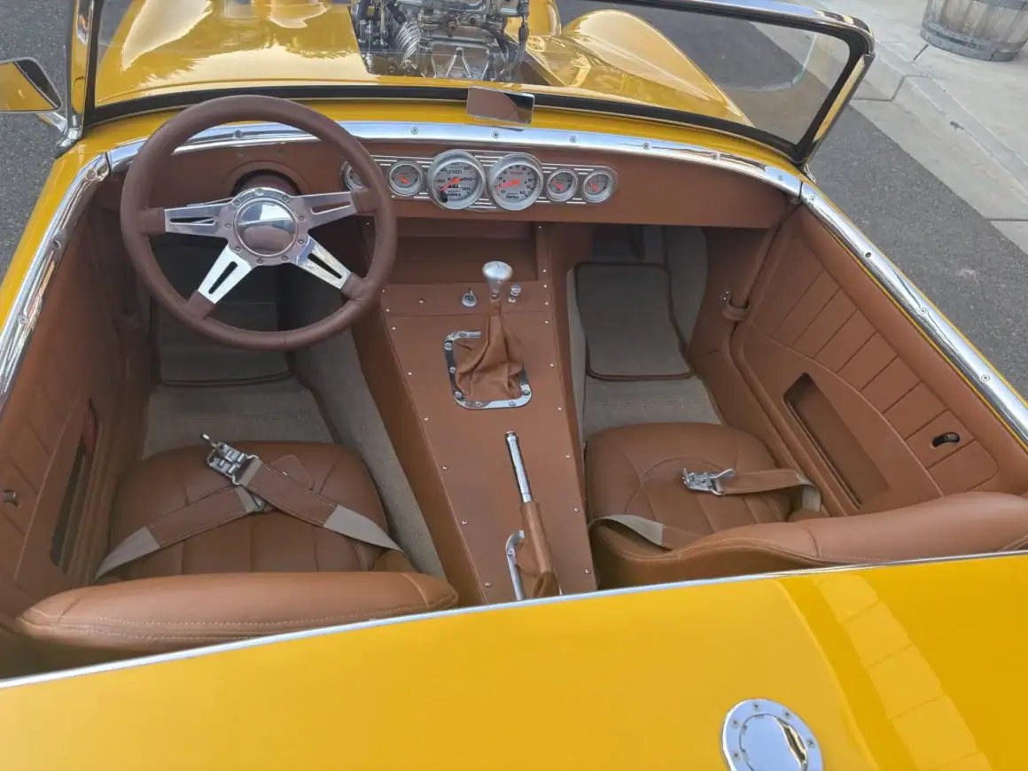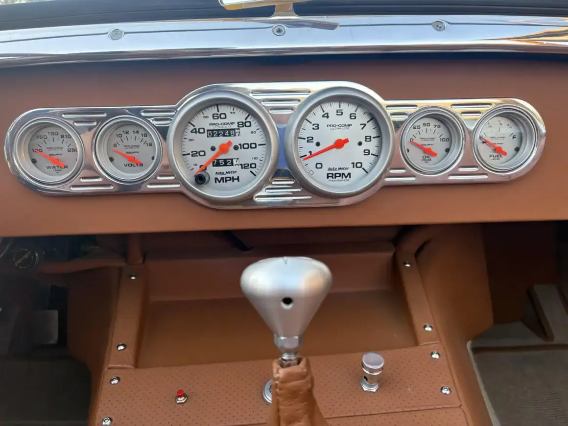 Il y a aussi une suspension AR à quatre bras “Jegs”, des combinés filetés, des jantes en acier 15po chaussées de pneus Hankook Ventus R-S3 en 195/50 AV et 225/45 AR. La carrosserie est dotée d’un capot à clapet en fibre de verre et d’élargisseurs d’ailes arrière de même fibre, et l’intérieur personnalisé est garni d’une sellerie en cuir beige et abrite l’instrumentation AutoMeter Pro-Comp Ultra-Lite positionnée au centre du tableau de bord incluant un indicateur de vitesse de 120 mph, un tachymètre et de quoi en connaitre sur la température de l’eau, la tension, la pression d’huile et le niveau de carburant… Voilà…