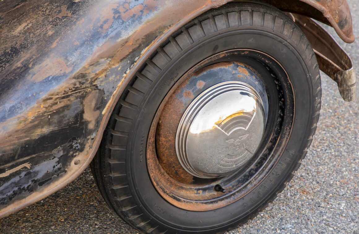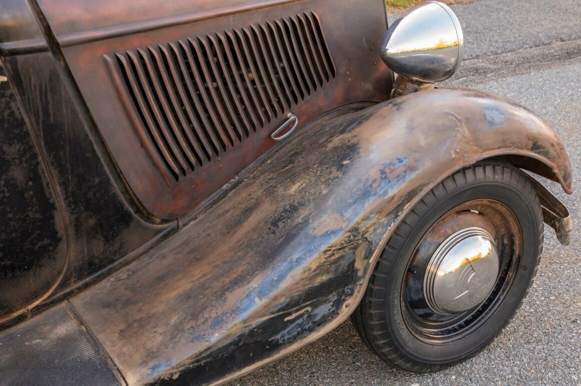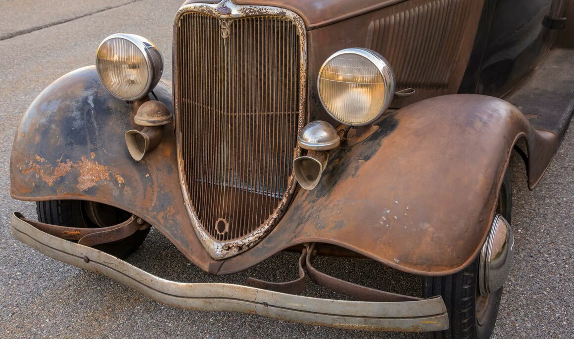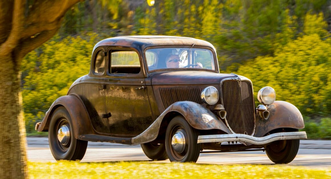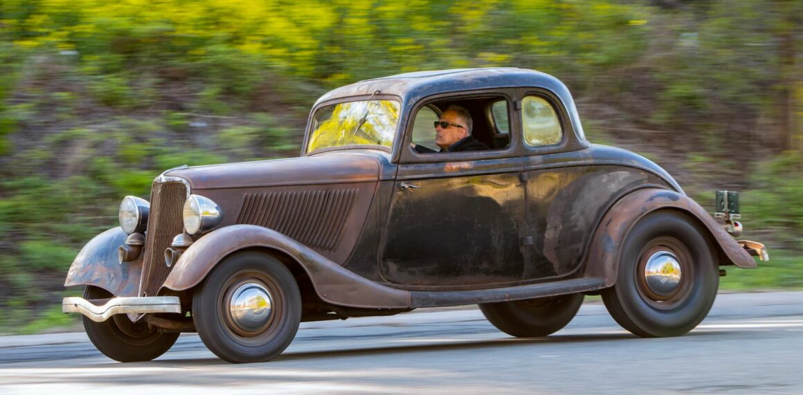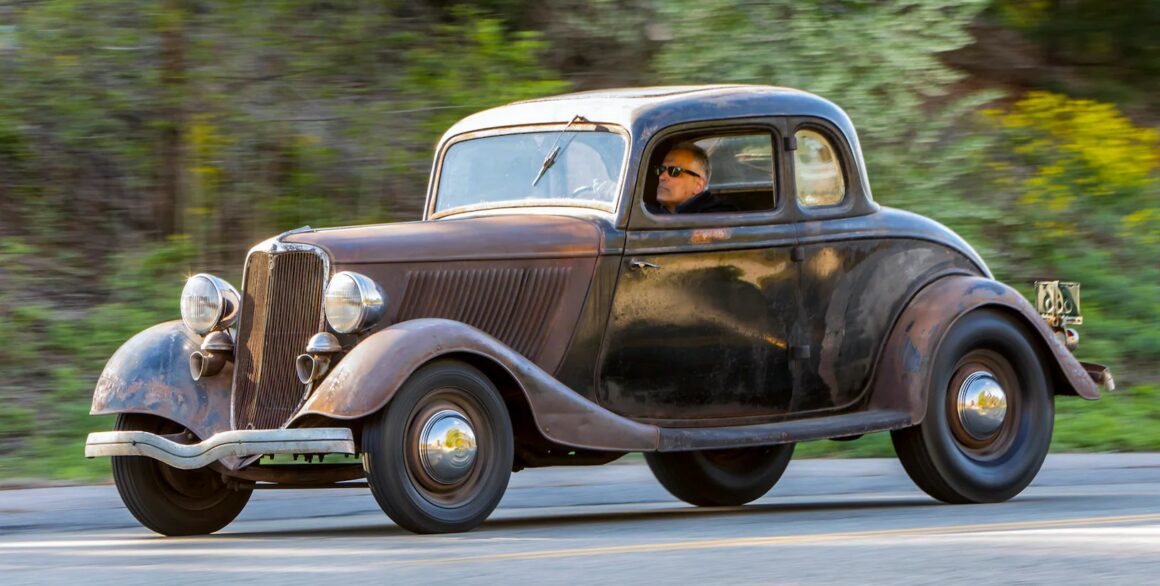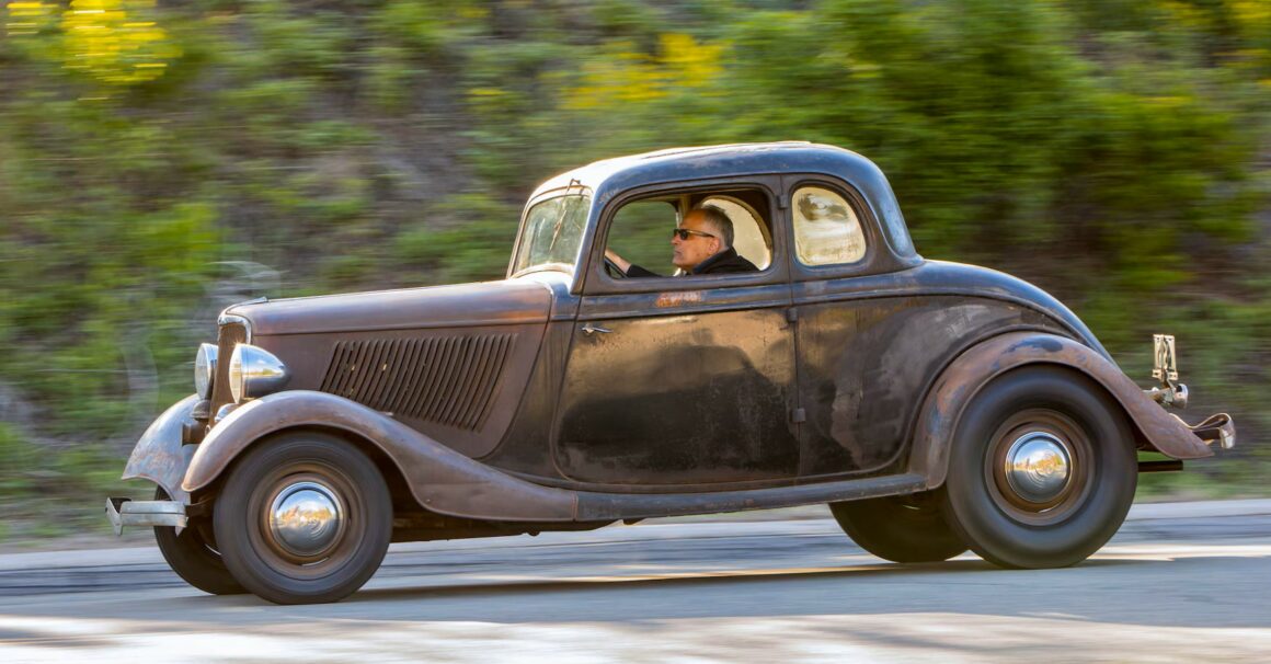 Un plaid vert épouvantable accentuait les tissus des portes, vert sale. Il s’agissait en effet d’un véritable Rod survivant d’avant-guerre… J’ai direct cru que je découvrais le tombeau de Ramsès… Le fait que la voiture portait encore toute sa tôle d’usine, qu’elle était entièrement équipée de ses pare-chocs d’origine et qu’elle n’était pas Top-Choppée était un miracle. Partout où je regardais, il était usé et en lambeaux aux bons endroits, ce qui lui donnait une personnalité que peu de gens pouvaient comprendre. Les voitures anciennes racontent des histoires et ce coupé n’était pas différent. Ses histoires sont apparues dans les zones où de vieilles carrosseries métal sur métal avaient été commencées, et dans les restes d’une collision frontale mineure.