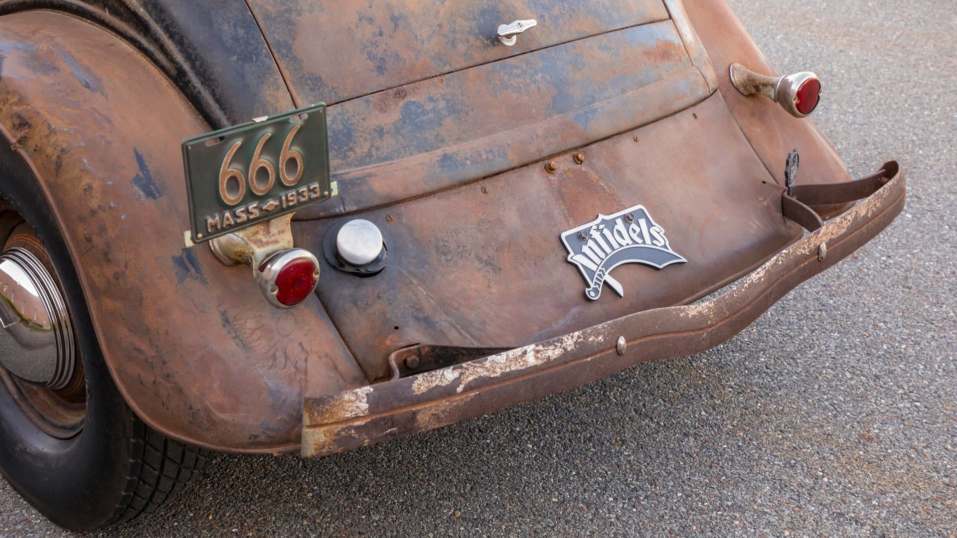 Il avait une histoire à raconter. La première chose que j’ai remarqué, c’est la plaque d’immatriculation torturée… Vous croyez que j’allais découvrir une immatriculation Egyptienne Pharaonique ? Ben non, quoique le propriétaire s’avérait branché en Egyptologie… Il s’est de plus avéré être l’un des plus grands experts, collectionneurs de Hot Rods dans le monde d’aujourd’hui, et je l’ai écouté tranquillement raconter l’histoire. Devant mes yeux se trouvait un Hot Rod survivant vraiment rare. Cet ex-coupé d’affaires Ford à cinq fenêtres V8 de 1933, avait été un des premiers Hot Rod d’avant-seconde-guerre-mondiale, puis s’était transformé en un des premiers Hot Rod de l’année 1945 et suivantes jusqu’en 1949 avant d’être endormi pendant 75 ans, mon âge…