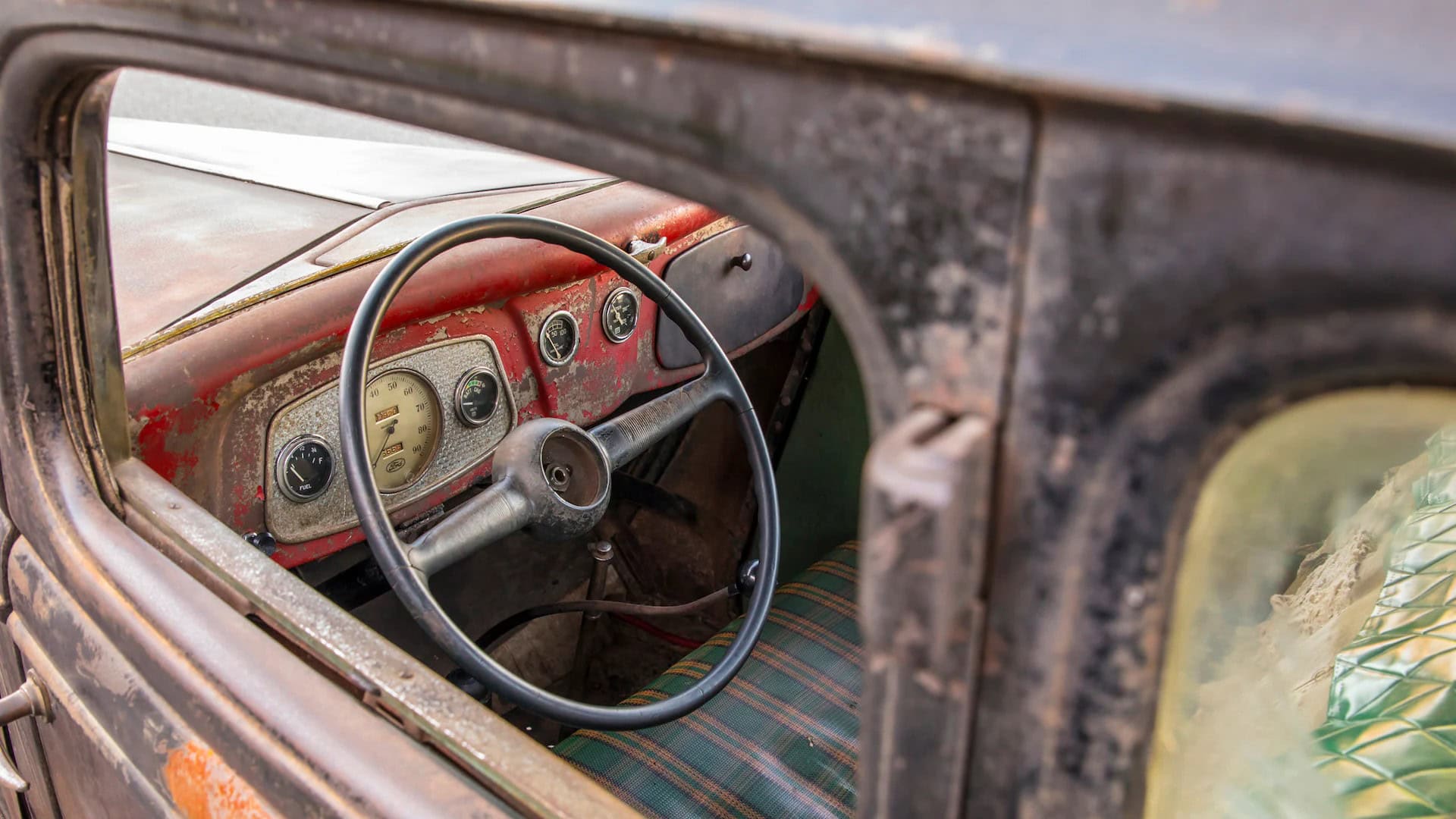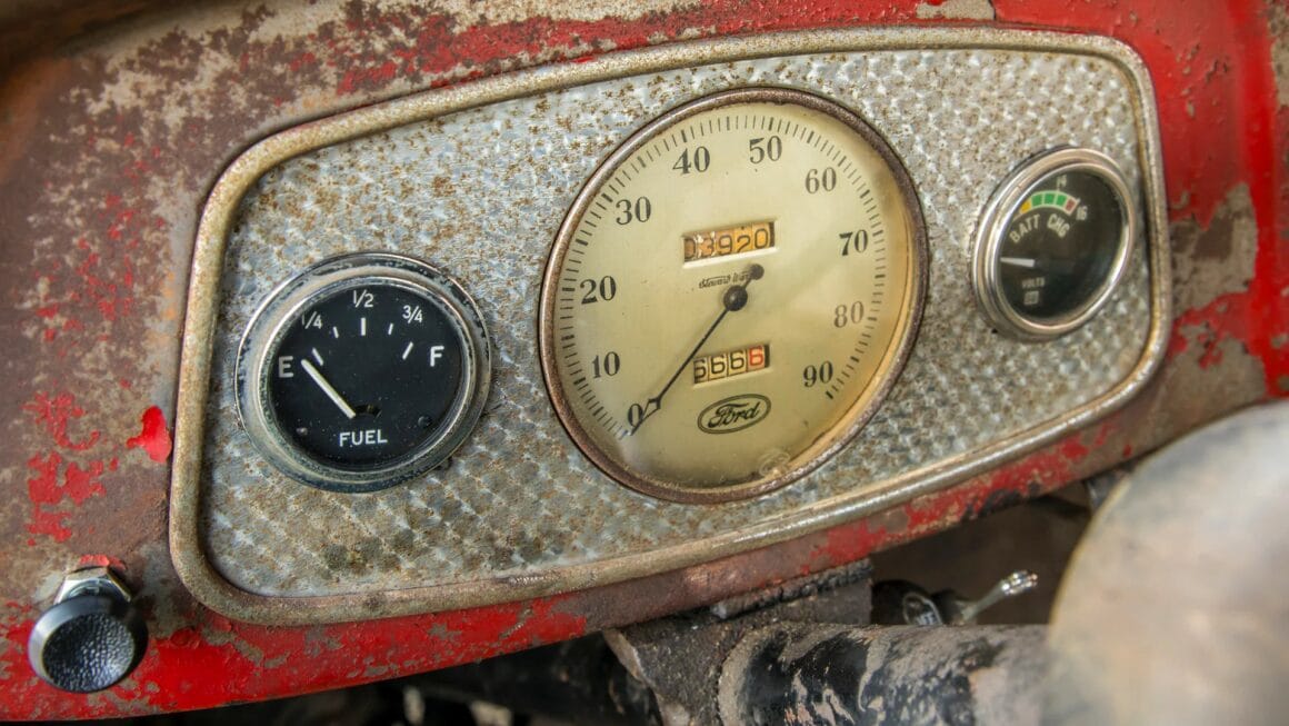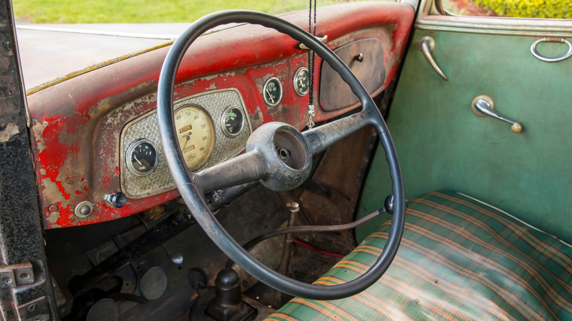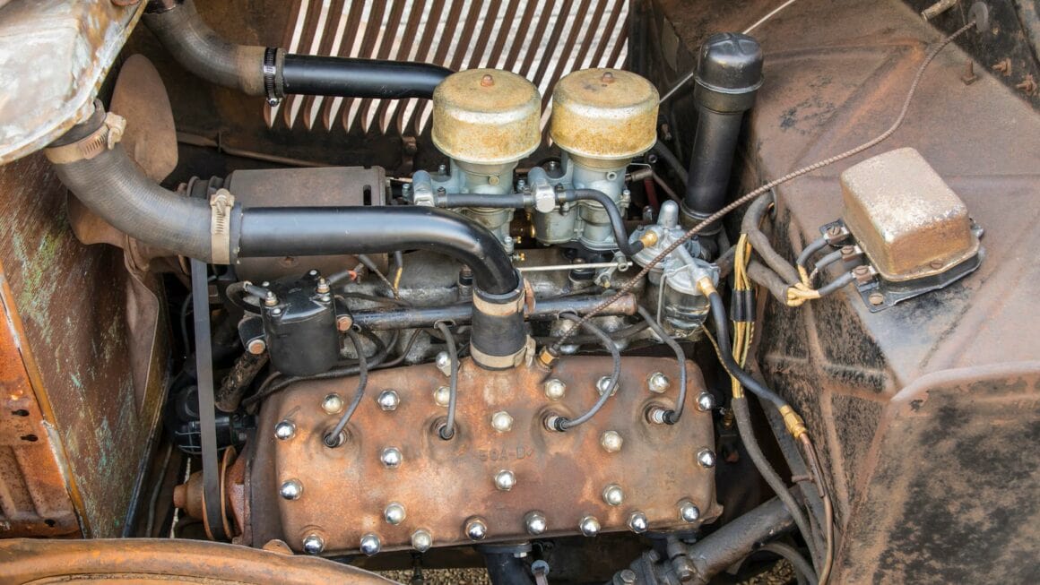 Présages incomparables et détresse irrésistible m’ont envahi… Lorsque qu’on m’a dit que le coupé avait été immatriculé pour la dernière fois en mai 1949, une lumière a semblé soudainement planer au-dessus de la voiture. C’était le mois et l’année de ma naissance ! Peut-être que c’était le destin qui me rapprochait de ce vieux Hot Rod. En soulevant le capot, j’ai découvert un V8 Flathead entre les longerons, un authentique Ford AB d’époque ! L’ouverture de la porte du conducteur solide comme le roc a révélé des détails obsédants tels que des moulures de garnitures chromées patinées, un tableau de bord peint en rouge écaillé rempli de compteurs et d’accessoires dépareillés, un volant Ford 1940 fissuré et un siège surmonté d’une housse Bolta-Quilt vintage…