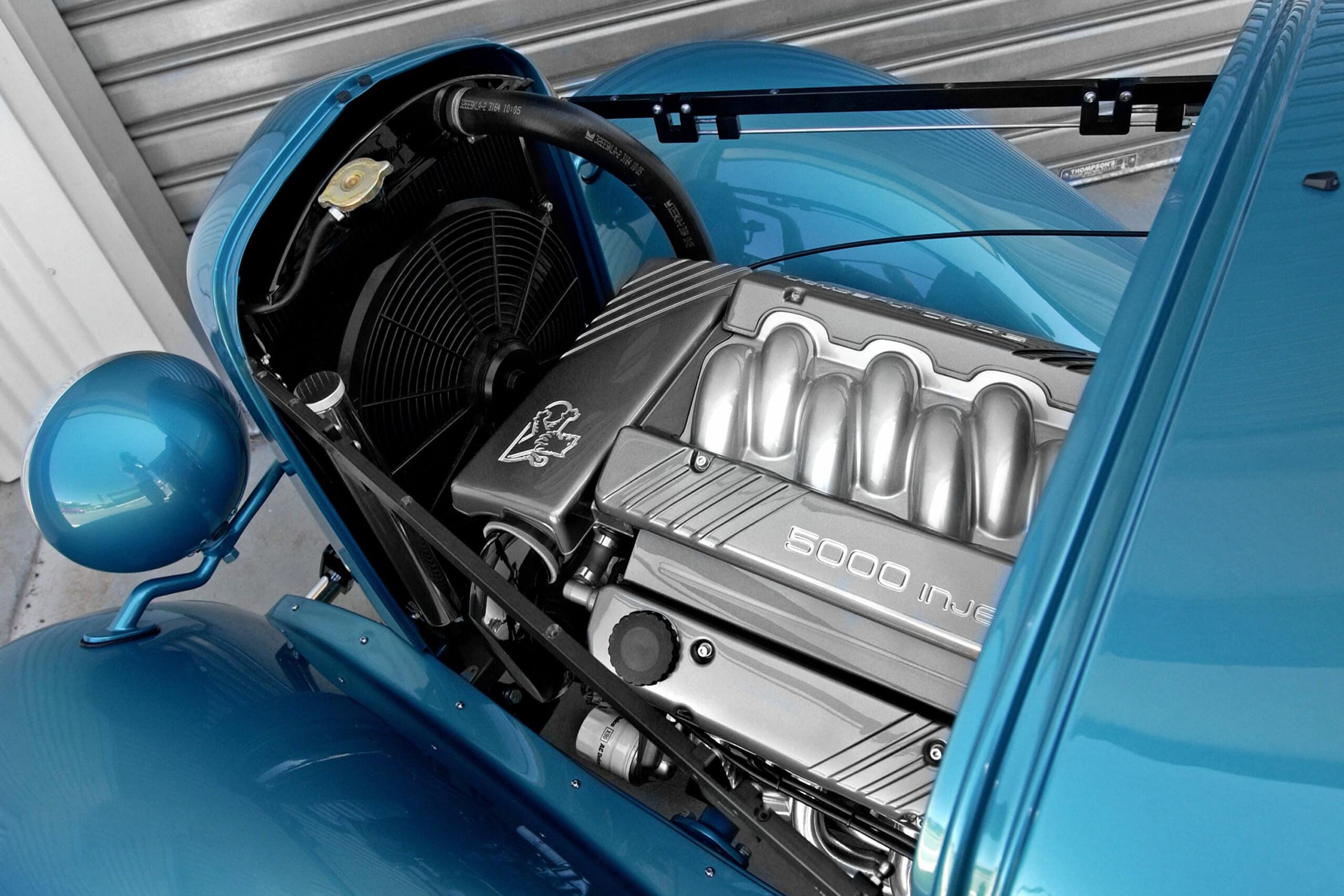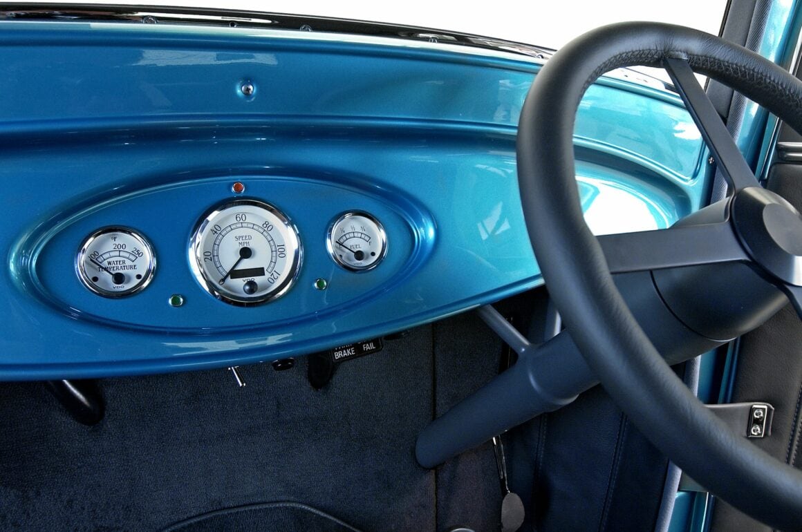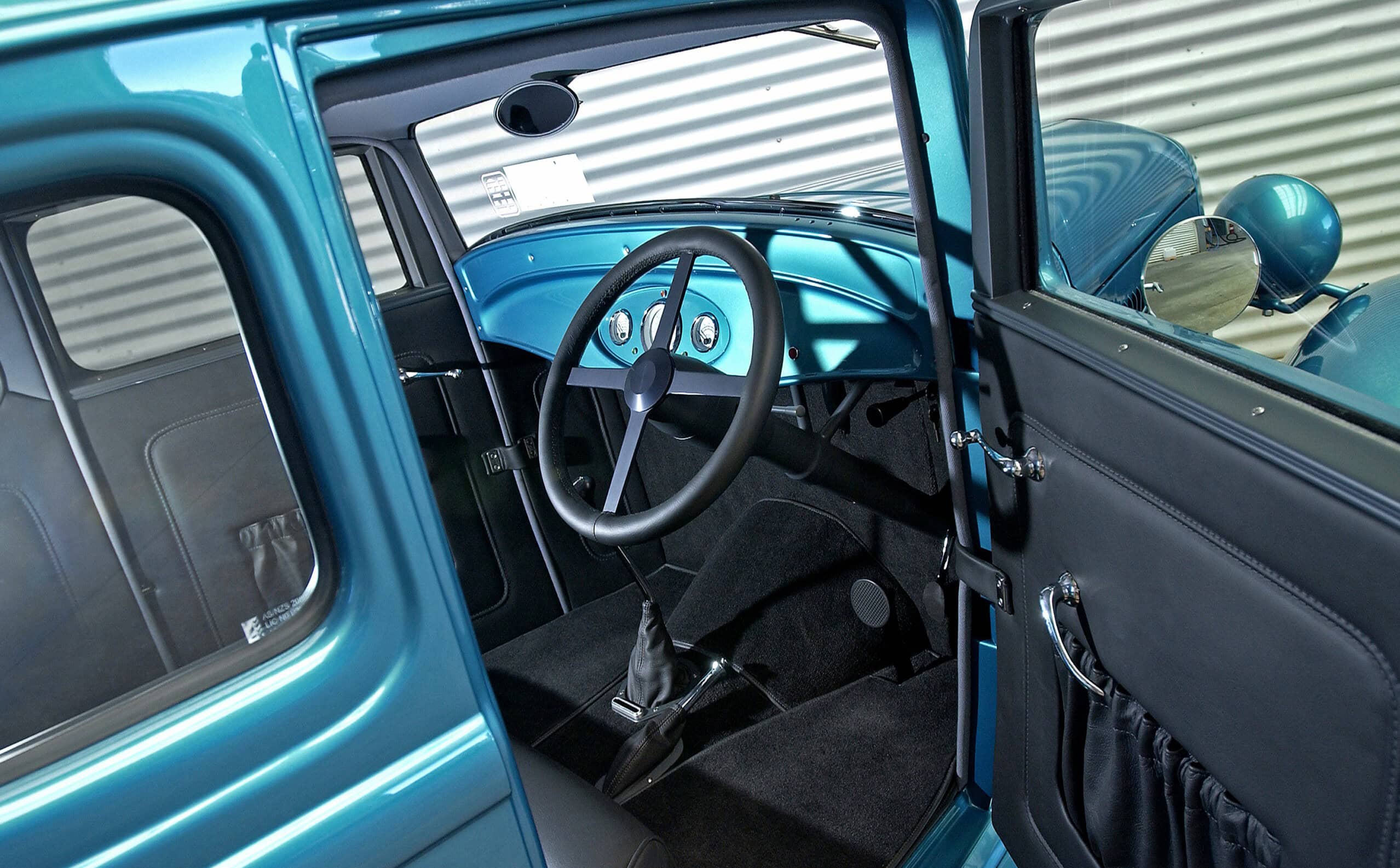 Alors qu’à peu près tout ce qui se déplaçait sur le Rod était broyé en douceur, seuls le boîtier de différentiel et le collecteur d’entrée dont résisté à ce traitement, rien n’a jamais été aussi beau ! Ron a demandé au peintre Darred Bodyworks de réaliser une perfection en PPG Teal Glow après que Ron ait terminé avec la carrosserie. Tout a été peint durant le processus de pulvérisation, y compris le châssis, les protections et les marchepieds en acier. Lorsqu’il s’est agi de choisir des jantes, Ron a évité les alliages billettes et a opté pour les traditionnelles American Racing Torq Thrust II. Avec des six po de large AV portant des Goodyear Eagles 195/50/15, et des 8po AR avec des 225/65/15, il offre juste assez de râteau à la position du Coupé. L’intérieur imite le style original de 1932, mais le dépasse à la fois en qualité et en fonctionnalité.