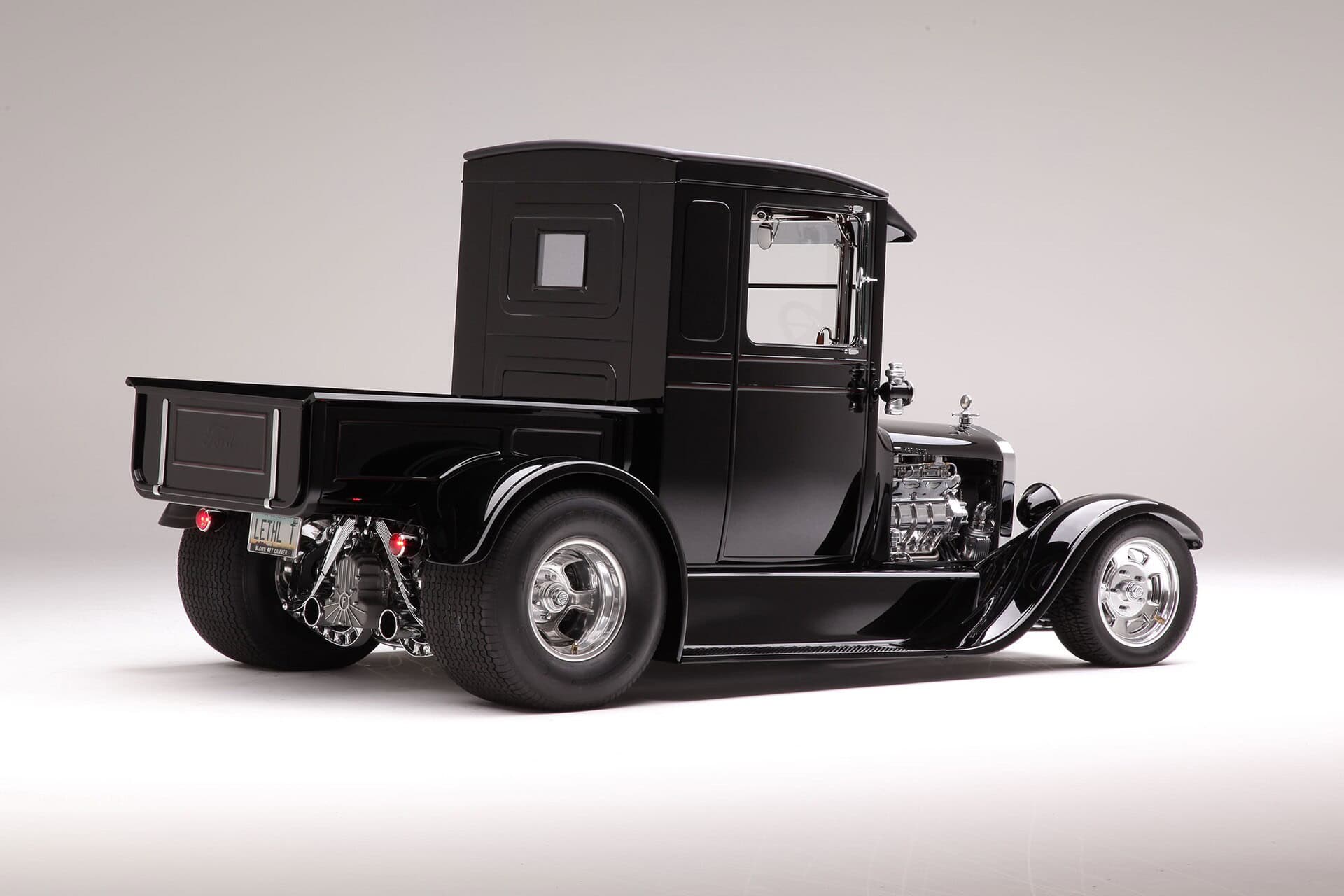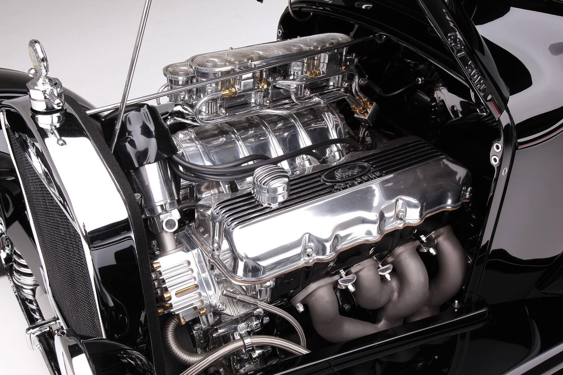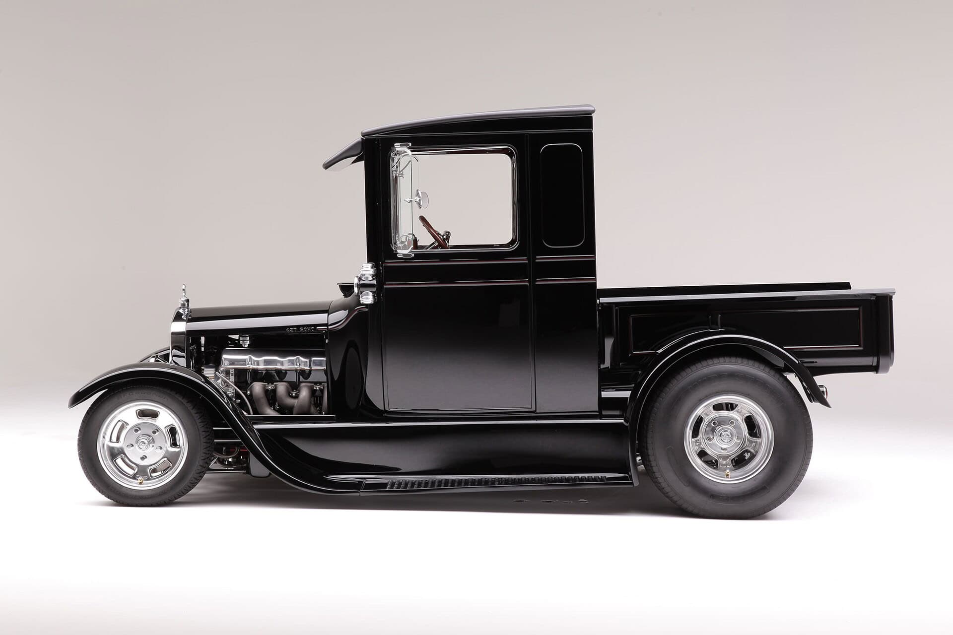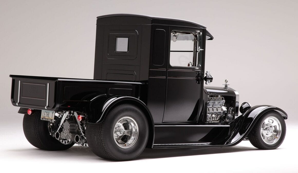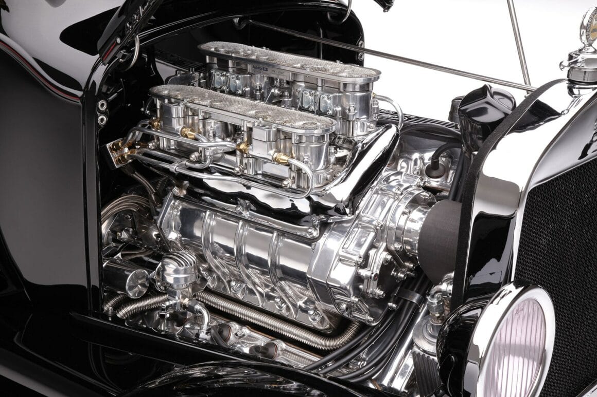 Cela pour créer chaque persienne une à la fois, qui ont ensuite été soudées en place. Une grande partie de la caisse est également été fabuleuse, avec la longueur totale raccourcie de 3 pouces après les ailes, une porte avant rabattable à double paroi (juste derrière la cabine) cache l’accès au radiateur, au réservoir de carburant et au réservoir d’huile (pour le carter sec du moteur). Pour finir le lit/benne du PU, ont été ajoutées des lattes de faux marbre. Larry, ainsi que Paul LaFortune (un Canadien) de Empty Pockets Rod Shop, Scott Workman et Greg et Cindy Sterkenberg de Coyote Custom ont tous travaillé à la préparation de la carrosserie et des pièces du T avant que LaFortune et les Sterkenberg ne peignent tout en PPG Black.