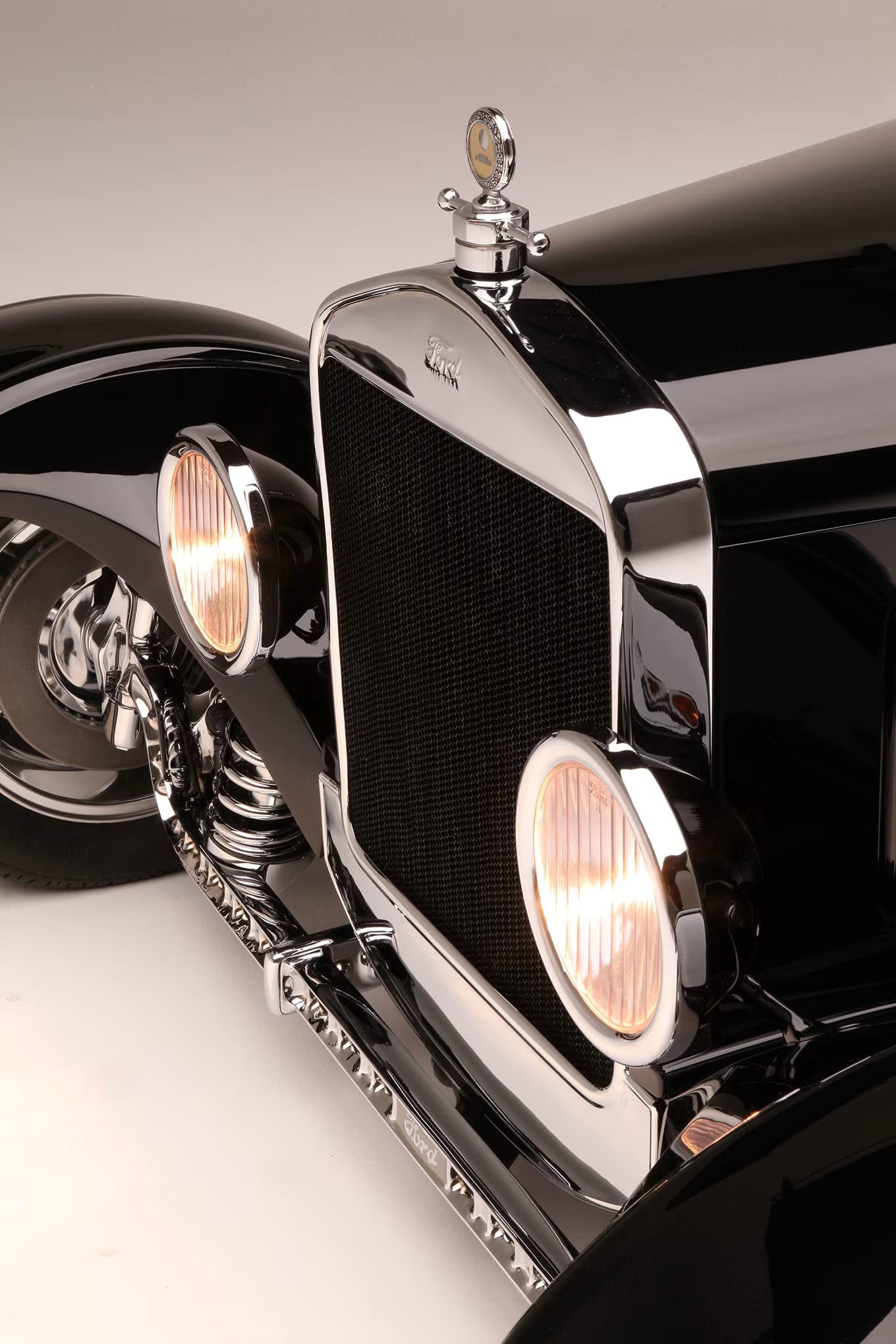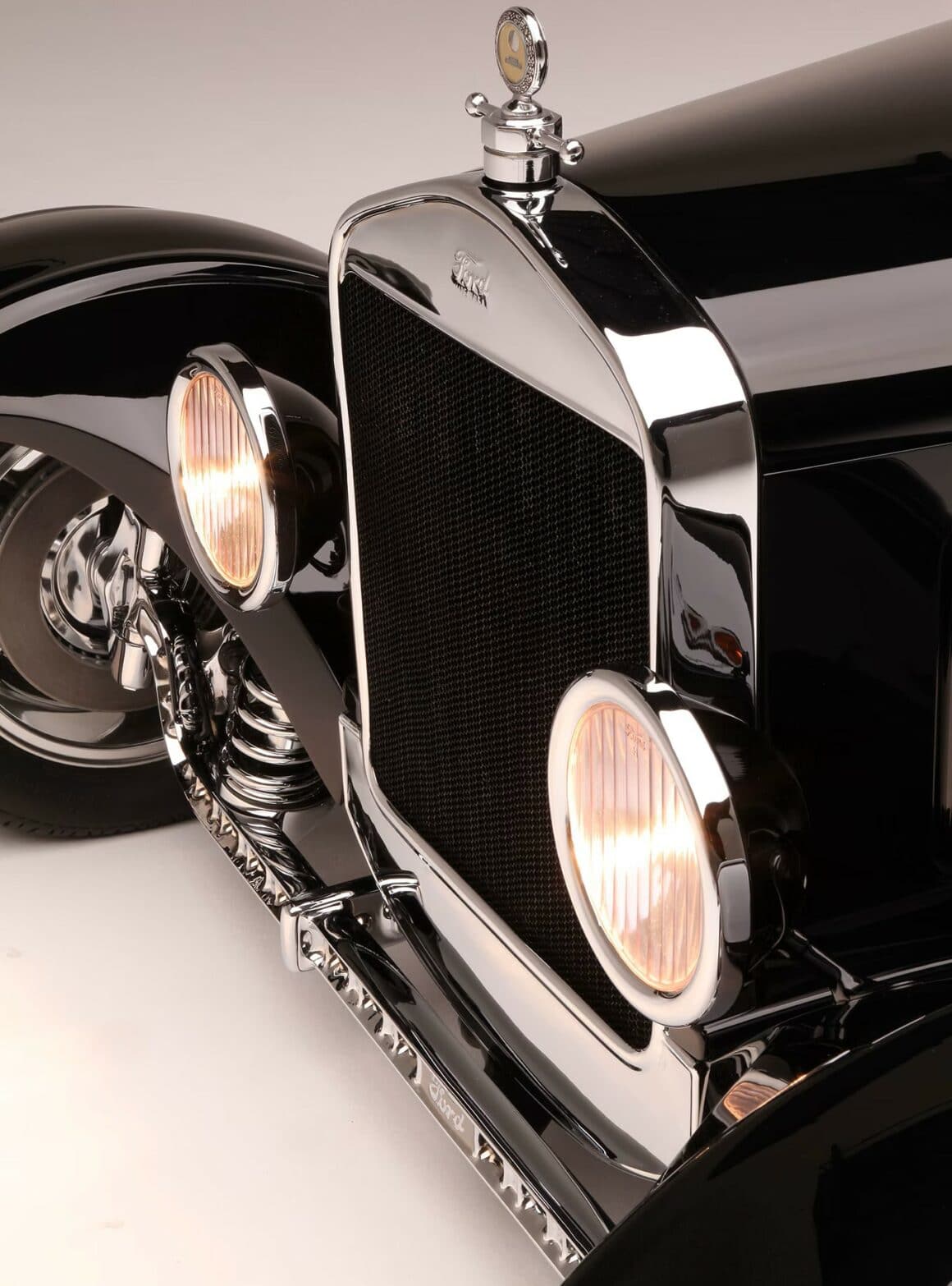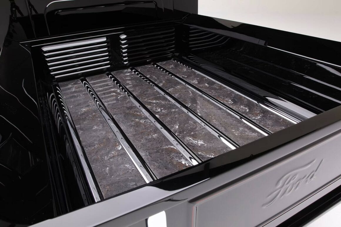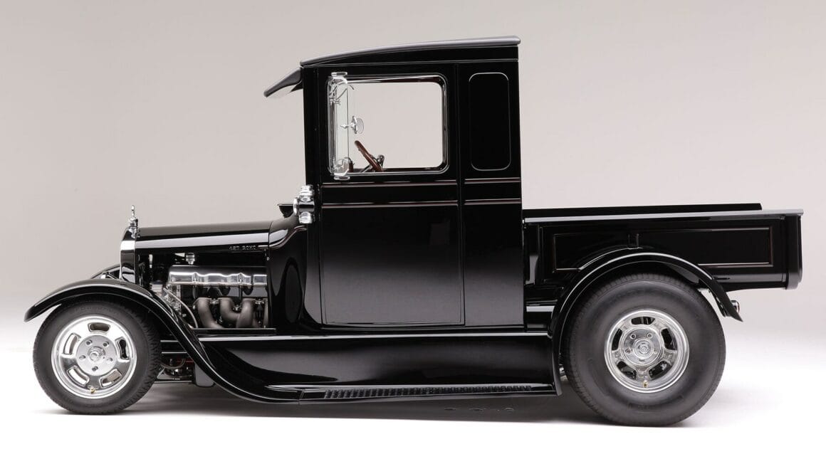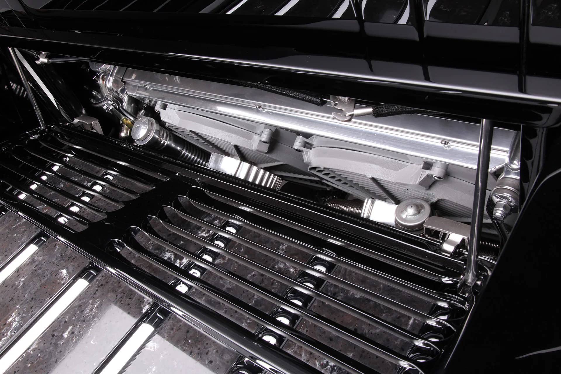 Cela pour créer chaque persienne une à la fois, qui ont ensuite été soudées en place. Une grande partie de la caisse est également été fabuleuse, avec la longueur totale raccourcie de 3 pouces après les ailes, une porte avant rabattable à double paroi (juste derrière la cabine) cache l’accès au radiateur, au réservoir de carburant et au réservoir d’huile (pour le carter sec du moteur). Pour finir le lit/benne du PU, ont été ajoutées des lattes de faux marbre. Larry, ainsi que Paul LaFortune (un Canadien) de Empty Pockets Rod Shop, Scott Workman et Greg et Cindy Sterkenberg de Coyote Custom ont tous travaillé à la préparation de la carrosserie et des pièces du T avant que LaFortune et les Sterkenberg ne peignent tout en PPG Black.
