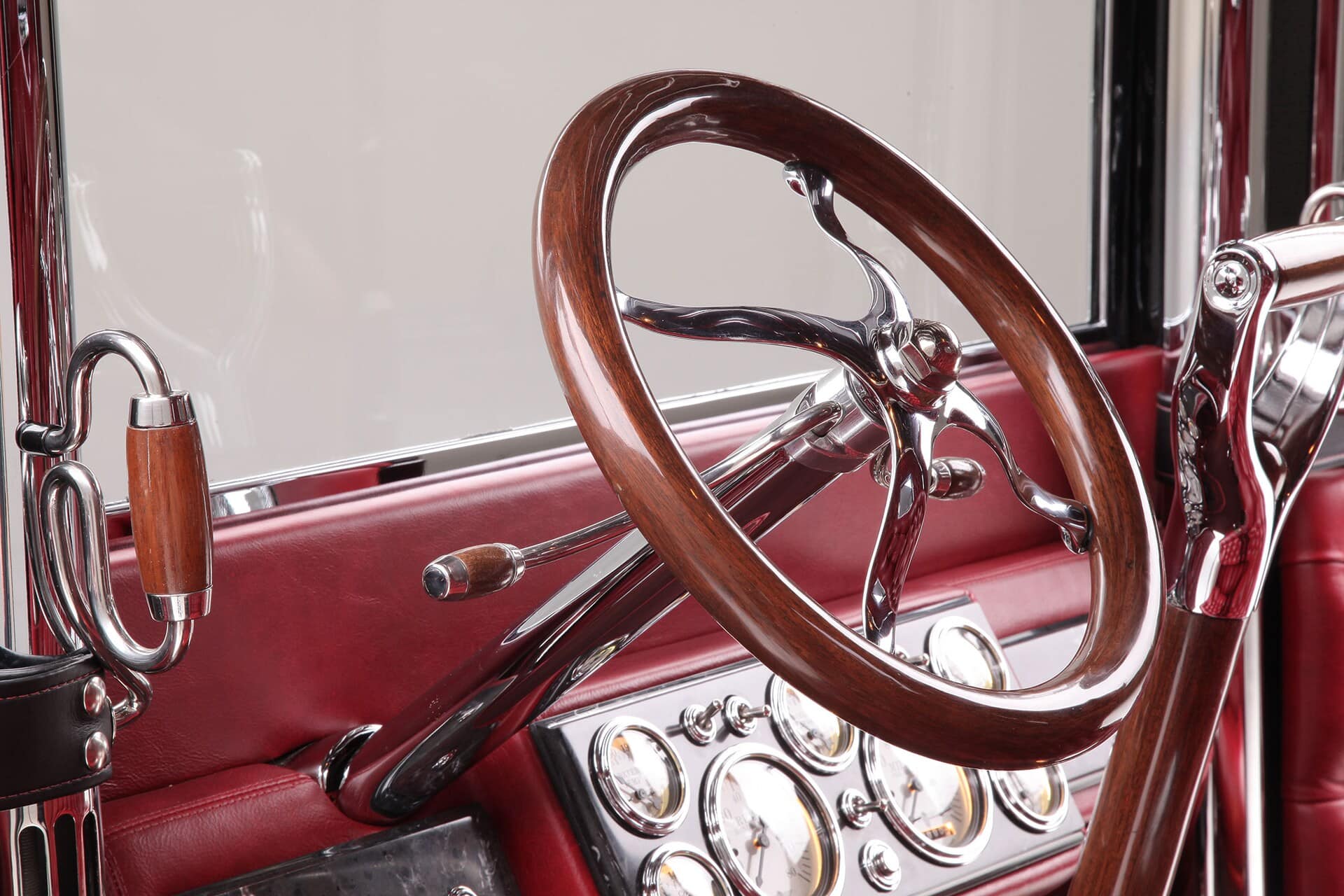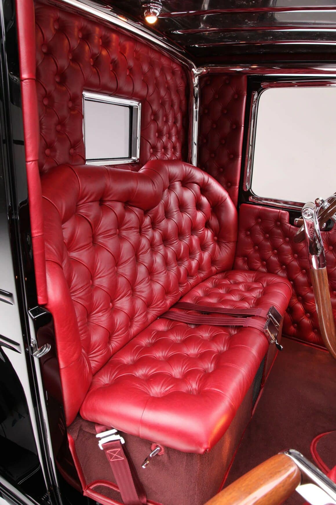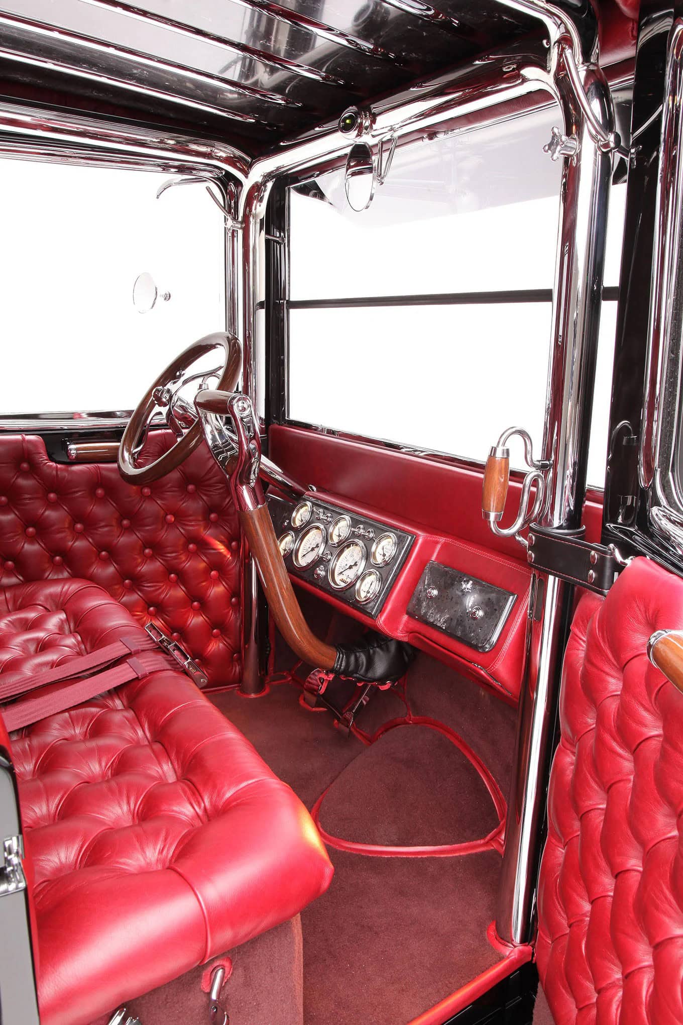 Elles s’actionnent en déplaçant la poignée de porte intérieure… Pour se mettre davantage au défi, Larry a également affleuré les portes. Bien que tout semble d’origine à première vue, il y a eu des modifications de carrosserie qui incluent l’extension des portes de 3 pouces ainsi que dans la cabine. Les ailes avant ont été élargies de 4 pouces (les arrières ont été élargies de 4,5), les marchepieds ont été élargis de 2 pouces et le tablier “anti-éclaboussures” a été allongé de 8 pouces. Et ceux qui connaissent le modèle T découvriront qu’il n’y ait pas de boulons, de vis et rivets à l’extérieur. La capuche a également été fabriquée à la main par Larry et rendue plus longue de 2 pouces que la crosse, il a également fabriqué son propre tampon et sa propre matrice.