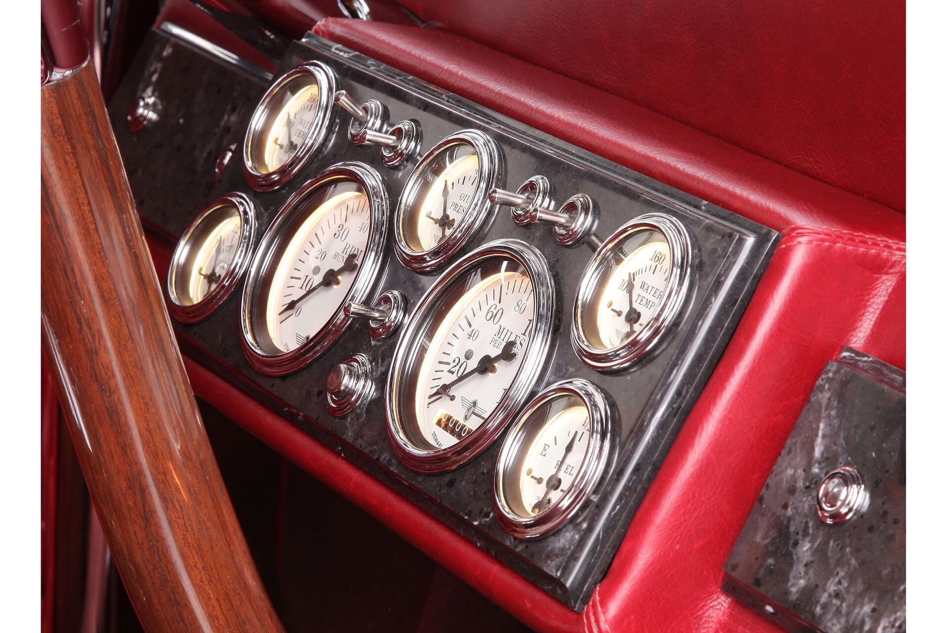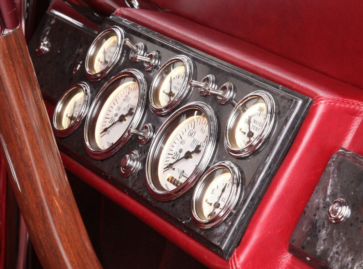 Oui, celle qui est la plus proche du tableau de bord, vous verrez trois fentes verticales de chaque côté de la cage, qui sont des évents pour le système de climatisation et chauffage Vintage Air que Larry a plombé pour passer à l’intérieur du tube. Larry a également fabriqué des tampons et des matrices pour les moulures de garniture de la porte, et le cadre du pare-brise (qui correspond à la légère courbe du pare-brise d’un côté à l’autre. Il n’y a pas de boulons ou de rivets visibles. Même le pare-soleil rembourré en ultra-cuir n’a pas de coutures visibles. Larry a fabriqué son propre insert de compteurs pour le tableau de bord qui abrite sept classiques Stewart-Warner. Un kit de câblage Painless Performance Product traverse tout le véhicule.