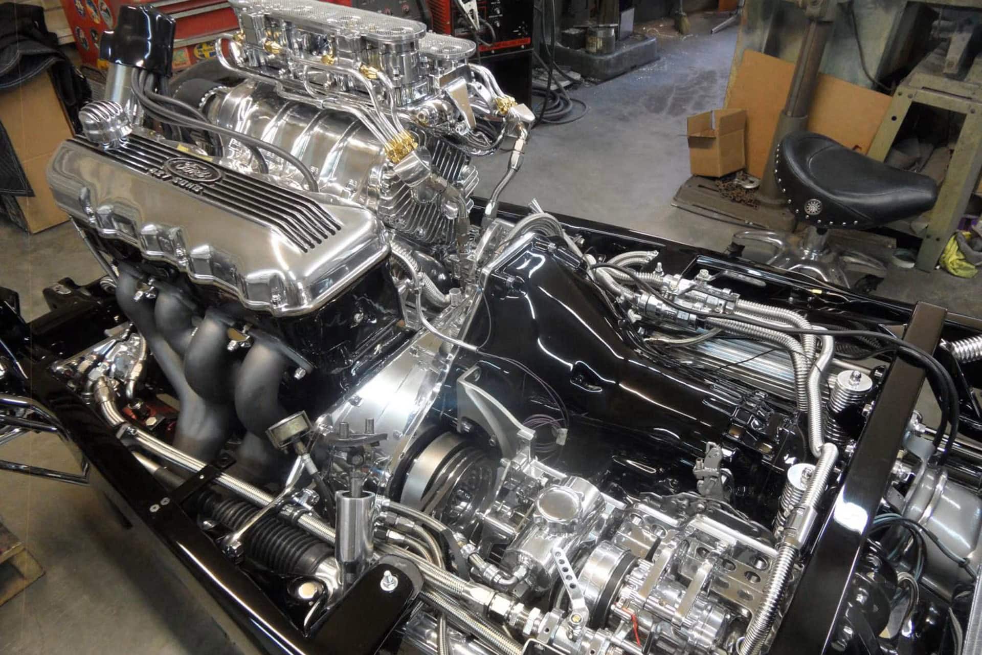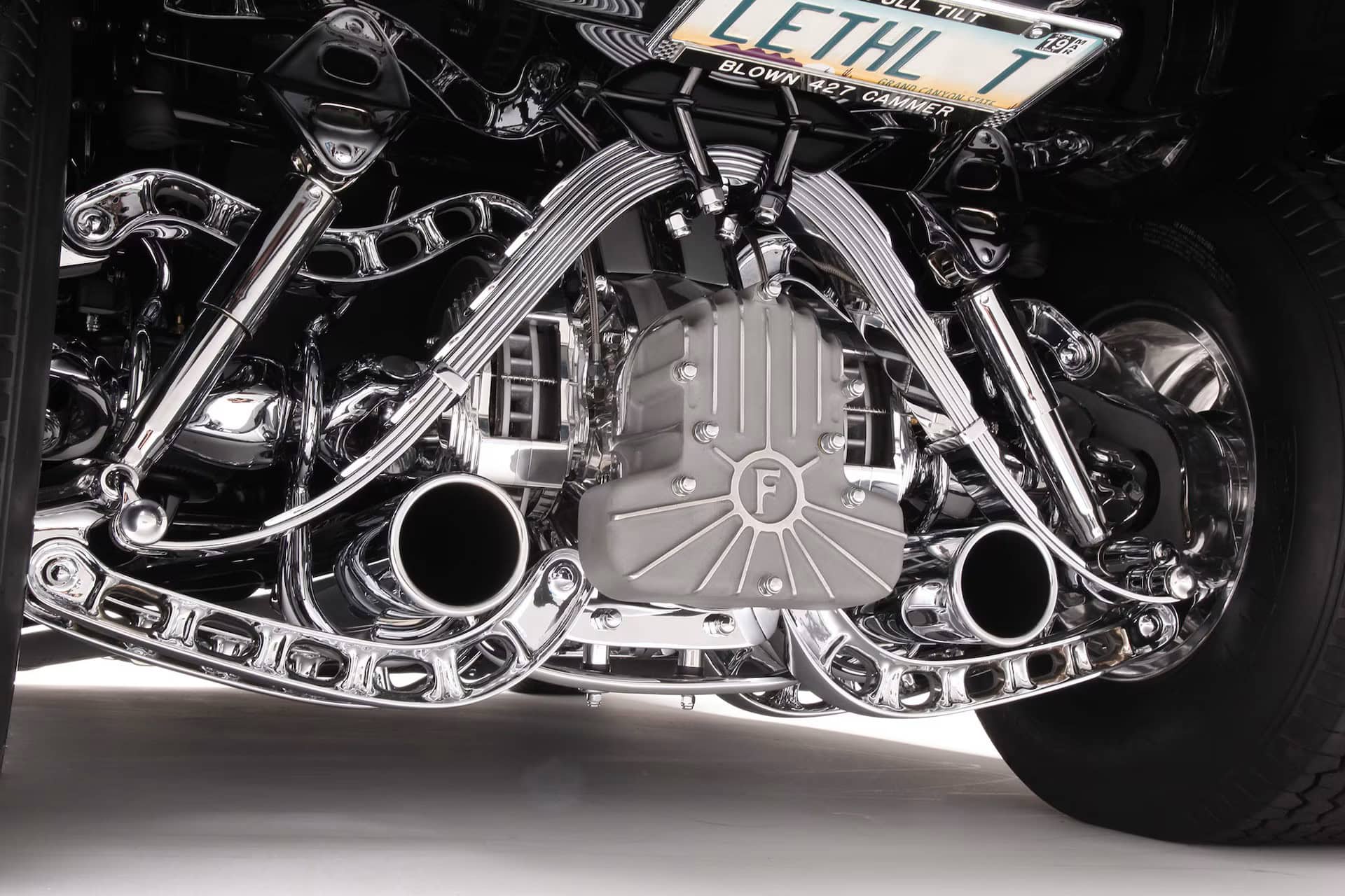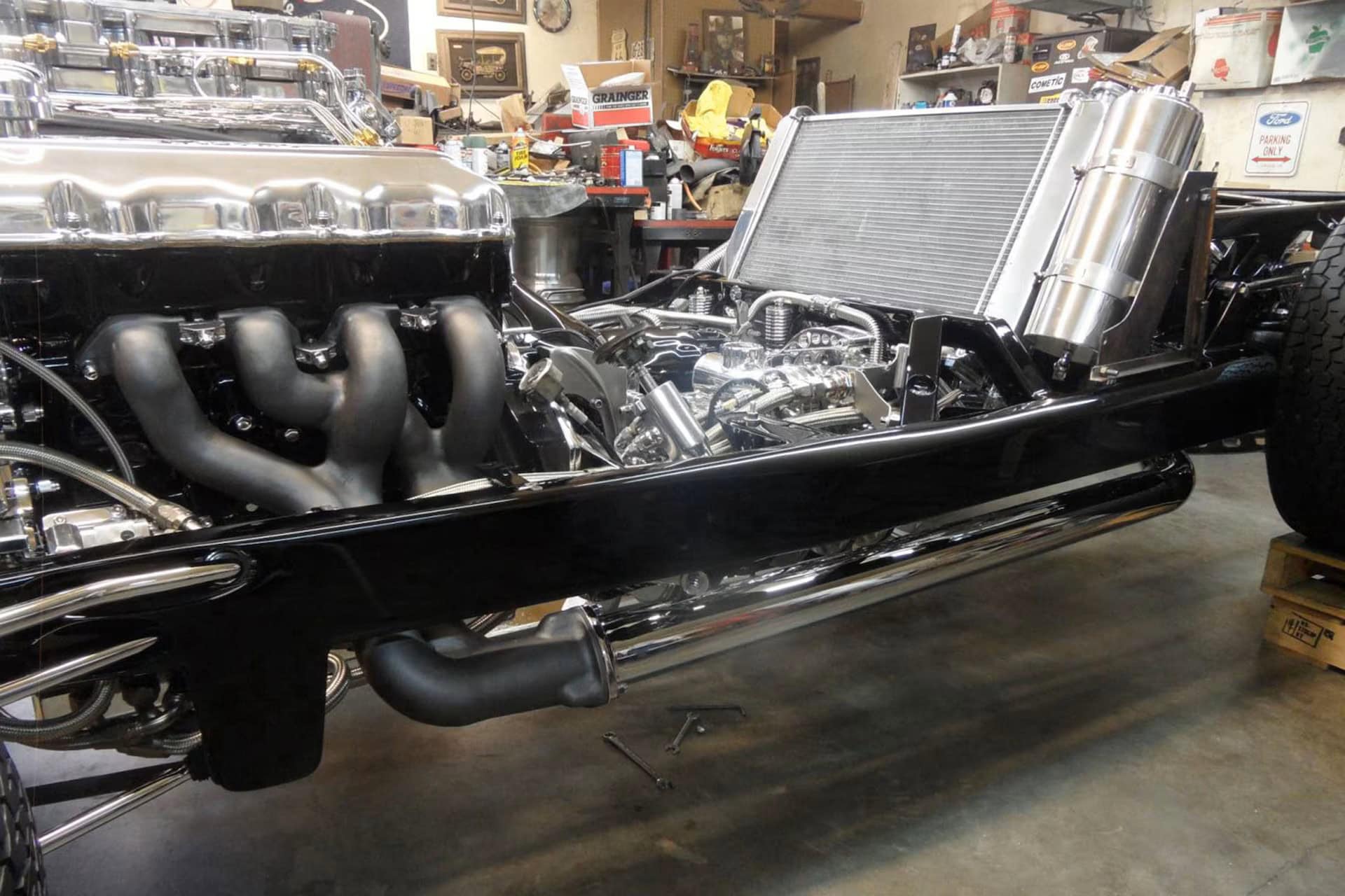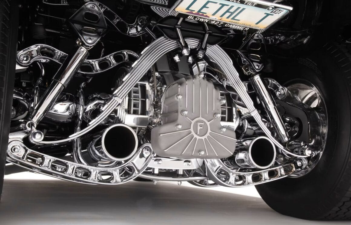 Le T roule sur des pneus BFGoodrich (respectivement en 225/50R-15 et 650 1/2-15) qui enveloppent des jantes Halibrand de 15 po. L’attraction principale de cette œuvre d’art roulante est, bien sûr, la transmission, qui est non seulement époustouflante avec sa liste de pièces, mais aussi la façon dont tout a été disposé. Parce que Larry a intégré le moteur dans le châssis du modèle T… D’autres considérations ont dû être prises en compte, telles que le déplacement du démarreur, l’utilisation d’un arbre secondaire pour entraîner la pompe à eau (déplacée à l’arrière du moteur) et une configuration spéciale à double ventilateur AFCO pour le radiateur, qui a lui-même été déplacé derrière la cabine…