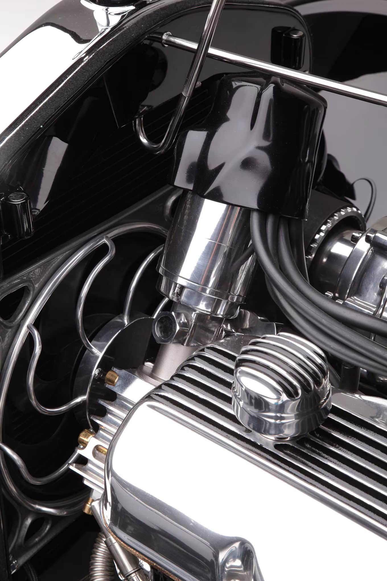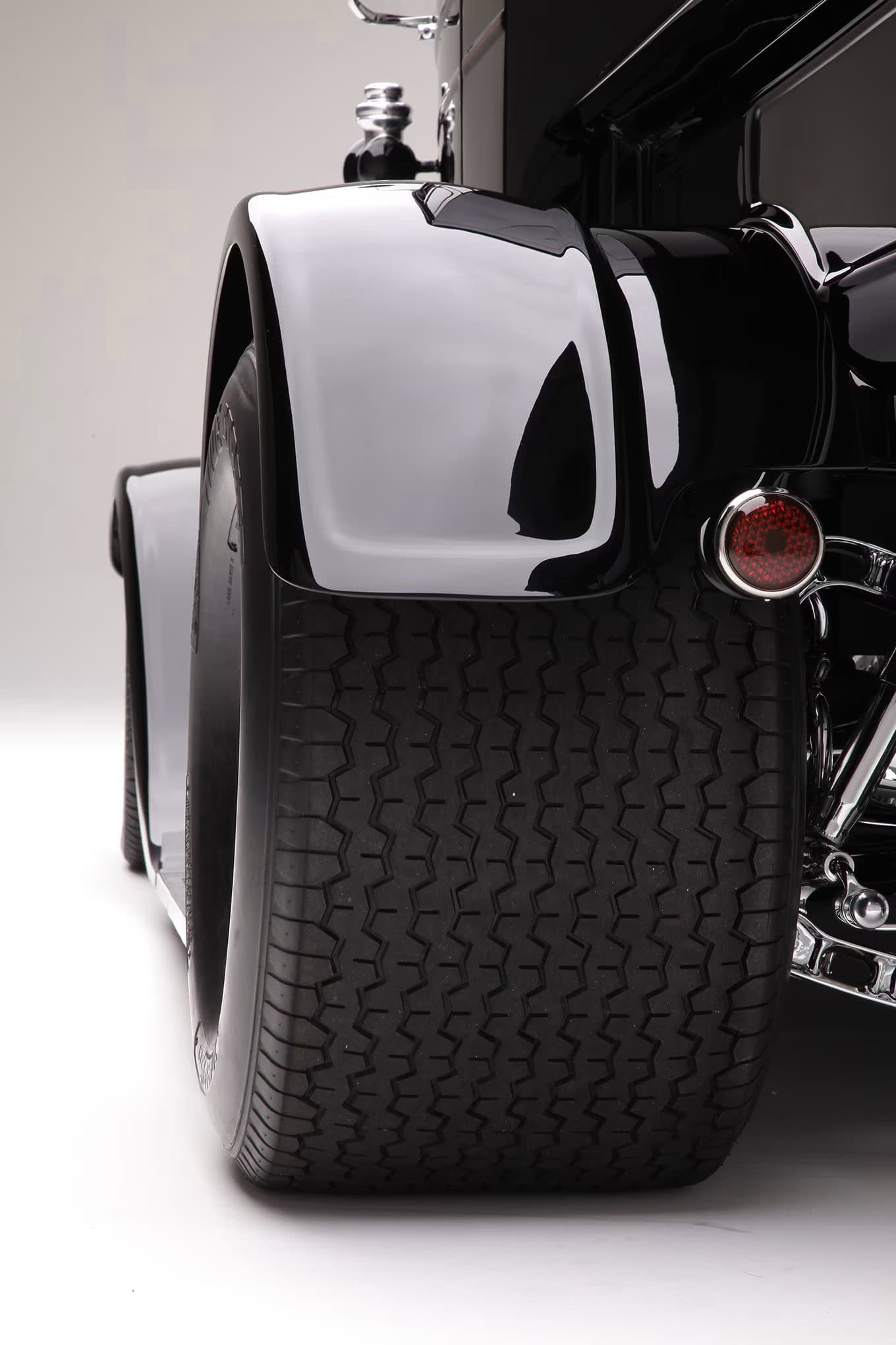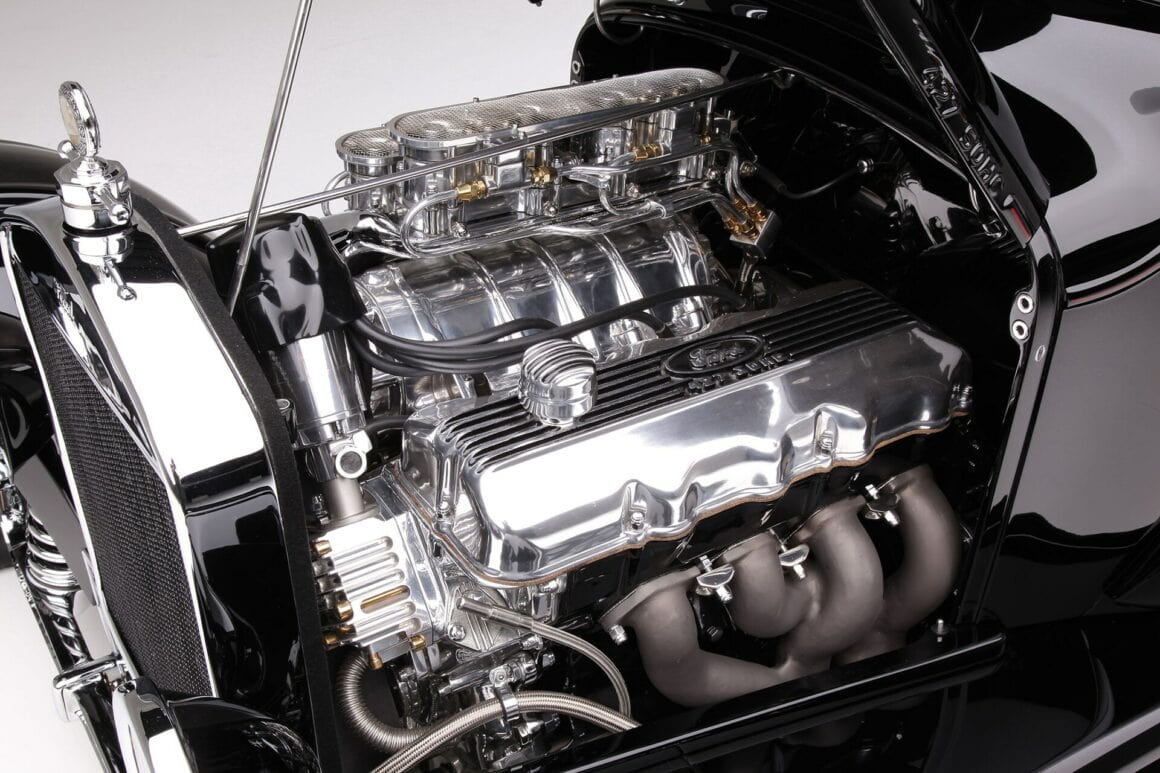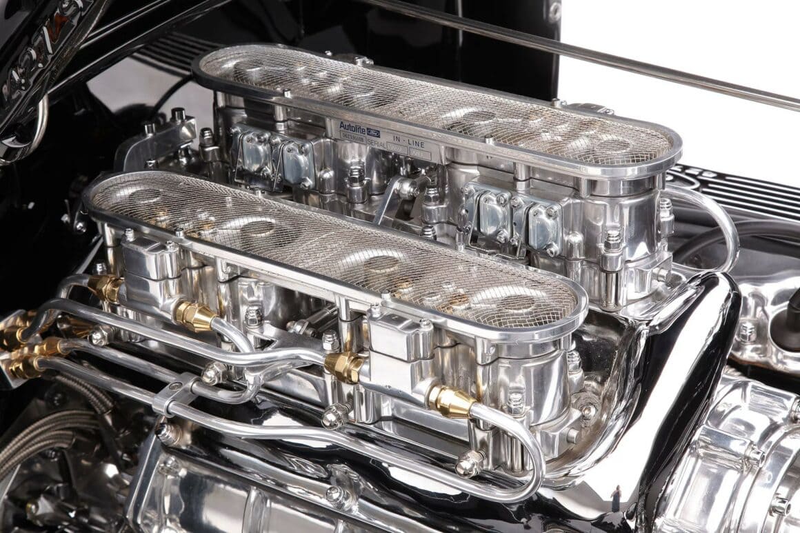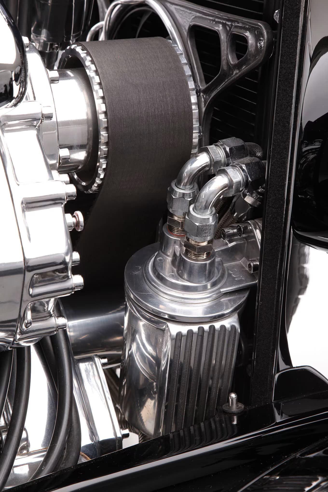 Le T roule sur des pneus BFGoodrich (respectivement en 225/50R-15 et 650 1/2-15) qui enveloppent des jantes Halibrand de 15 po. L’attraction principale de cette œuvre d’art roulante est, bien sûr, la transmission, qui est non seulement époustouflante avec sa liste de pièces, mais aussi la façon dont tout a été disposé. Parce que Larry a intégré le moteur dans le châssis du modèle T… D’autres considérations ont dû être prises en compte, telles que le déplacement du démarreur, l’utilisation d’un arbre secondaire pour entraîner la pompe à eau (déplacée à l’arrière du moteur) et une configuration spéciale à double ventilateur AFCO pour le radiateur, qui a lui-même été déplacé derrière la cabine…