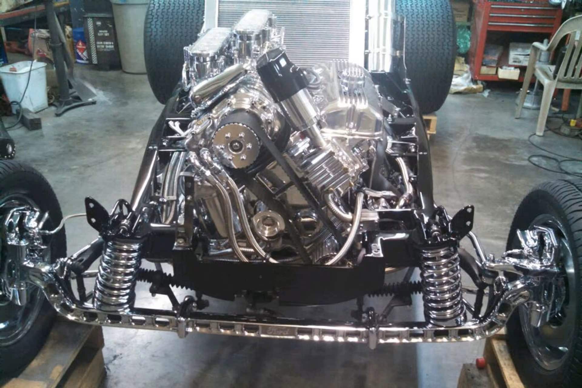 Les deux carburateurs Ford Autolite (de 1.425 cfm chacun) sont parallèles au sol. Une magnéto Vertex fournit l’étincelle à travers des fils toronnés d’argent, et Larry a également créé ses propres en-têtes à partir de tuyaux et de coudes noirs de 2,5 pouces. L’échappement se décharge dans un tube de 4 pouces qui cache des silencieux de 2 pieds de long à l’intérieur de chaque tube. La transmission, assemblée par Andy’s Trans Specialties, est une unité Ford C6 avec des planétaires à six éperons, des embrayages à bande de Kevlar, un convertisseur de décrochage TCI 3500 et un corps de soupape manuel. Il est décalé par rapport à l’axe central du châssis, plus près du côté passager du véhicule, et est entraîné par chaîne à l’arrière du moteur.