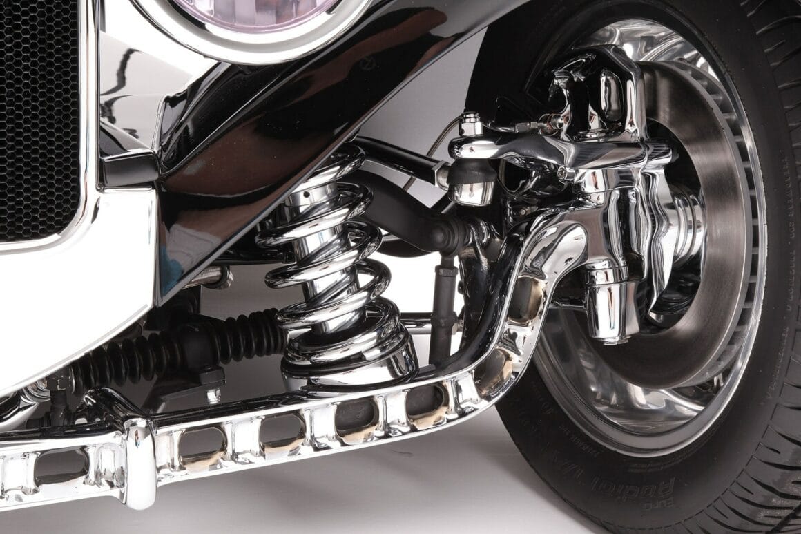 Il a tout converti en suspension arrière indépendante avec des moyeux flottants complets, des amortisseurs QA1 et une suspension airbag montée devant des demi-arbres… Pour un effet visuel, Larry a également monté un ressort transversal modèle T… Et aussi compliqué que soit le reste du véhicule, la suspension avant est également la démonstration d’ingénierie la plus complexe jamais vue en Hot Rodding… Pour l’observateur occasionnel, il semble que Larry ait installé un essieu en I de 5 pouces, mais c’est en fait beaucoup, beaucoup plus que cela. L’essieu, que Larry a usiné, est réalisé en trois parties et s’avère être la pièce maîtresse d’un ingénieux système de suspension avant indépendante. L’ensemble s’explique par le fait qu’il est divisé en deux systèmes.