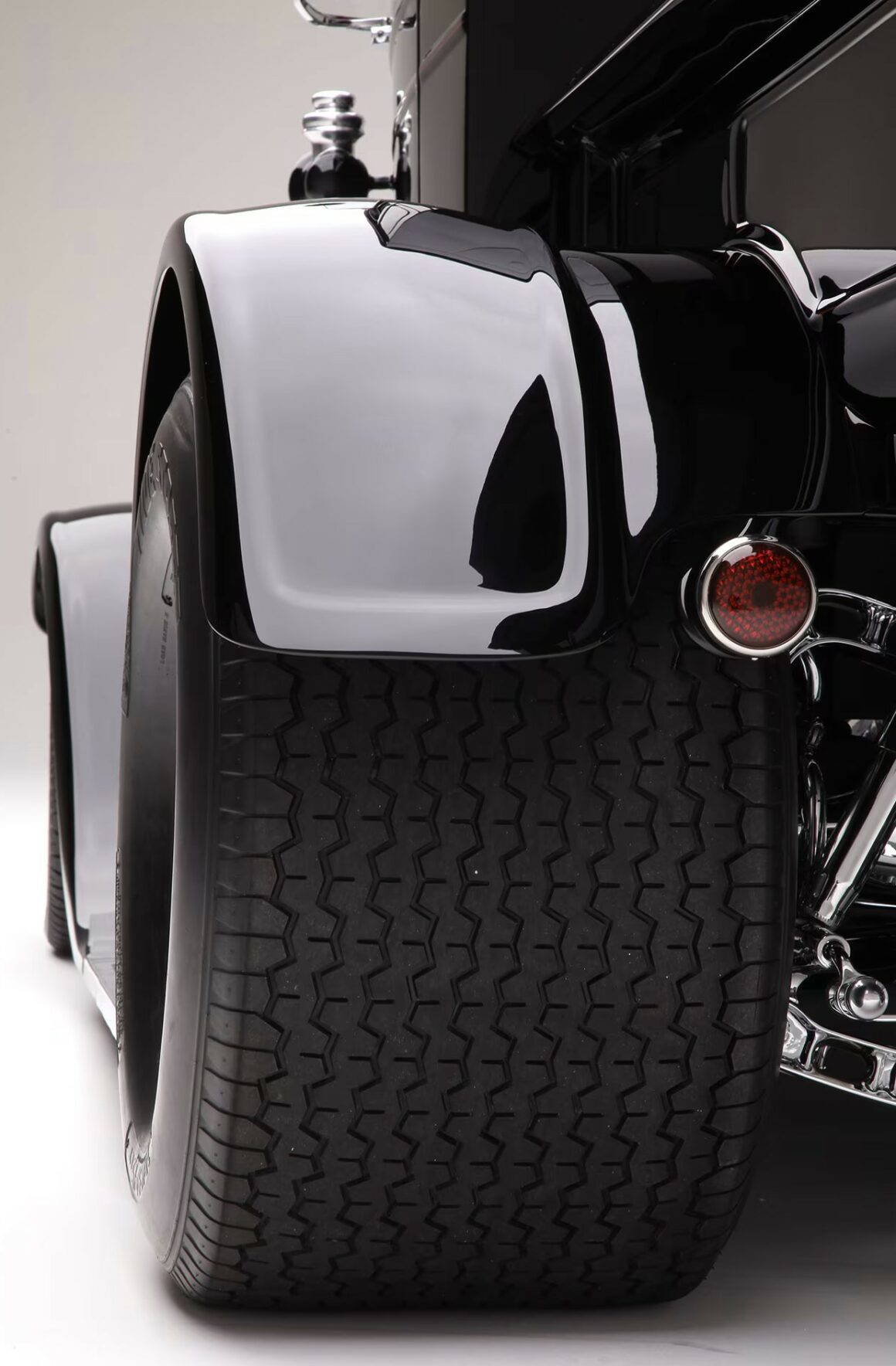 L’arbre de transmission, qui s’incline vers le milieu, est entièrement enfermé dans une coque chromée à ailettes et le changement de vitesse se tient en main via un manche courbé de pelle comportant une poignée de pelle fabriquée par Larry, le tout se connectant à la tringlerie Hurst sur la boîte de vitesses. Larry a également mis ses talents au service de la personnalisation de la carrosserie, qui se compose principalement d’une cabine fermée, avec des montants A, d’un capot et de revêtements des portes pour les voitures de tourisme T d’époque, à partir de la ceinture de caisse. Les modèles T étaient notoirement rares, donc enlever des éléments tels que les charnières des portes et les poignées ou ajouter des vitres électriques est une véritable astuce.