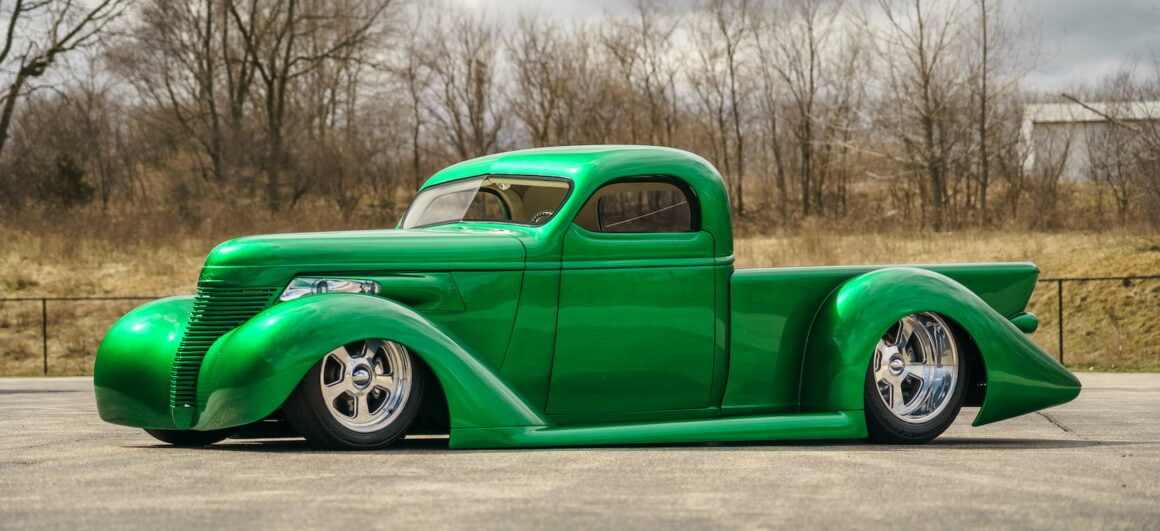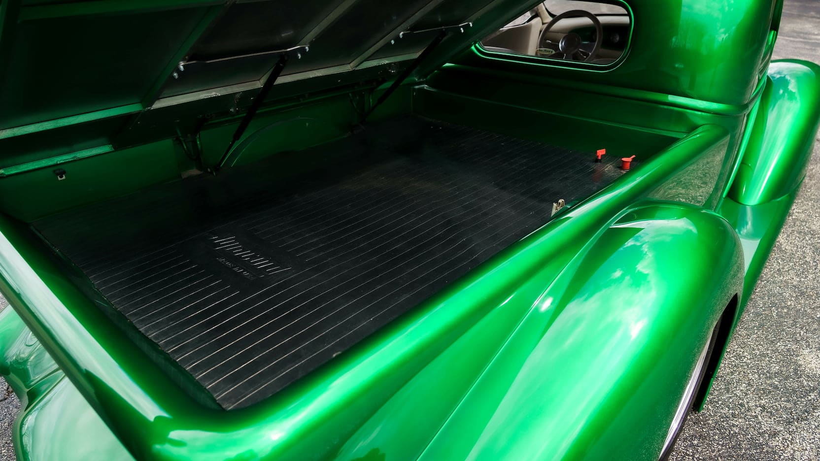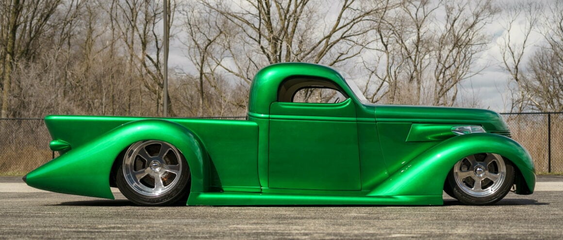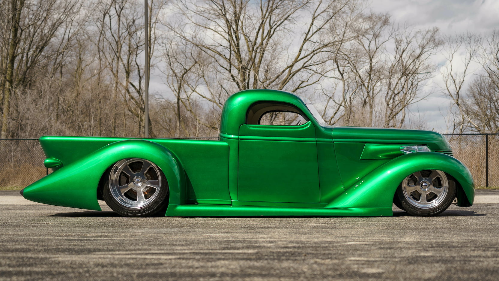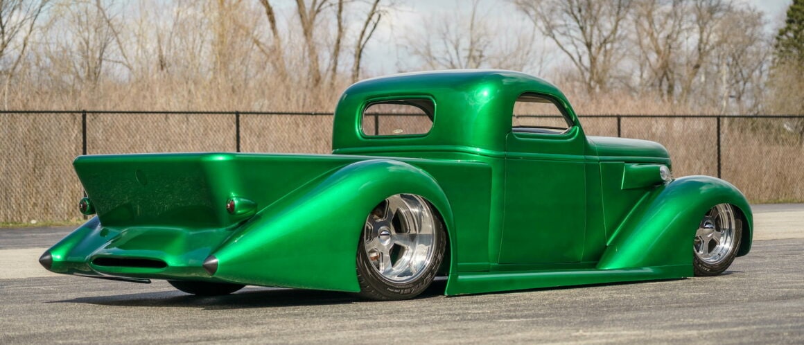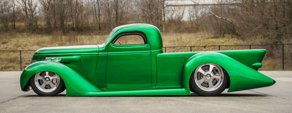 La coupe de toit est de 6 pouces. L’ouverture d’échappement personnalisée a été fabriquée à partir d’une calandre de Pontiac 1954. Les embouts d’aile arrière proviennent d’une Chevrolet ‘Dagmar’ 1957. Les feux arrière ont été prélevés d’une Chrysler 1936. La peinture a été réalisée par “House of Kolor” en “Organic Green” et “Cosmic Silver”… Les phares sont des Plymouth Prowler intégrés. L’insert de tableau de bord est également issu d’un Plymouth Prowler. Ce Hot-Rod Pick-Up a été utilisé dans diverses promotions pour les produits “CleanTools” et “Matco Tools”. Il a été Recréé par “Hot Wheels” en 2002 au 1/64ième. Ce Pick-Up a été présenté dans de nombreux magazines, y compris “Popular Hot Rodding”, “Classic Trucks” et “Street Rodder” de feu Tom McMullen. Il a été exposé au Salon SEMA 1999 et 2021 ou il a reçu le premier prix de sa catégorie.