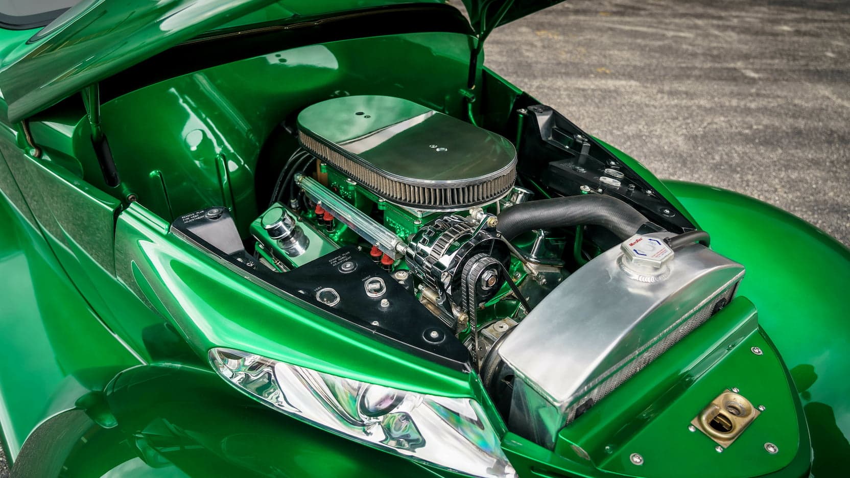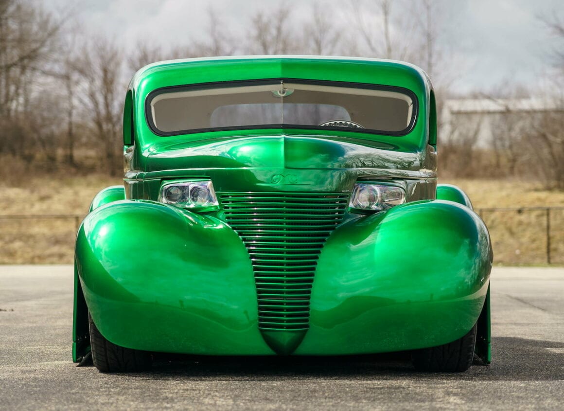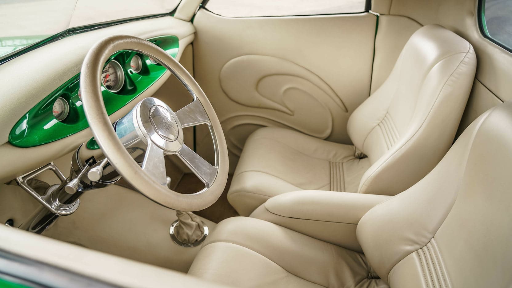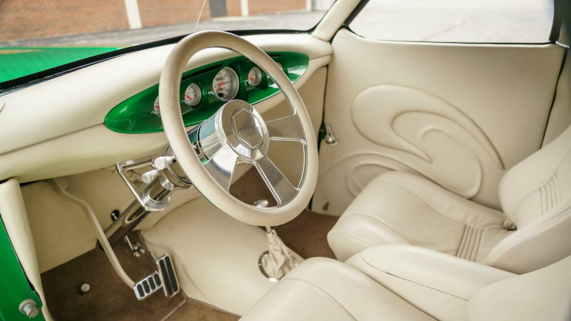 Un GMC Pickup de 1939 a servi de point de départ à cette création sauvage, bien que l’on ait du mal à trouver un élément laissé en stock ou qui ne soit pas radicalement transformé en une œuvre d’art personnalisée. Les Hot-Rods de Bill Wisp ont tous fait l’objet d’innombrables heures passées sur le design extérieur, y compris couper le toit de la cabine de 6 pouces et fabriquer des ailes allongées, des marchepieds. Le gaufrage de la calandre GMC d’usine a été conservé, la mettant en évidence. D’autres touches, plus subtiles, comprennent la suppression des encadrements des portes et l’intégration des phares Plymouth Prowler et les feux arrière Chrysler de 1936. Le châssis Art Morrison a été modifié et doté d’une suspension pneumatique “Weed Eater” qui permet de se poser sur le sol aux fins d’expositions ! La puissance provient d’un V8 406ci surmonté d’un collecteur d’admission Edlebrock. L’échappement double se dirige vers une sortie d’échappement personnalisée et centrée qui a été fabriquée à partir de la section centrale d’une calandre de Pontiac 1954.