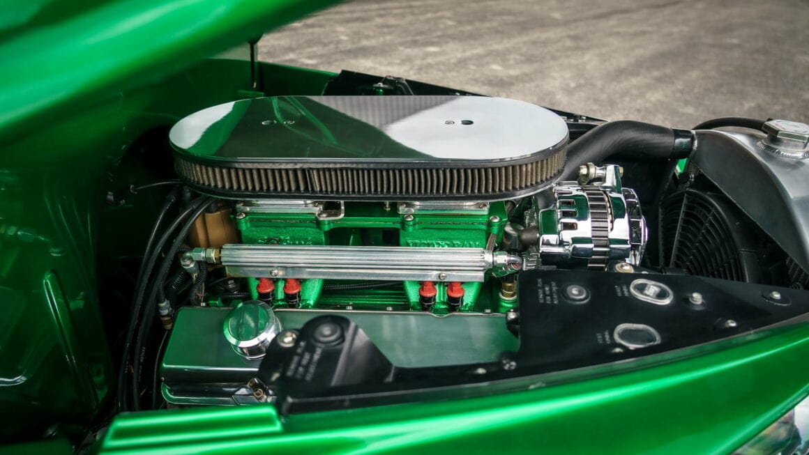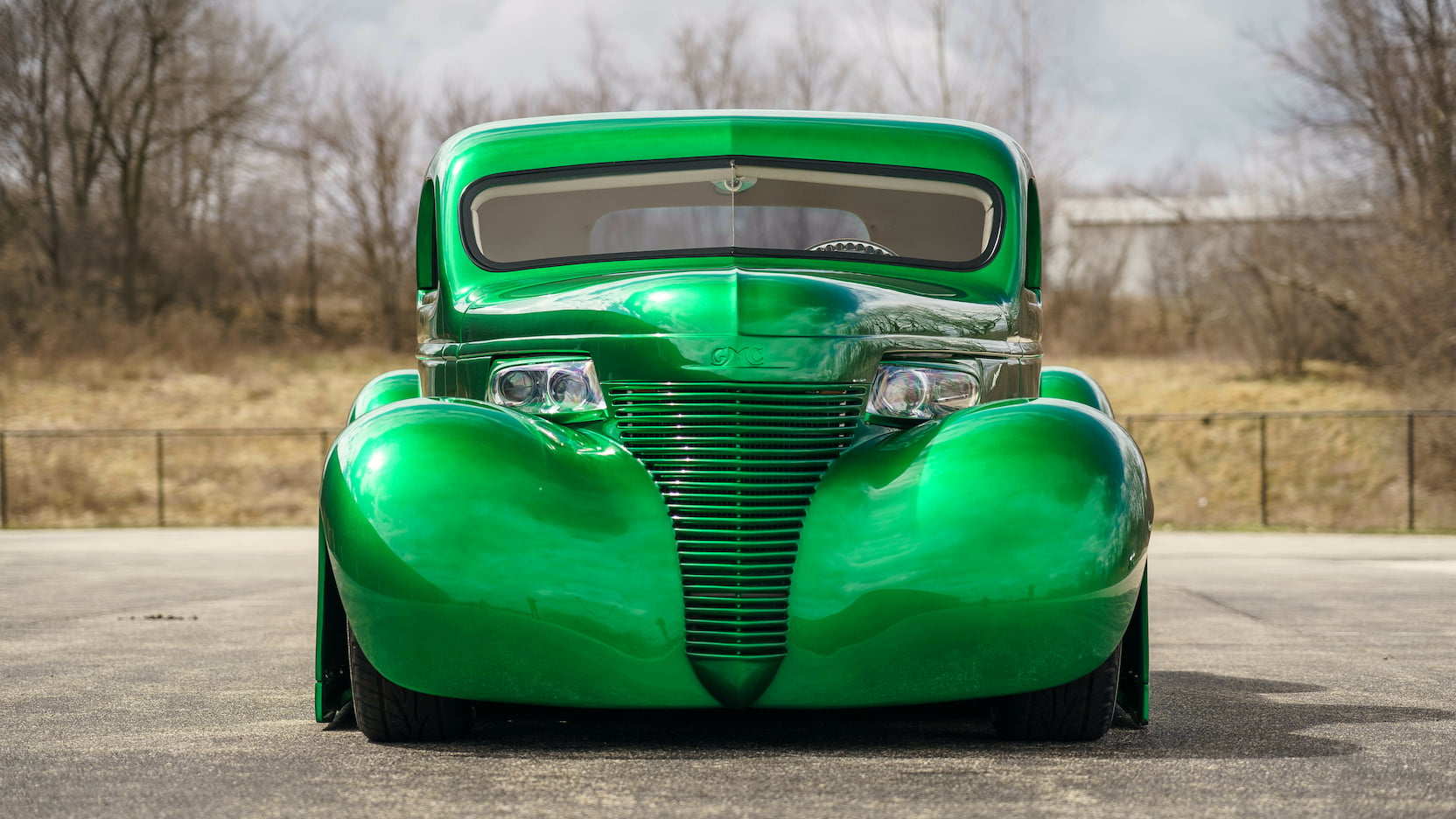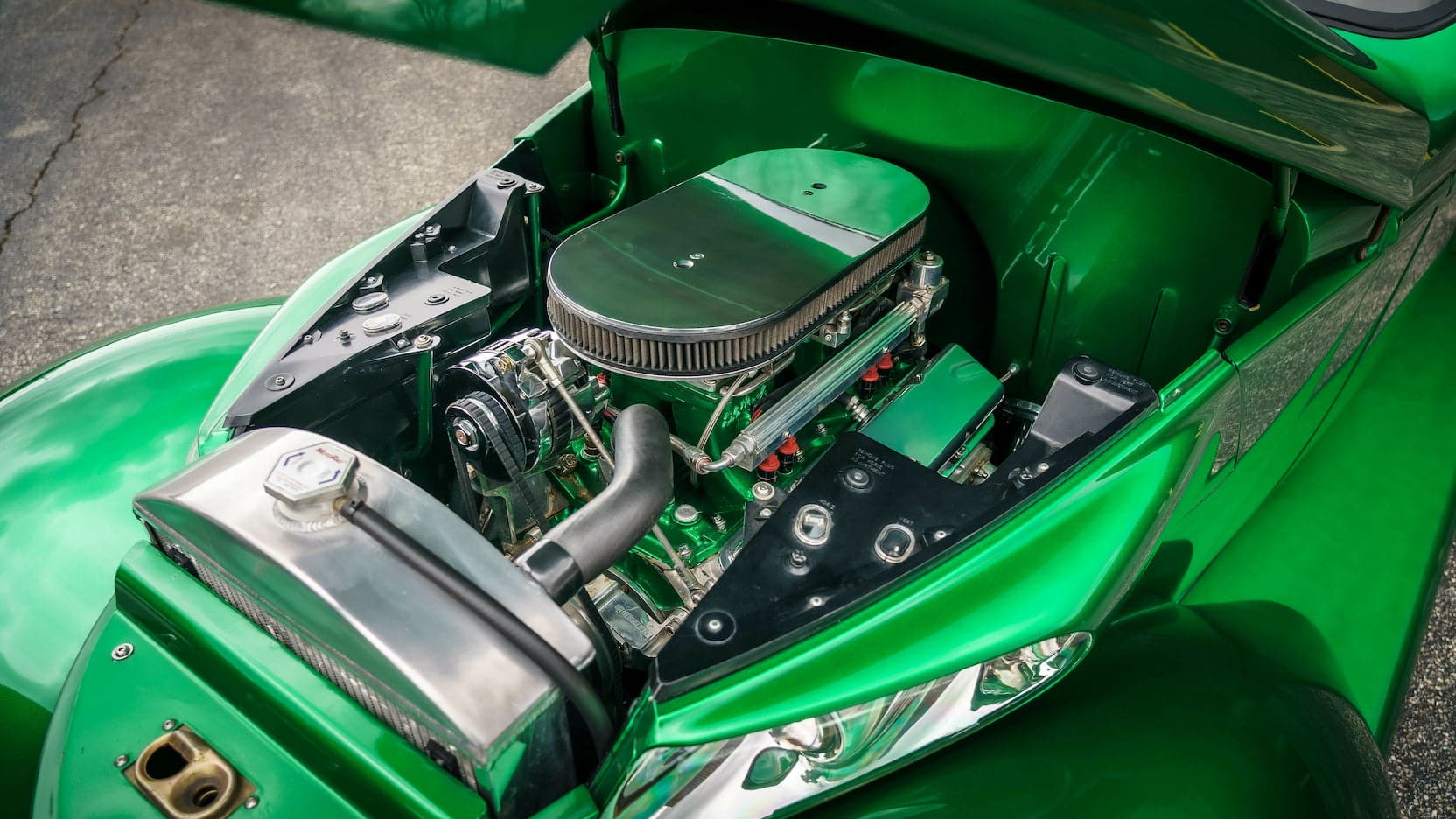 Un GMC Pickup de 1939 a servi de point de départ à cette création sauvage, bien que l’on ait du mal à trouver un élément laissé en stock ou qui ne soit pas radicalement transformé en une œuvre d’art personnalisée. Les Hot-Rods de Bill Wisp ont tous fait l’objet d’innombrables heures passées sur le design extérieur, y compris couper le toit de la cabine de 6 pouces et fabriquer des ailes allongées, des marchepieds. Le gaufrage de la calandre GMC d’usine a été conservé, la mettant en évidence. D’autres touches, plus subtiles, comprennent la suppression des encadrements des portes et l’intégration des phares Plymouth Prowler et les feux arrière Chrysler de 1936. Le châssis Art Morrison a été modifié et doté d’une suspension pneumatique “Weed Eater” qui permet de se poser sur le sol aux fins d’expositions ! La puissance provient d’un V8 406ci surmonté d’un collecteur d’admission Edlebrock. L’échappement double se dirige vers une sortie d’échappement personnalisée et centrée qui a été fabriquée à partir de la section centrale d’une calandre de Pontiac 1954.