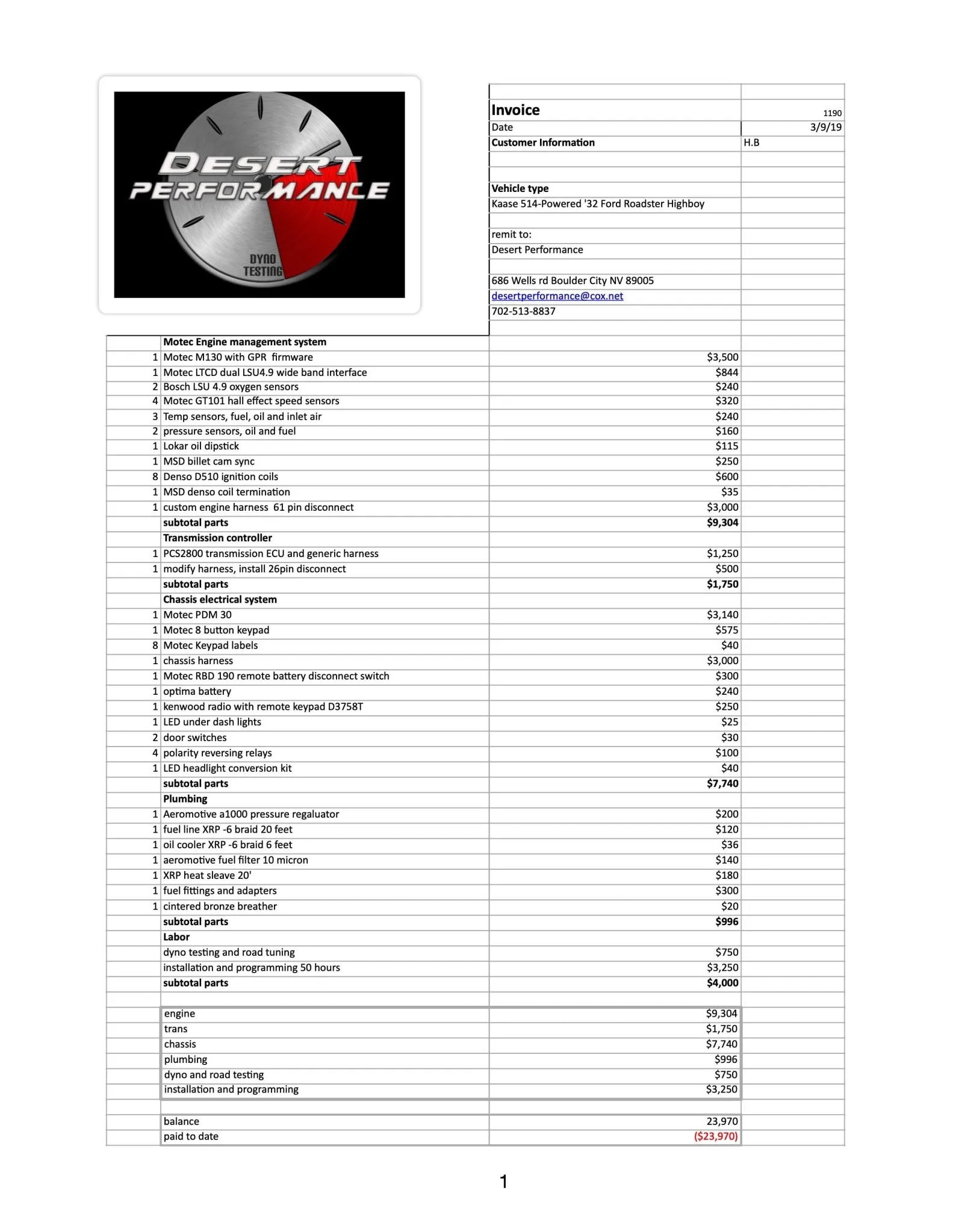 Les jantes “American Racing” de 18 pouces sont montées avec des pneus avant Michelin Pilot Sport 215/45 et arrière Mickey Thompson × 280/12po… Voilà… Comptez selon les copies des factures que ce Hot Rod a dû couter pas loin de 100.000 US$… En conséquence c’est au minimum ce montant qui constitue le plancher d’une transaction auquel s’ajouteront taxes et emmerdes si vous rêvez de l’amener en France… Au vu des photos, aller vivre en Arizona c’est cool…