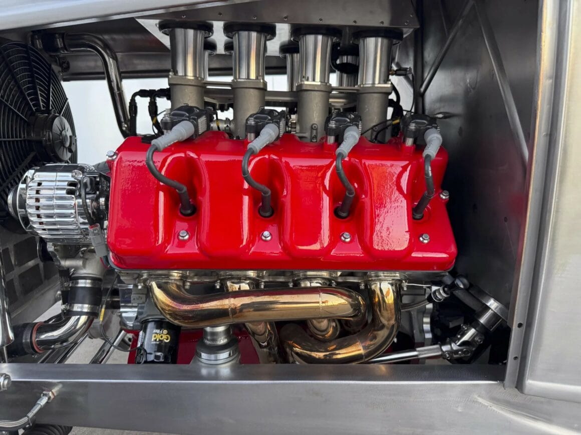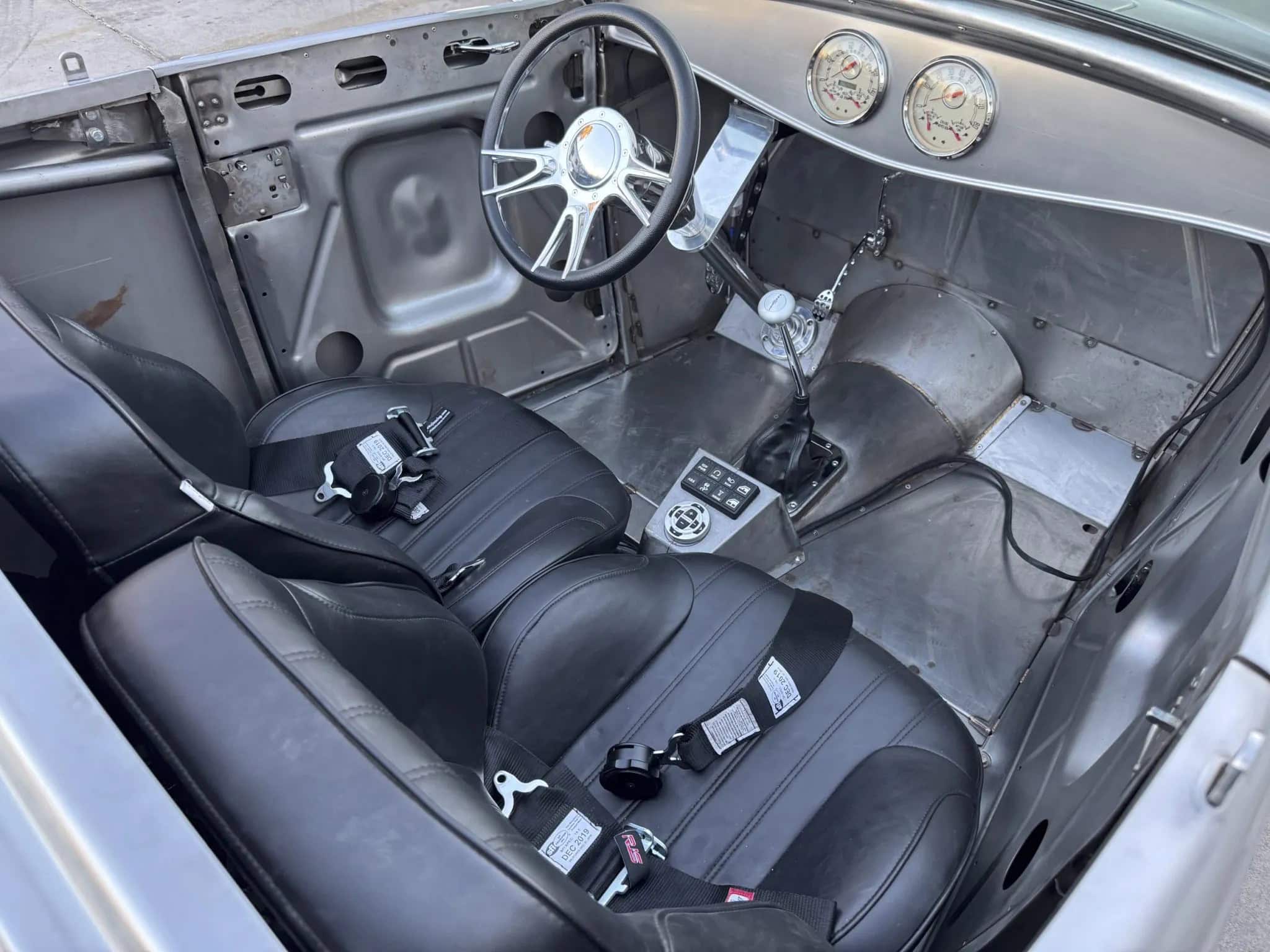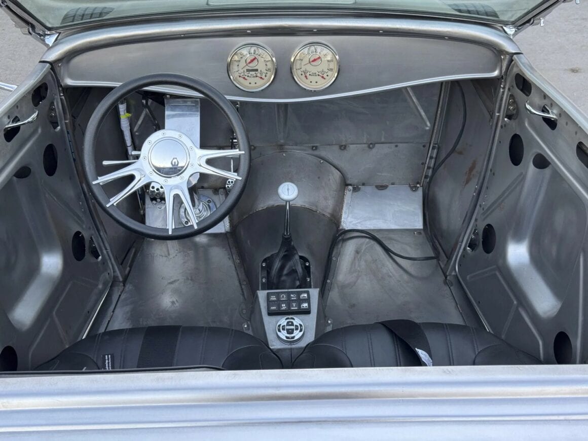 Un contrôleur de transmission PCS TCM-2800 est intégré à l’ECU et offre un contrôle de traction ainsi que des points de changement de vitesse programmables et une fermeté accrue. Une boucle de sécurité entoure l’arbre de transmission. Ce Hot Rod porte une finition volontaire en métal nu à l’intérieur et à l’extérieur, monté sur un châssis “maison” disposant de combinés filetés réglables et d’une suspension avant indépendante.
