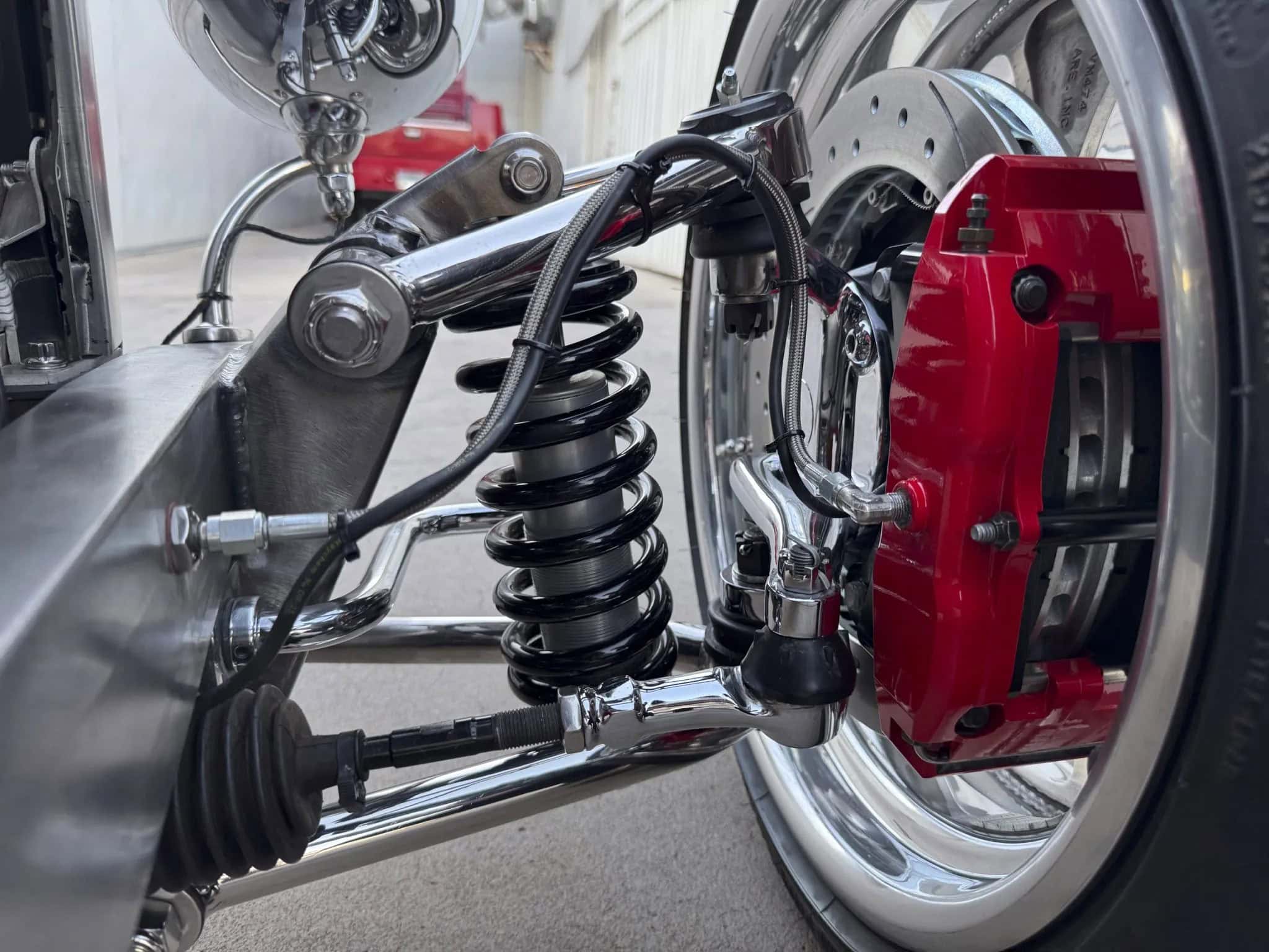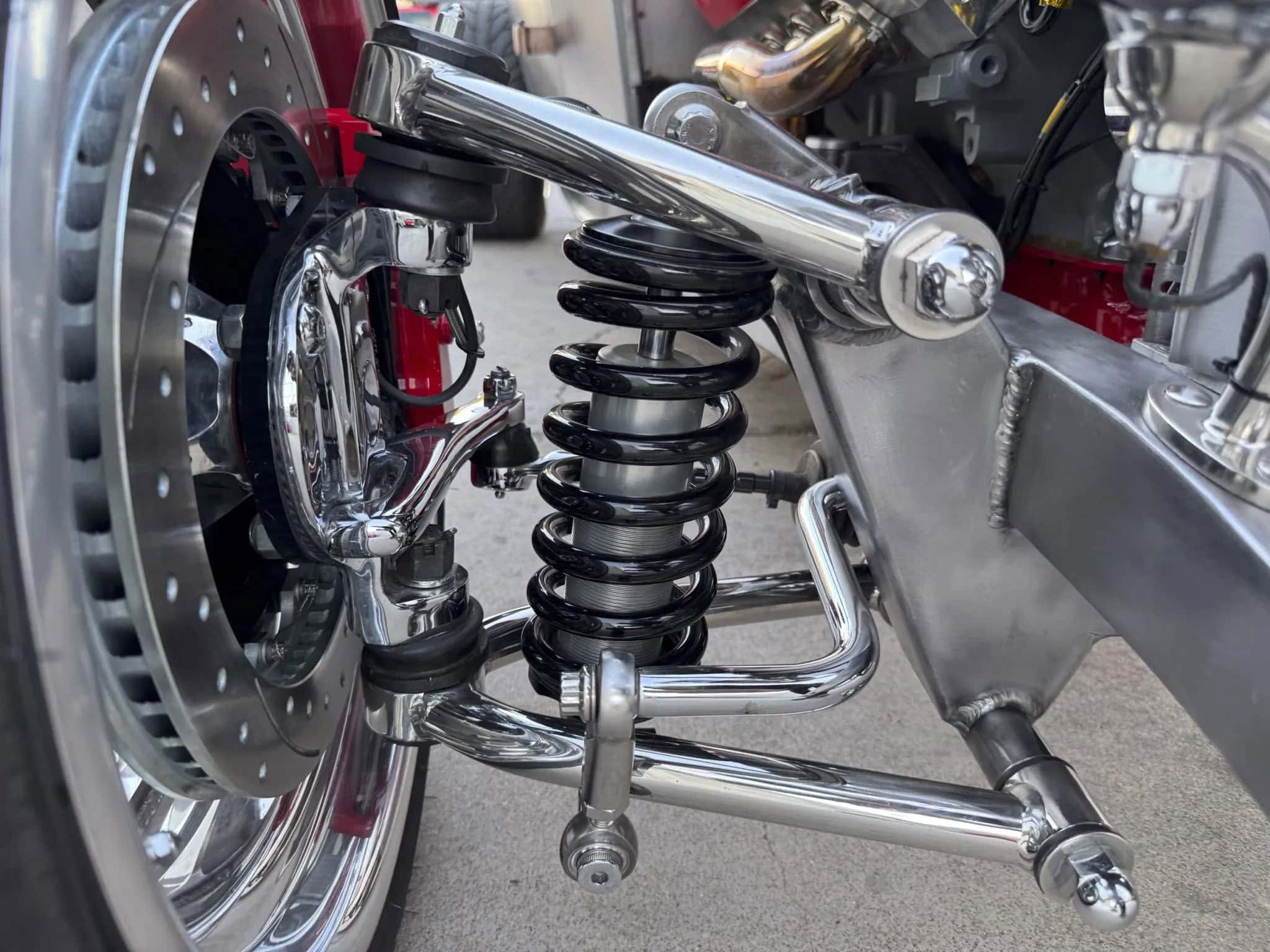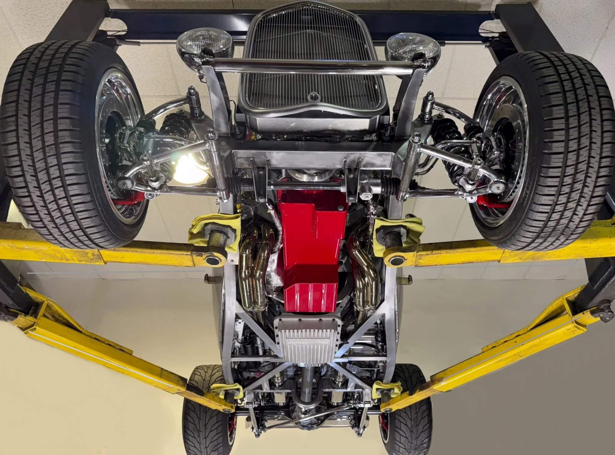 Un contrôleur de transmission PCS TCM-2800 est intégré à l’ECU et offre un contrôle de traction ainsi que des points de changement de vitesse programmables et une fermeté accrue. Une boucle de sécurité entoure l’arbre de transmission. Ce Hot Rod porte une finition volontaire en métal nu à l’intérieur et à l’extérieur, monté sur un châssis “maison” disposant de combinés filetés réglables et d’une suspension avant indépendante.
