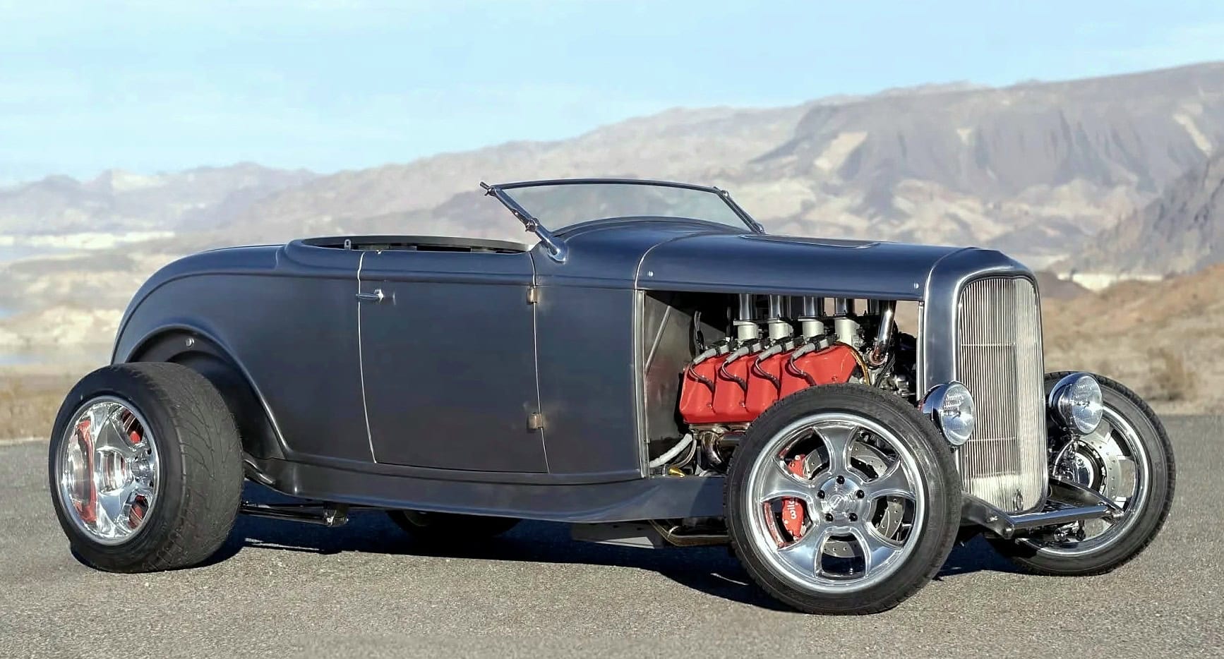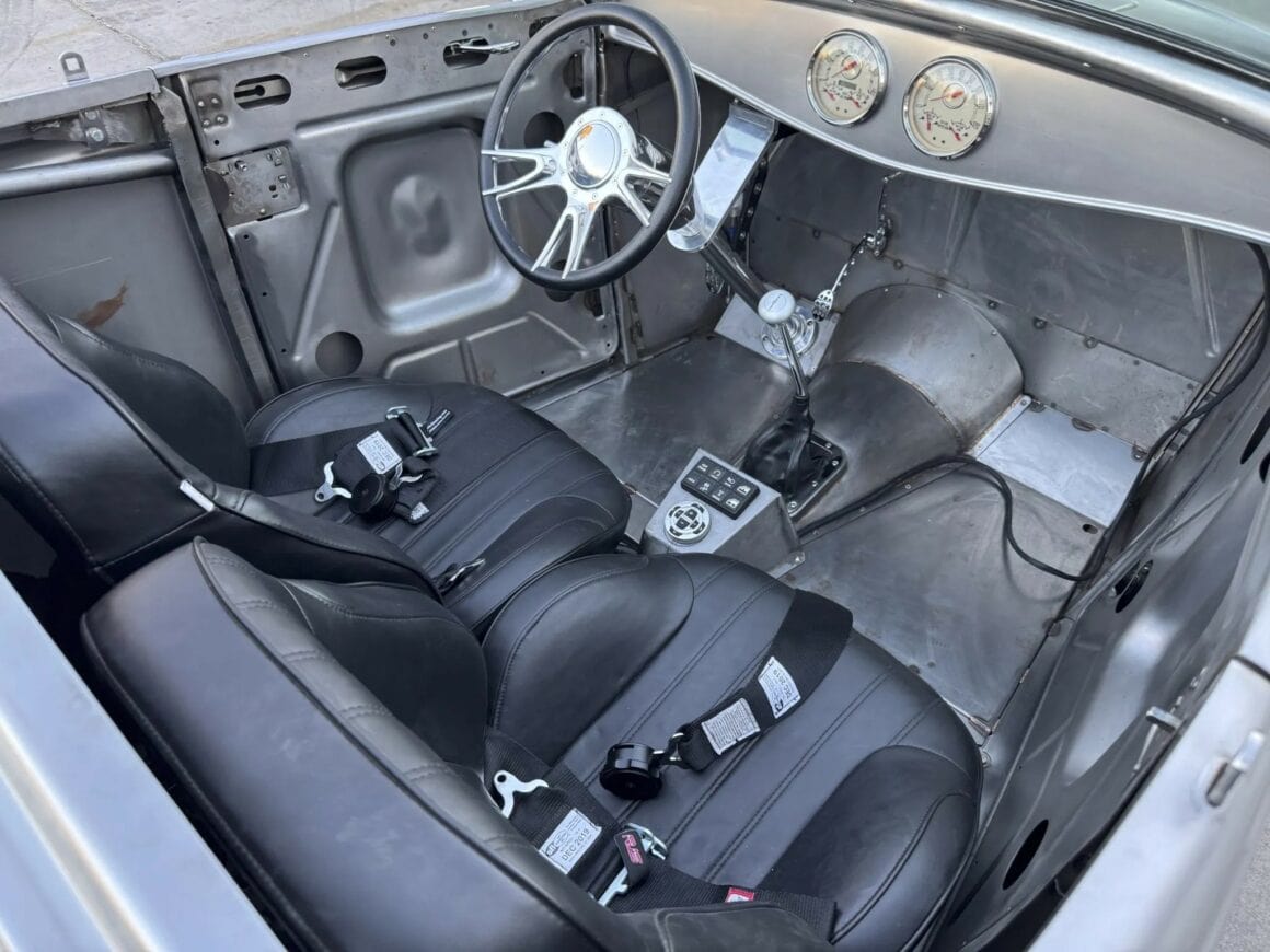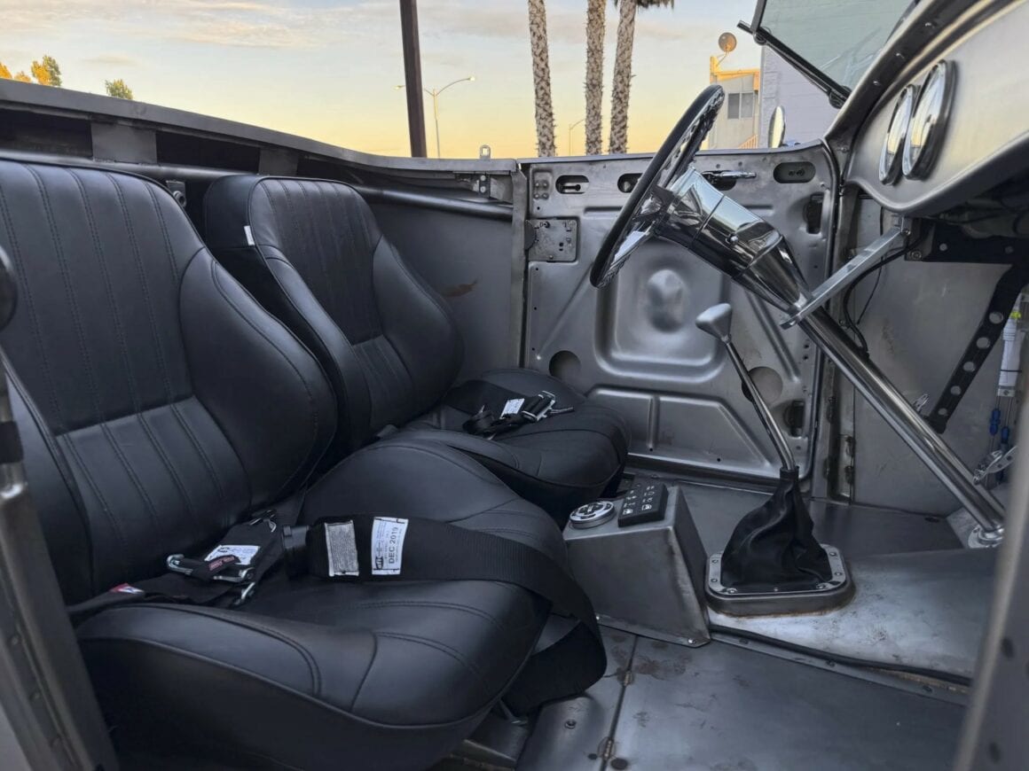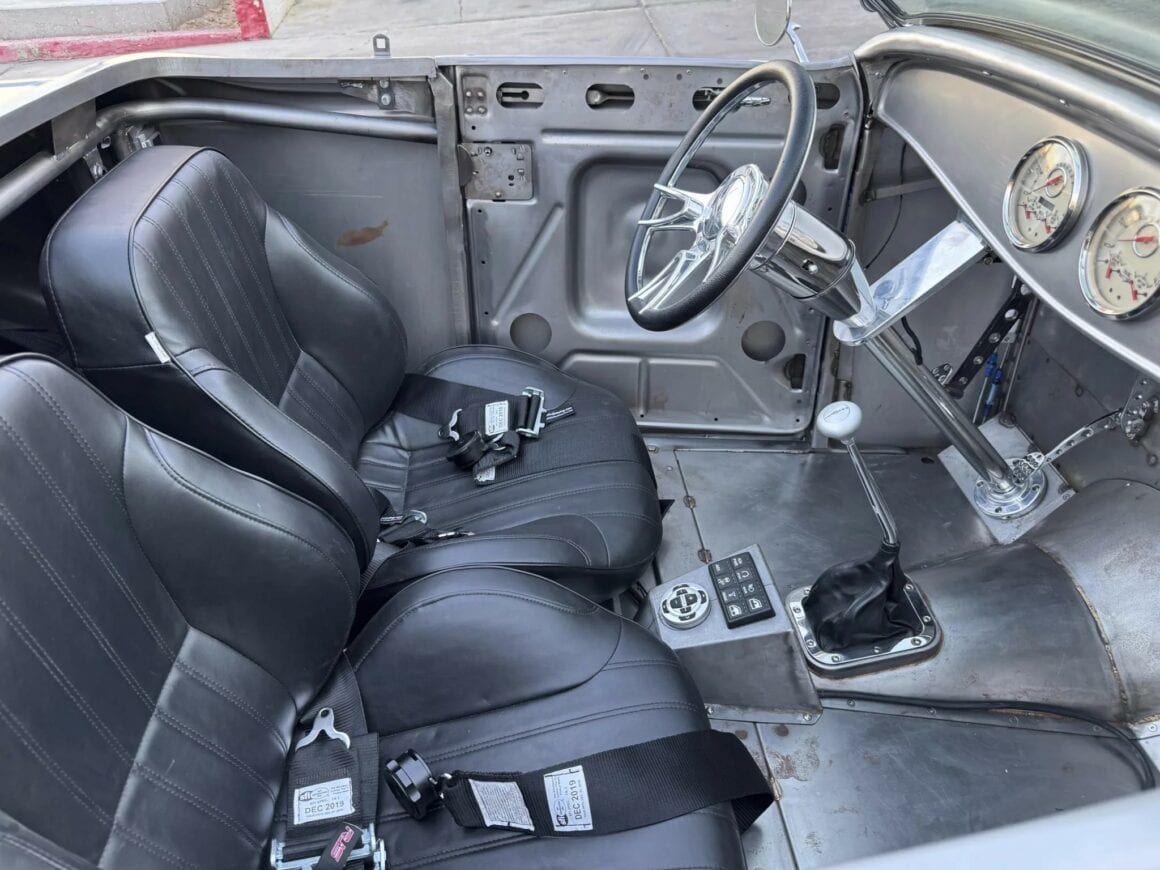 Ce marché est donc protégé au même titre qu’une norme Outlaw légalisée… En d’autres mots, tant que vous payez les taxes et que vous vous conformez aux lois et c’est : “Bonne route et bonne chance”…Des planchers personnalisés ont été installés et des nervures de renfort ont été ajoutées dans la zone du coffre. Les détails extérieurs comprennent un pare-brise (trop) incliné, une capote amovible noire, un capot ventilé et des poignées de porte en acier inoxydable.