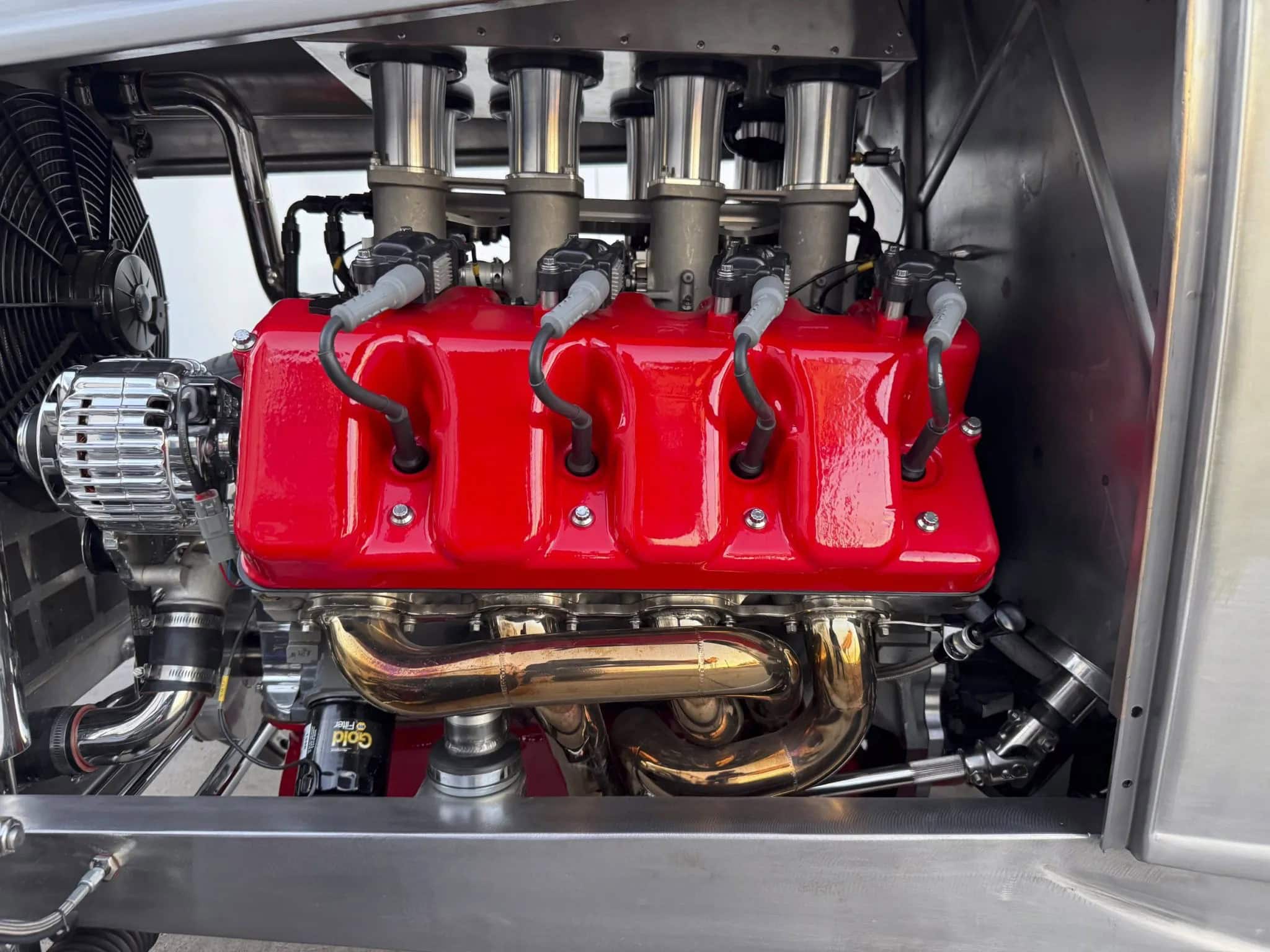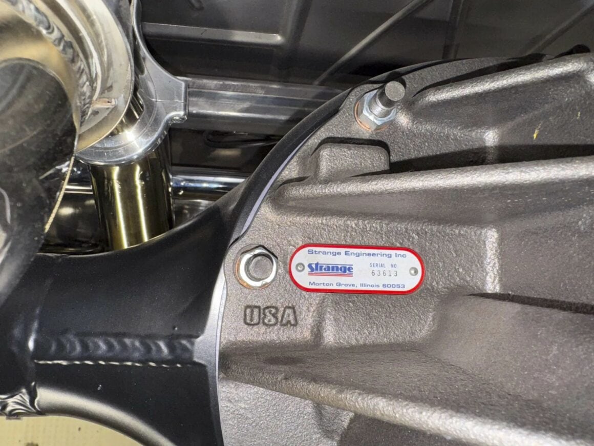 C’est un “Borla” à 8 injecteurs. Il y a aussi un vilebrequin “Crower 4,25” et des bielles “Oliver Racing” . Les commandes sont à boutons poussoirs reliés à un module de distribution d’énergie “ECU MoTeC M130″… Il y a aussi du matériel “ARP” et un système d’échappement double en acier inoxydable. Il est soutenu par une transmission automatique à quatre vitesses “Hughes Performance 4L80E” et le pont-différentiel arrière est un “Strange Engineering”.