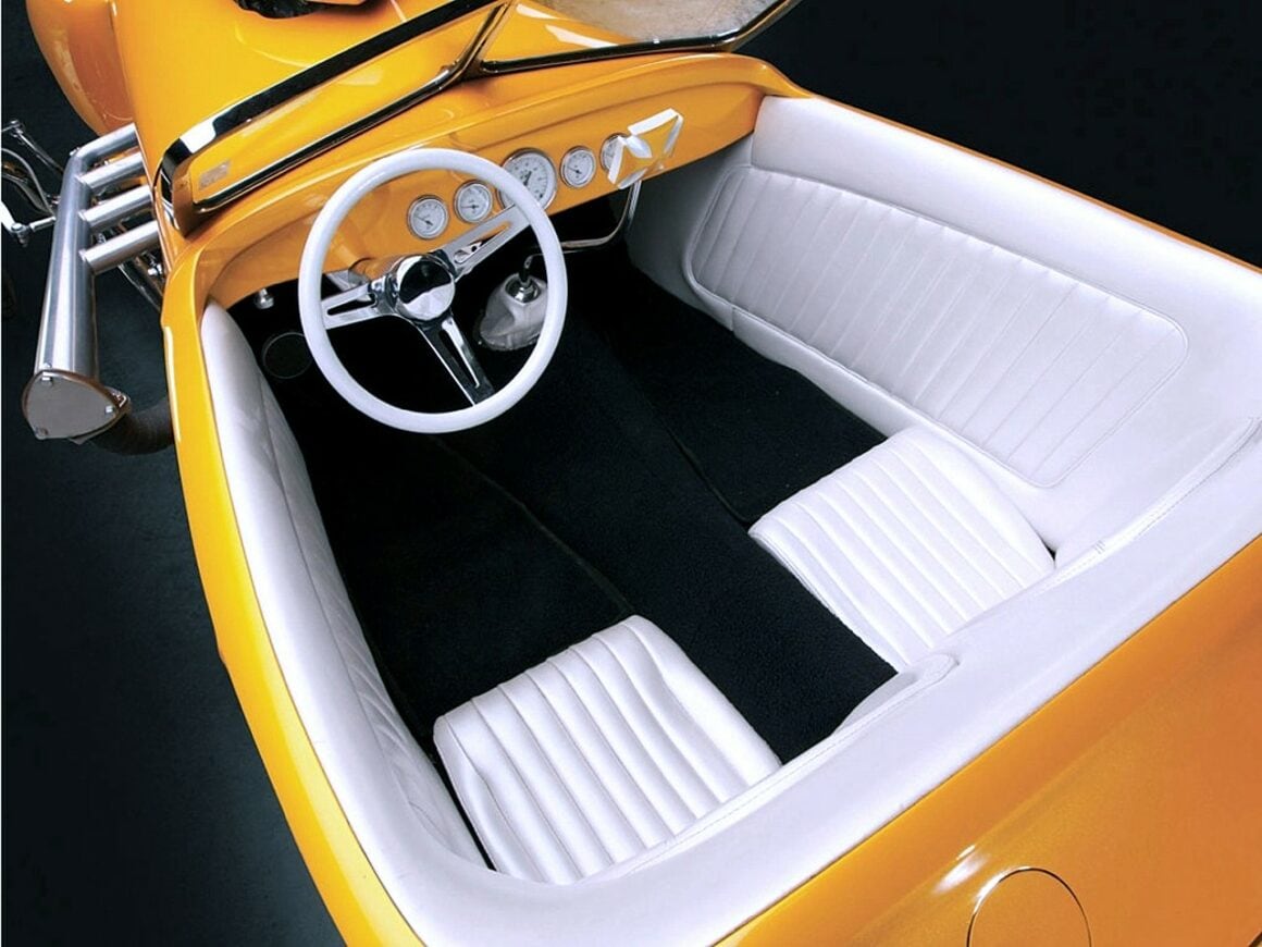Habituellement, les petites portes sont difficiles à garder alignées et ce Hot-Rod “l’âge d’or” est très bas, ce qui rend l’entrée et la sortie assez faciles. Il a également gardé les lignes de la carrosseries parfaites et “délicieuses”. De la calandre en V sculptée avec trois balles chromées encadrées par des cosses de phares en goutte d’eau, les lignes du Hot-Rod passent devant une sorte de “pelle de capot” unique jusqu’à un pare-brise “fendu” style “Du Vall” et un cockpit blanc étincelant.