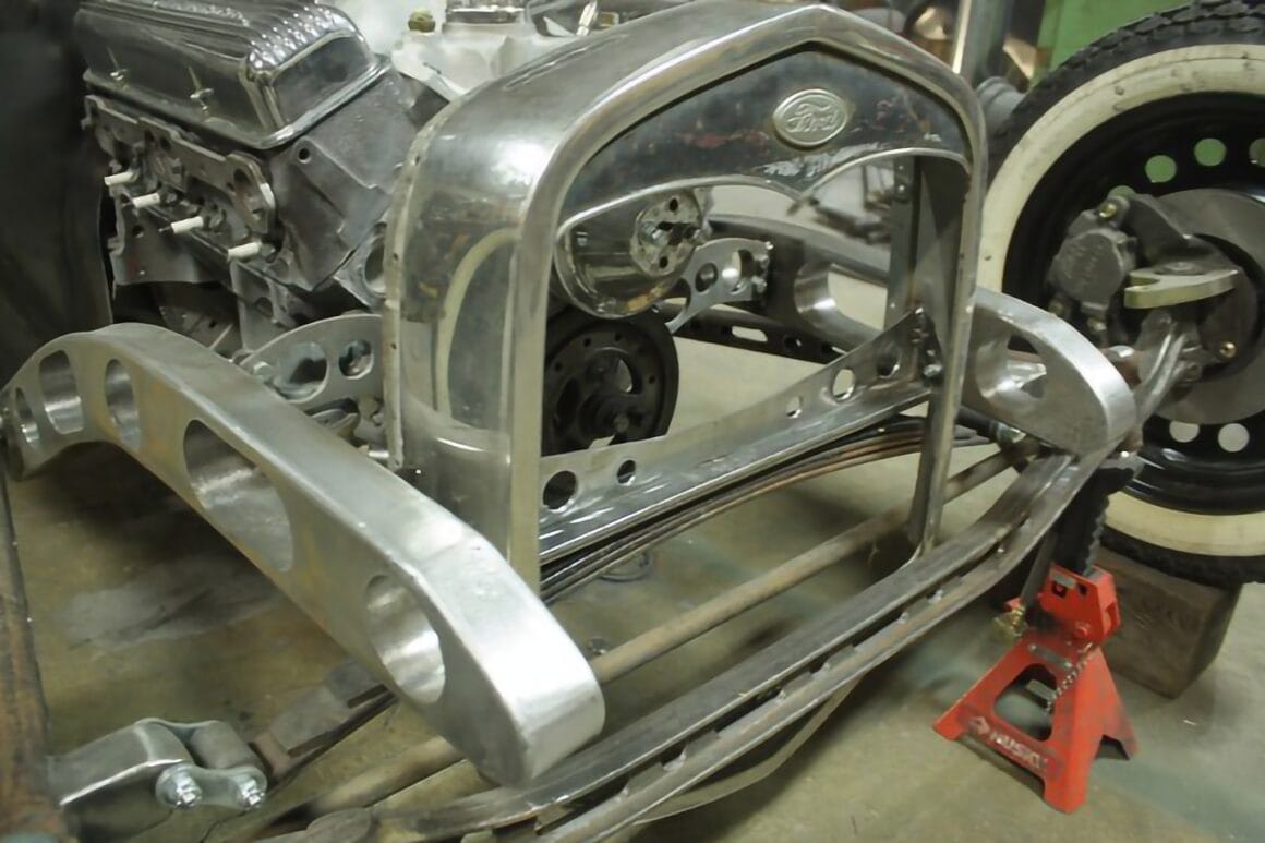 En commençant par le châssis personnalisé, il présente un “kick up” de 12’po à l’avant et un énorme 22’po à l’arrière, percé de trous comme l’étaient les châssis des Mercedes SSKL des années ’20 percés de manière “millimétrique” aux normes des “calculations” Anglo-Saxonnes, à un pouce près, il sert de base à l’essieu avant également percé de même façon qui fut celui d’une Lincoln Zephyr’39.