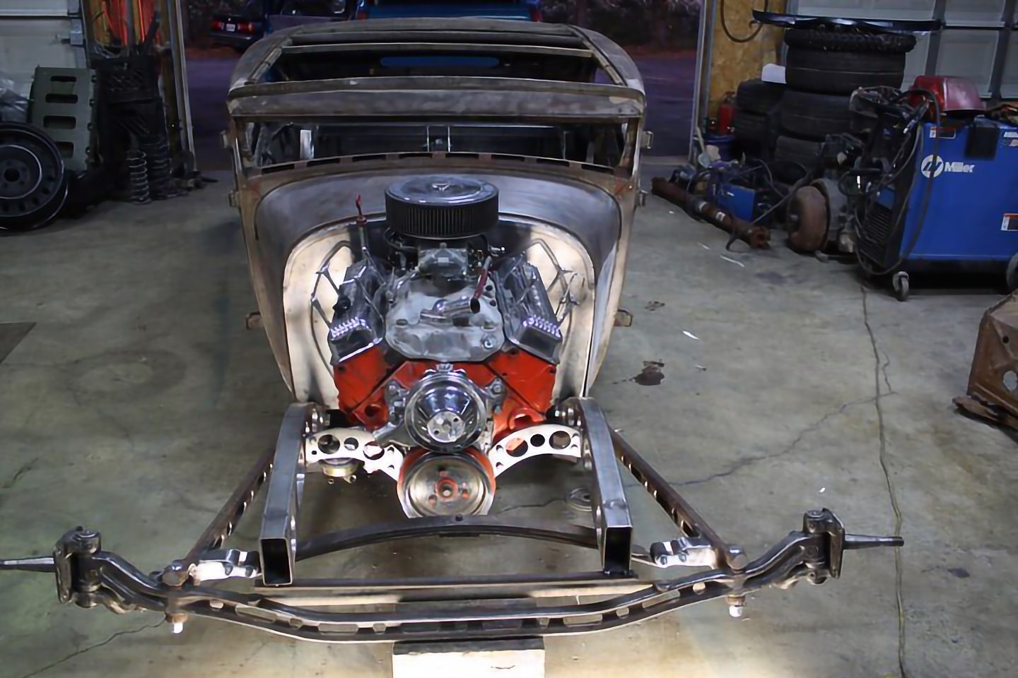 Ayant toutefois une voie plus large qu’un modèle A, il a fallu l’adapter et agir de même avec triangles de suspension AV également percés de mêmes trous, retravaillés au niveau des fusées d’essieu, pour l’abaisser, avec un ressort à lames transversal provenant d’une Ford modèle A standard, tout cela avec des amortisseurs courts effectuant les tâches “rebondissantes”…