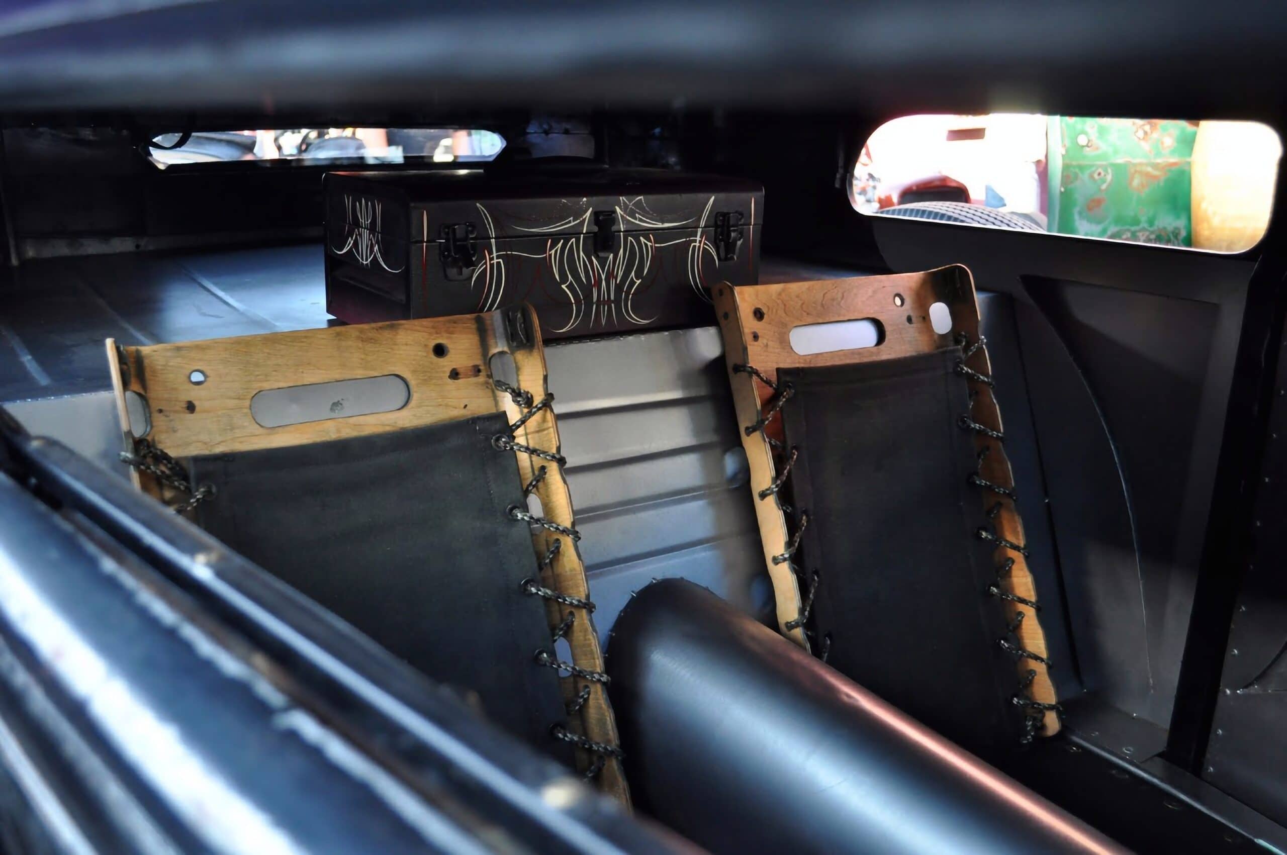 Et où se trouve le radiateur ? Derrière un panneau à persiennes dans la queue du Hot-Rod, qui tient compagnie au réservoir de carburant et au radiateur. Le petit réservoir occupant l’espace vide dans la coque de la calandre est le vase d’expansion… Comme tu le constate mon Popu, c’est inhabituel et ingénieux… Bien que ce Hot-Rod ait été peint en noir pour des raisons pratiques (l’état de la coque), j’aime plutôt le fait qu’il le soit…