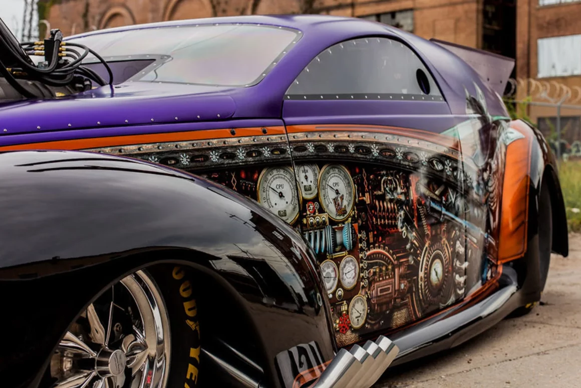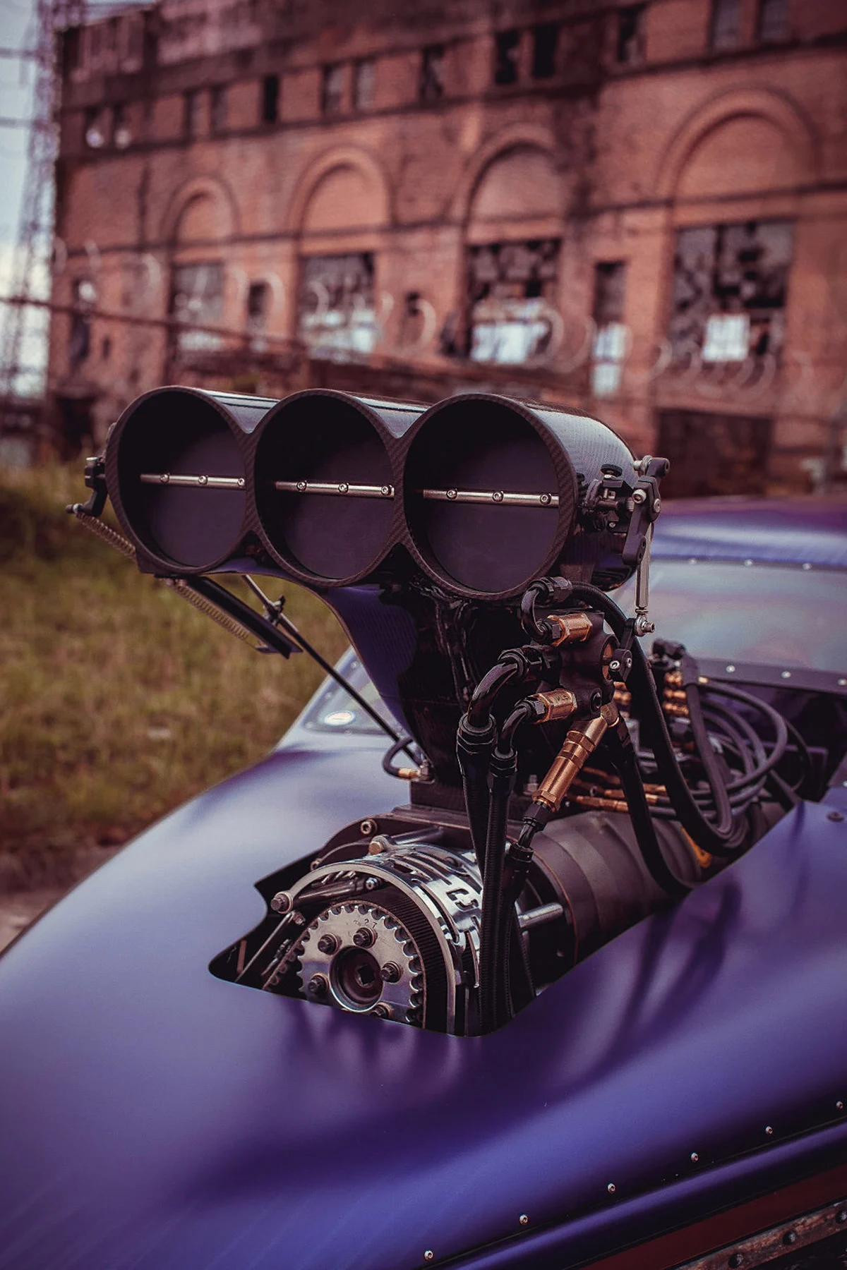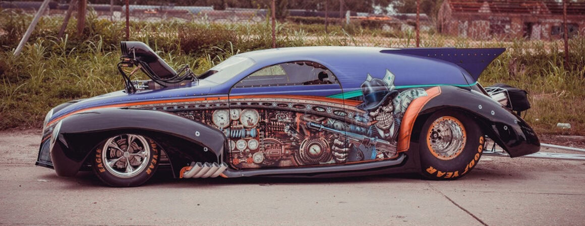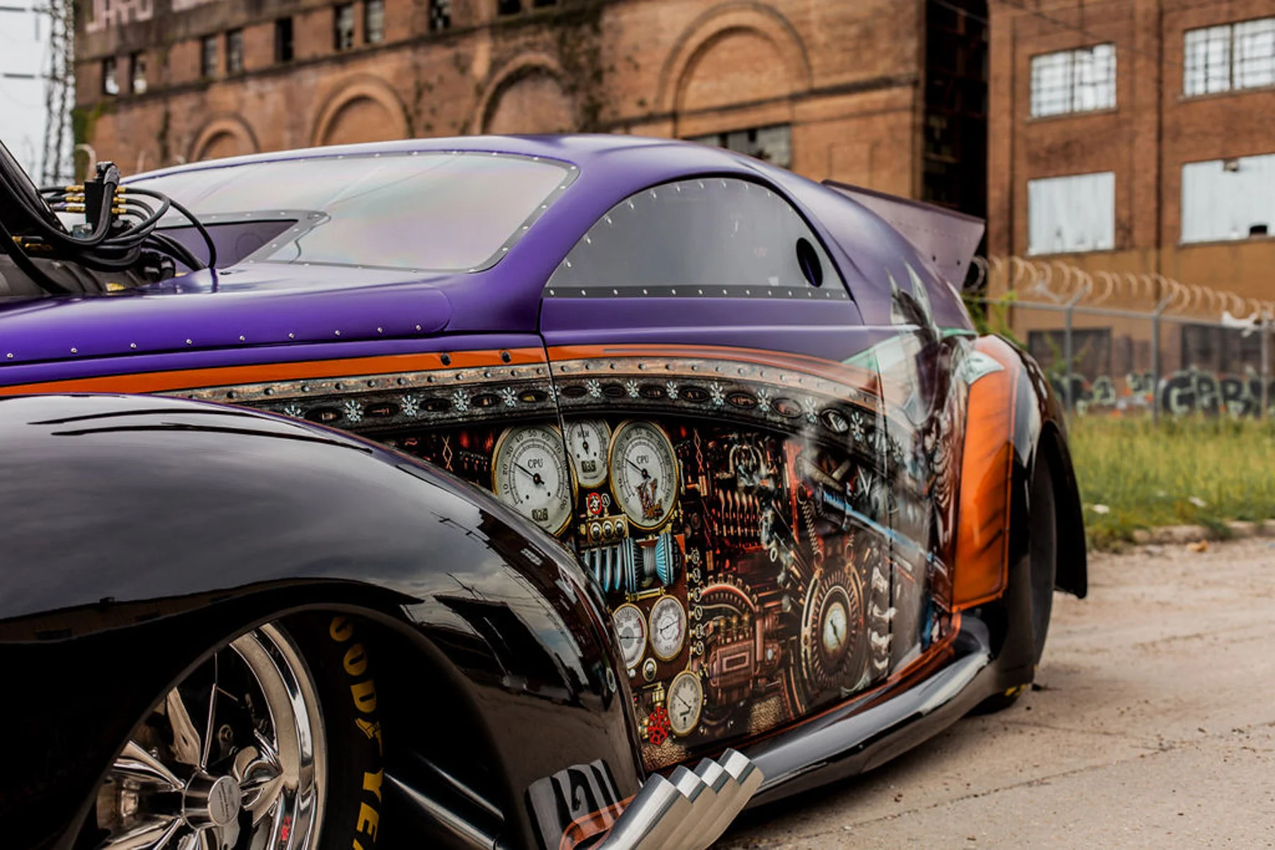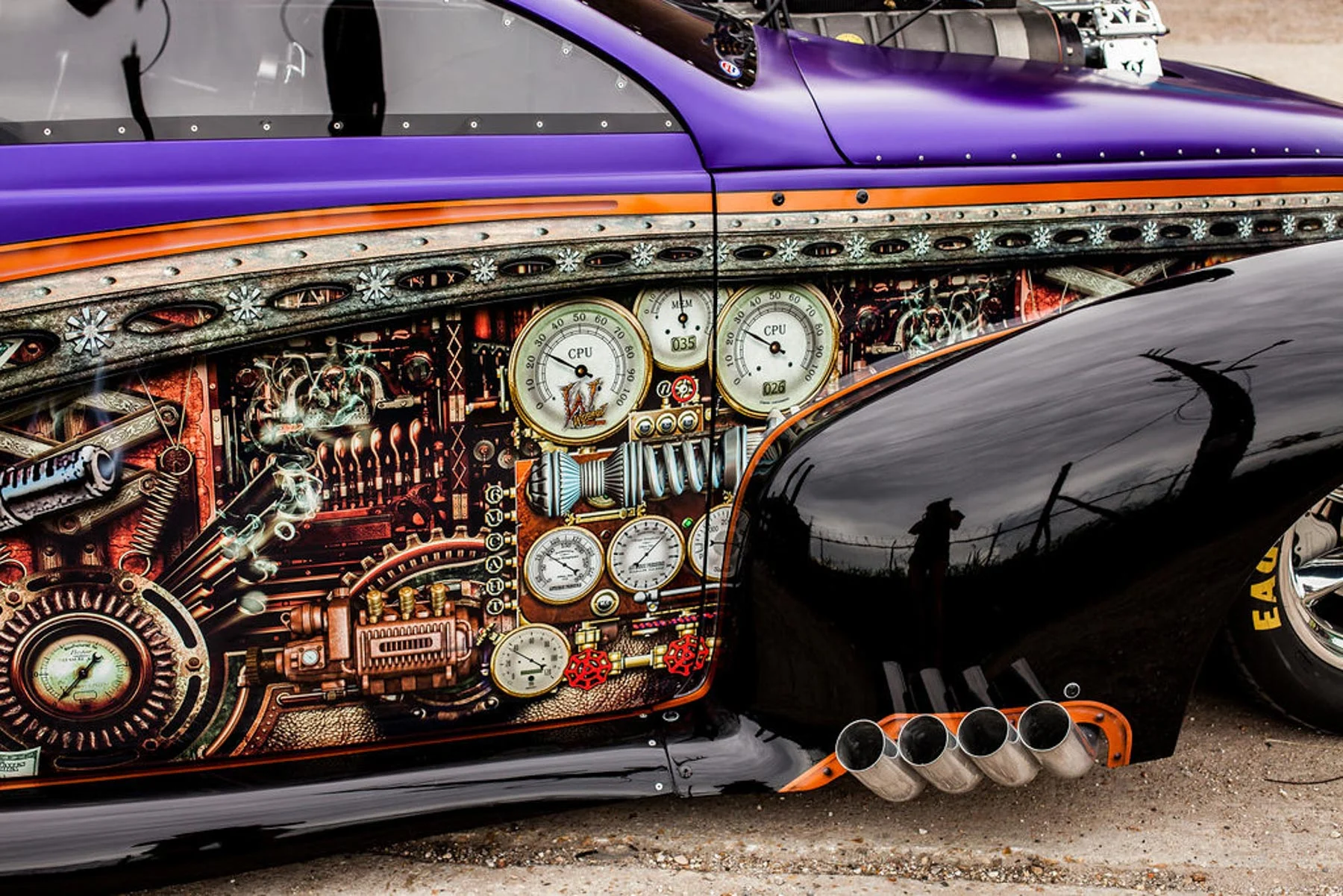 C’est “une chose” destinée à aller d’un point A à un point B éloignés de 400 mètres en ligne droite (1/4 de miles)le plus rapidement possible… Formidable… Je suis dubitatif… Donc, je résume : “Cet engin dans l’absolu n’a aucune utilité si ce n’est que de pouvoir aller vite pour atteindre les 400 mètres et… Rien… C’est déjà fini… Pas plus… Pas moins… Déroutant”… Gary et Bryon Rusich n’étaient certainement pas intéressés par la construction d’une voiture Pro Modified typique… à la place, ils ont demandé à Jason et Michael Wood de Wizard Race Cars de créer une Lincoln Zephyr 1939 suralimentée unique.
