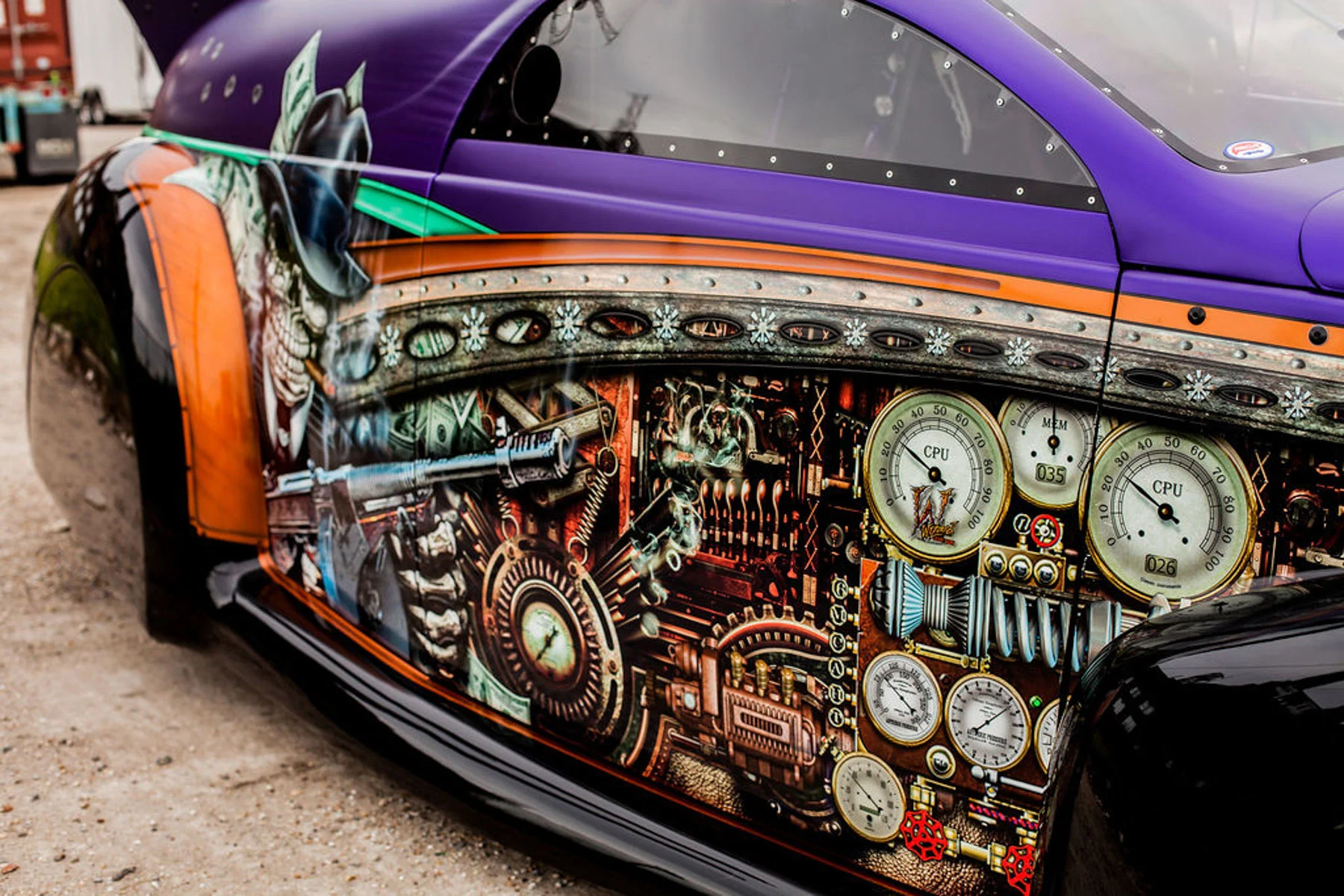 Comme les frères Rusich sont originaires de la Nouvelle-Orléans, la voiture devait avoir un aspect bruyant, ce qui a permis à la carrosserie de la Zephyr de vraiment donner le ton avec un thème mafia. “Le schéma de peinture est une collaboration entre Wizard Race Cars, Rusich Collision et Kal Smith Paint. Jason Wood a conçu le schéma de peinture et a fait la plupart des travaux à l’aérographe. C’est en partie une enveloppe avec de l’aérographe et de la peinture mélangés. Comme Gary possède un atelier de peinture et de carrosserie, ils se sont occupés de la carrosserie et des couleurs principales de la voiture” m’a dit Michael Wood de Wizard Race.