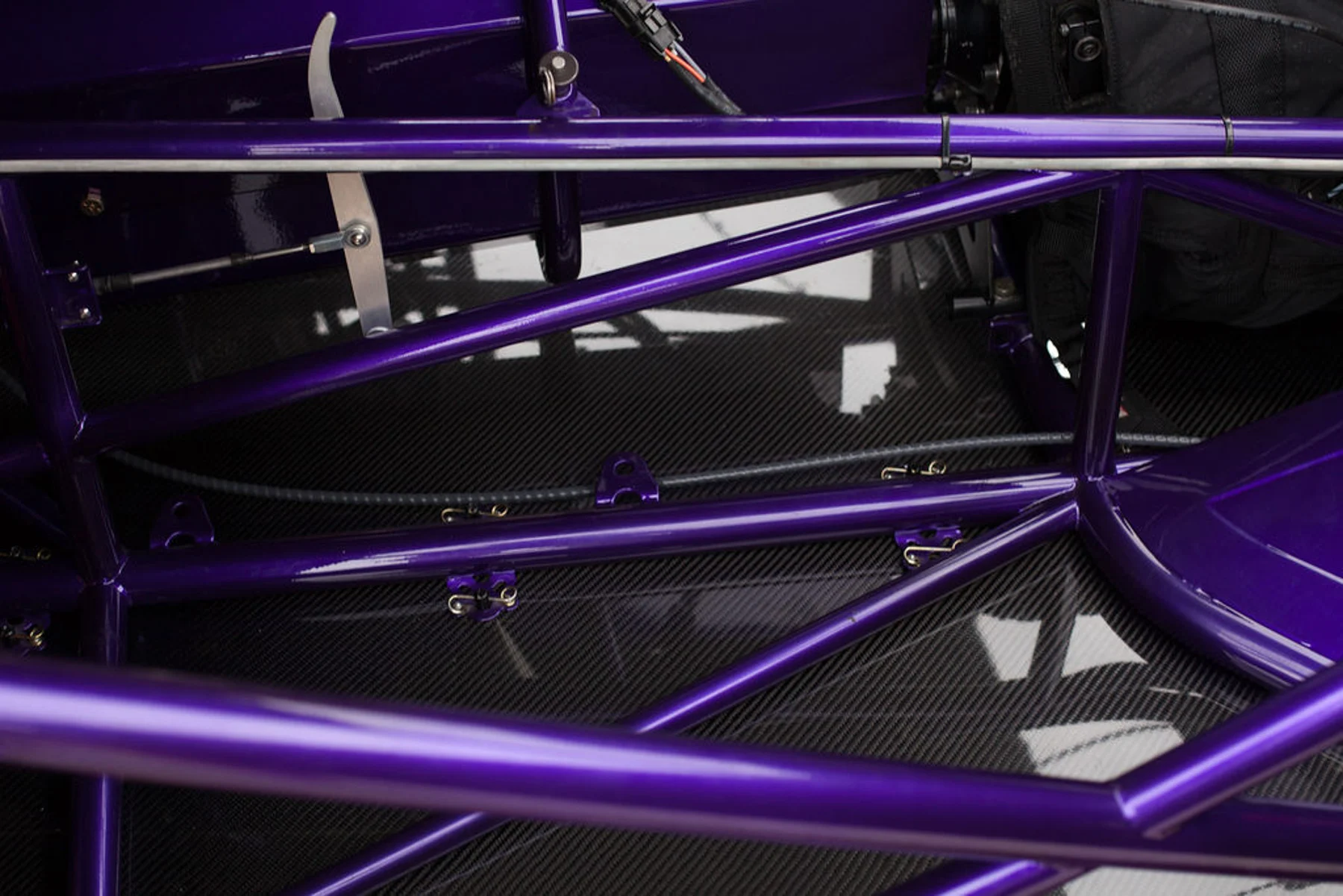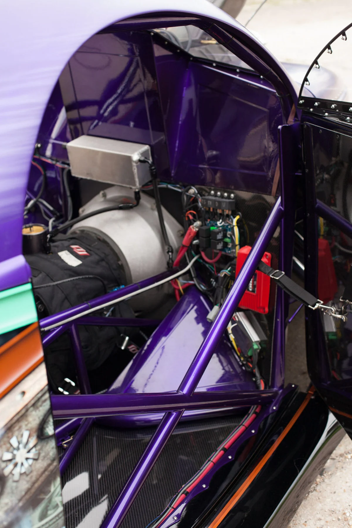 -“Nous avons acheté une carrosserie en fibre de verre et l’avons essentiellement coupée en morceaux. Ils ont rétréci la voiture, surélevé les panneaux de custode arrière, modifié le capuchon avant et donné à la carrosserie un râteau qu’elle n’avait pas à l’origine. Il s’agit essentiellement d’une voiture unique. Le châssis est un double longeron certifié 25.1 en chrome-molybdène avec un arrière à 4 bras et une jambe de force avant”. L’arrière a des essieux percés au pistolet à 40 cannelures de “Strange Engineering” nommé Ultra Case. L’intérieur entièrement en fibre de carbone a été entièrement construit chez “Wizard Race Cars”.