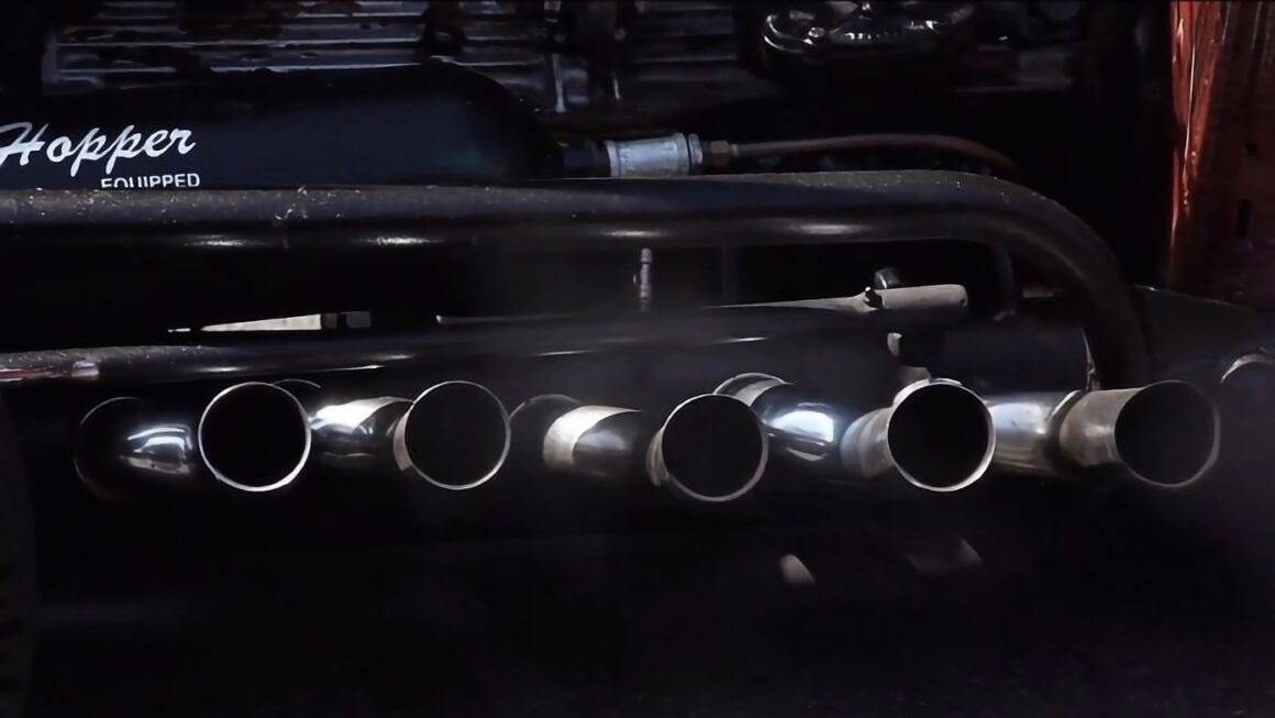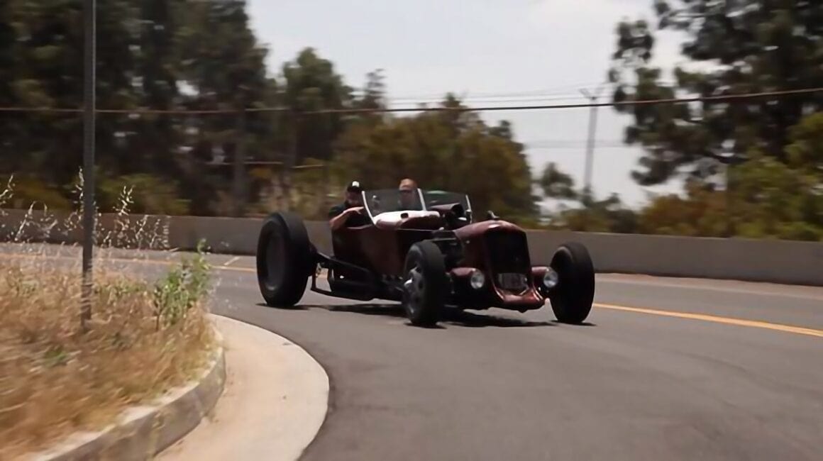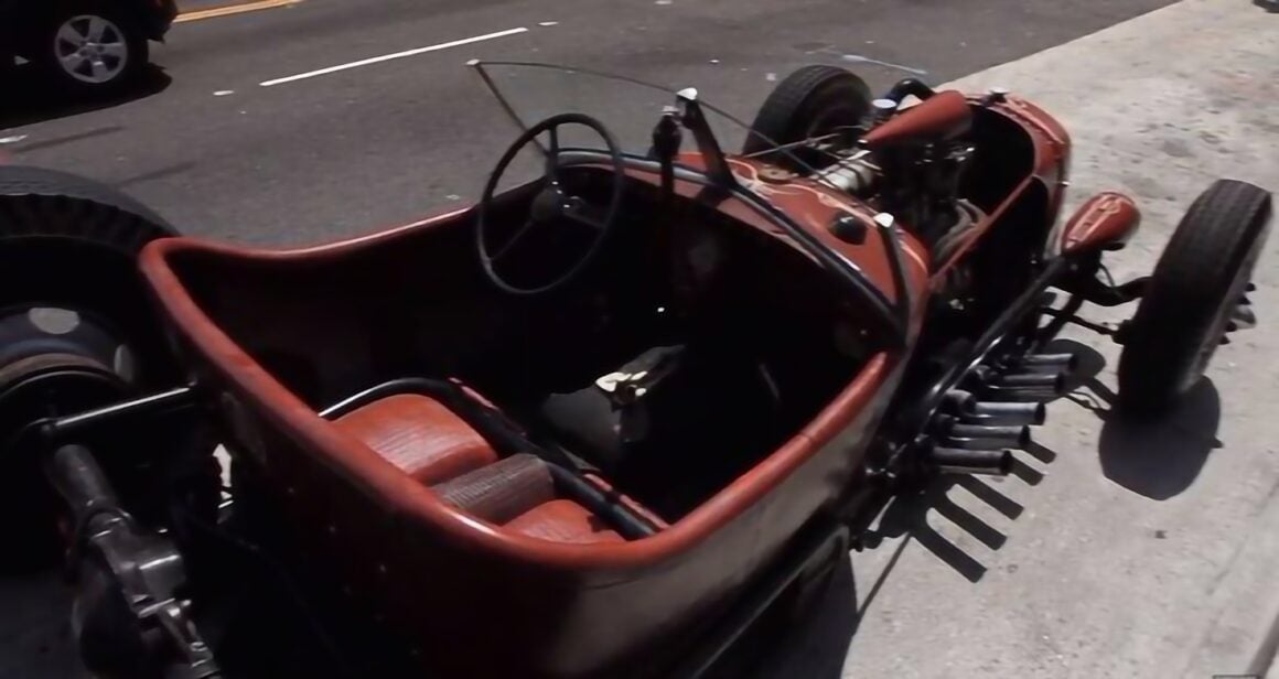Selon Henry Kessler, le moteur de son “Rat-Rod de Satan” a couvert plus d’un million de miles et n’a jamais été ouvert ! Il crache de la fumée et vomit de l’huile, mais fonctionne, comme dans un rêve, le caractère agricole du moteur signifie que s’il était heureux de se trimballer dans les champs durant les années cinquante, ce sera plus confortable de ronronner dans ce “Satan’s Rat-Rod” pour ses années crépusculaires, même si les phares proviennent d’une Buick et les rails du châssis de vieux lampadaires trouvé dans les casses. Cependant, comme le disait un designer célèbre : “La fonction crée la forme”, une mentalité qui s’étend à tous les coins et recoins de la voiture, y compris les pédales soudées à des barres en acier trouvés autour de l’atelier ! Le moteur produit un 275 chevaux quoiqu’il donne l’impression d’en délivrer 1.000, c’est conservateur, mais le couple de 1600lbft est monstrueux… Par contre il n’y a pas de commentaire à faire sur le poids à vide, mais mon estimation scientifique est que : “Cest trop lourd” ! Les contrôles de santé et de sécurité ont toutefois été contournés dans la création de cette bête, et ce qui est le plus remarquable, c’est que le réservoir de carburant de 6 gallons fait d’une vieille bouteille de propane en acier, fait partie de l’intégrité (gag !) structurelle de la voiture, alors que les renforts de châssis transversaux sont soudés directement à lui (ça fait peur), donc dans le cas d’un accident, le réservoir de carburant devient une zone de déformation explosive…