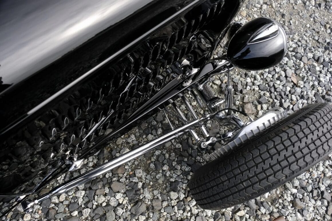 Les roues de 16 à l’avant et de 18 à l’arrière ont été commandées sur mesure pour la construction et sont chaussées de pneus Excelsior Radial. Le châssis SO-CAL Speed Shop fabriqué sur mesure est équipé de barres d’échelle arrière chromées de Pete et Jake, de ressorts à lames avec enveloppes en cuir personnalisées, d’un essieu “à tube de chute avant” Magnum de 5 pouces et de batwings SO-CAL. La direction se fait via un boitier “rapide” Flaming River de style Vega, et le freinage est assuré par un maître-cylindre à double circuit alimentant les tambours arrière Ford et les disques avant de 11 pouces dissimulés par des carénages de tambour à ailettes.