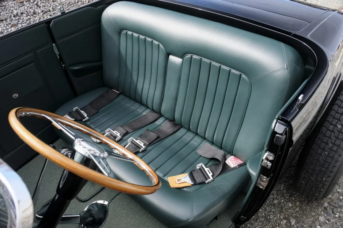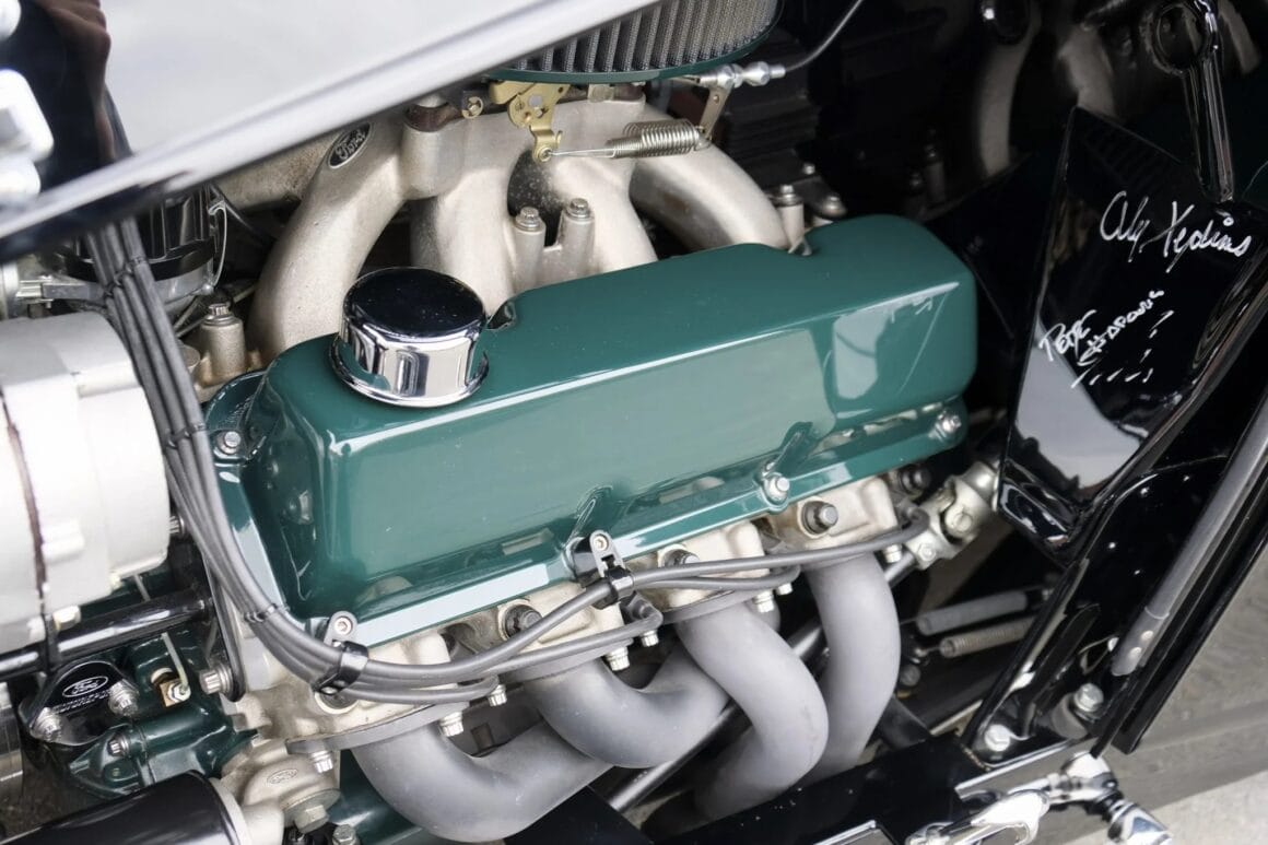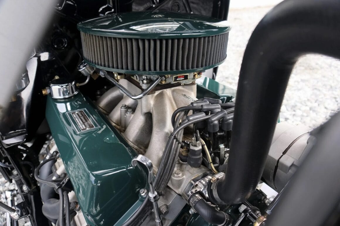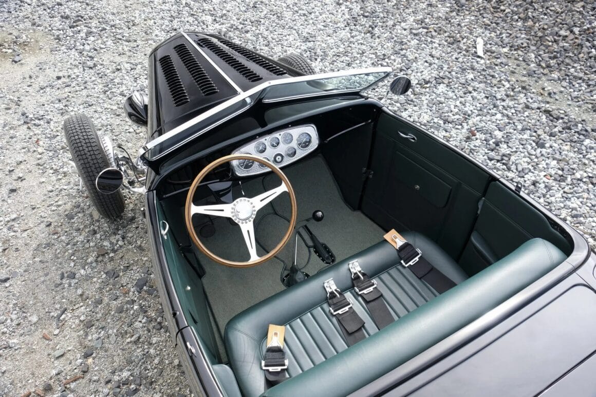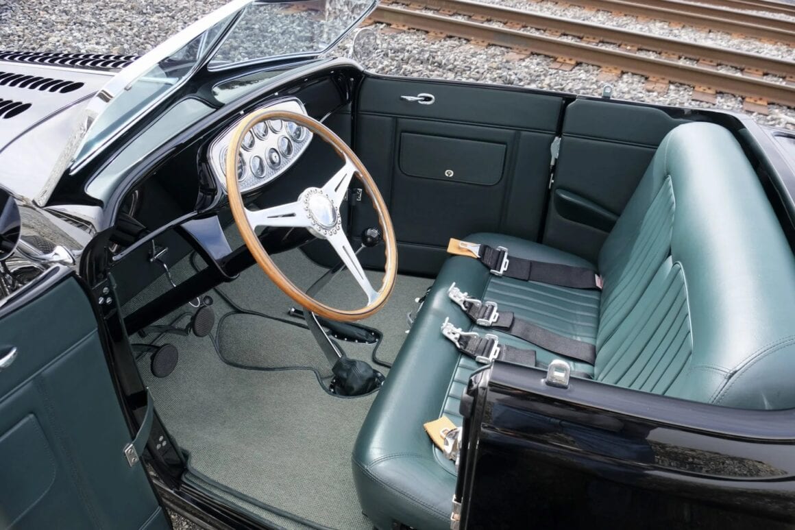 L’habitacle a été garni par Gabe’s Custom Interiors de San Bernadino, en Californie, et dispose d’une banquette rembourrée en vert foncé, de panneaux de porte et de panneaux latéraux arrière assortis et de tapis verts à tissage carrés. L’équipement supplémentaire comprend une colonne de direction Mullins avec un support personnalisé, des ceintures sous-abdominales noires de style course, des coussinets d’accoudoir moulés dans les panneaux latéraux, des poches de carte personnalisées et un volant Nardi provenant d’une Ferrari California Spyder.