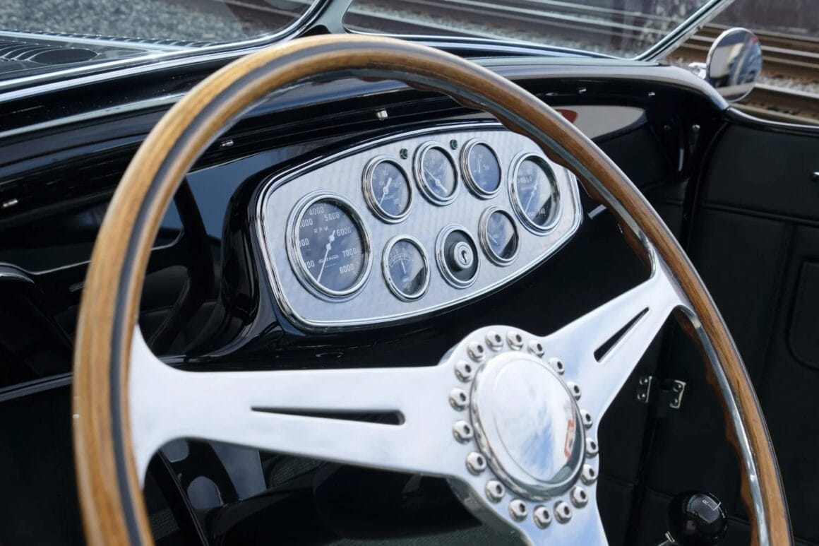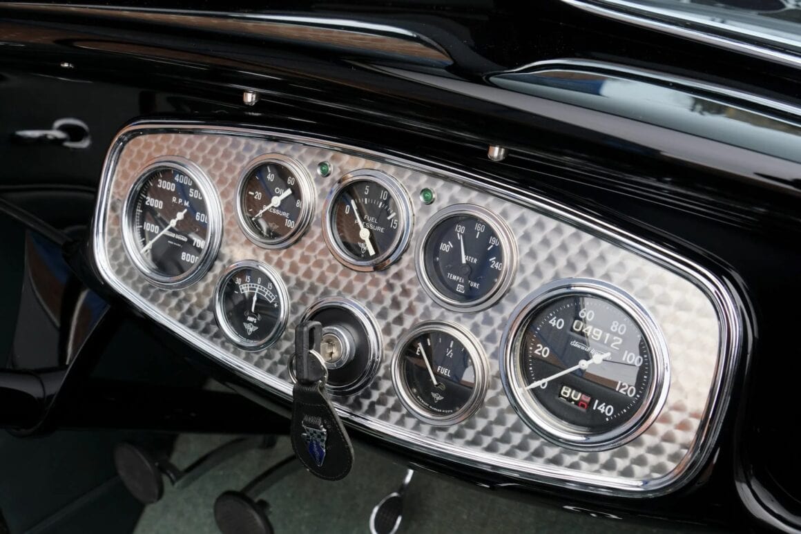 Le panneau de tableau de bord a été fabriqué à l’aide d’une section centrale Pierce-Arrow modifiée moulée dans le tableau de bord en acier Ford et il abrite un ensemble d’instruments central. L’instrumentation Stewart Warner se compose d’un tachymètre, d’un compteur de vitesse et de divers compteurs pour la pression d’huile, la pression de carburant, la température du liquide de refroidissement, l’ampérage et le niveau de carburant… Le compteur kilométrique à cinq chiffres indique un peu moins de 5.000 milles, ce qui, selon le concessionnaire vendeur, est la distance parcourue depuis l’achèvement de la construction en 2002.