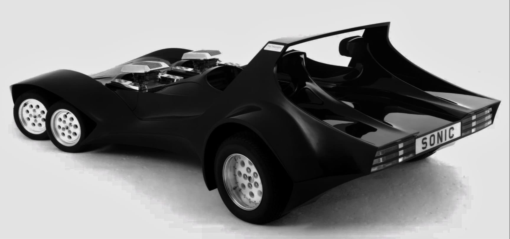 Mon idée a été reprise par Wolfrace avec le Sonic équipé de deux moteurs V8 Rover, d’un châssis “SpaceFrame” avec des trains roulants Jaguar XJ6, d’un style et proportions dramatiques dans l’esprit du futurisme qui allait devenir le style des années ’80 pour mettre les jantes en alliages Sonic sous les projecteurs. Son apparition dans les salons de l’automobile classiques ET Kustoms en Angleterre avec l’appui de divers articles de presse a créé le buzz.