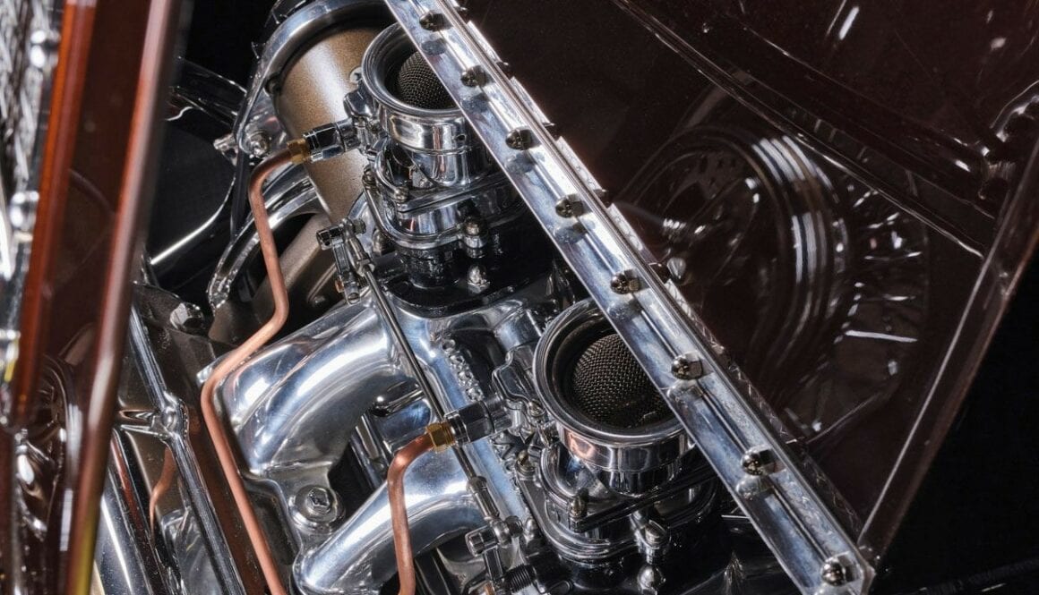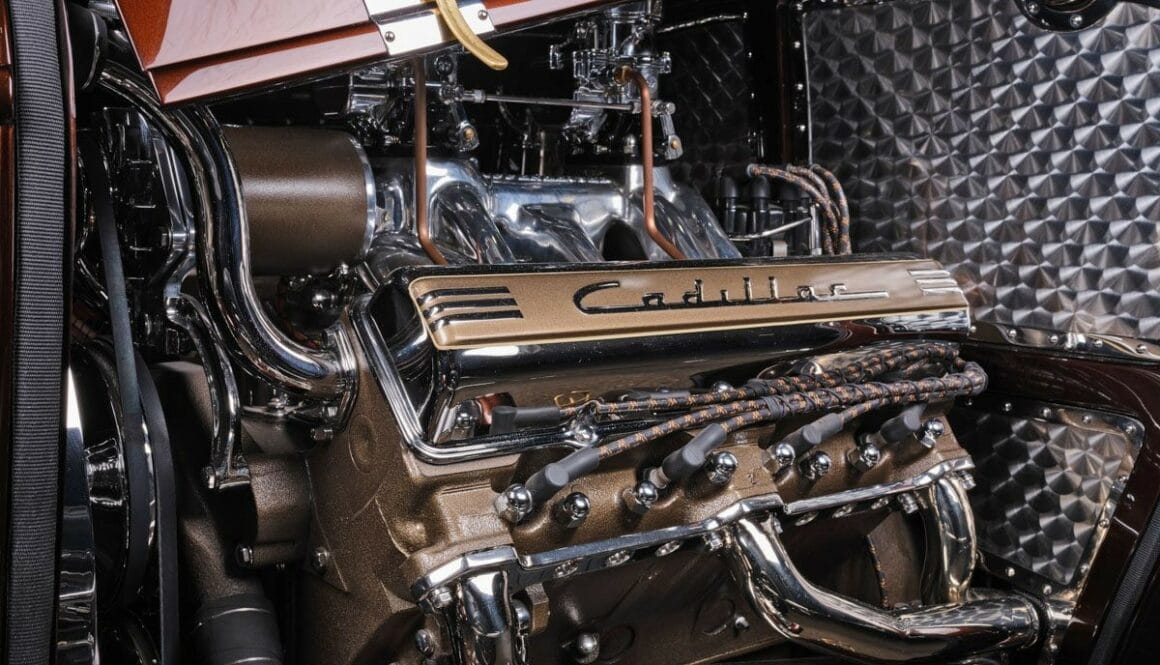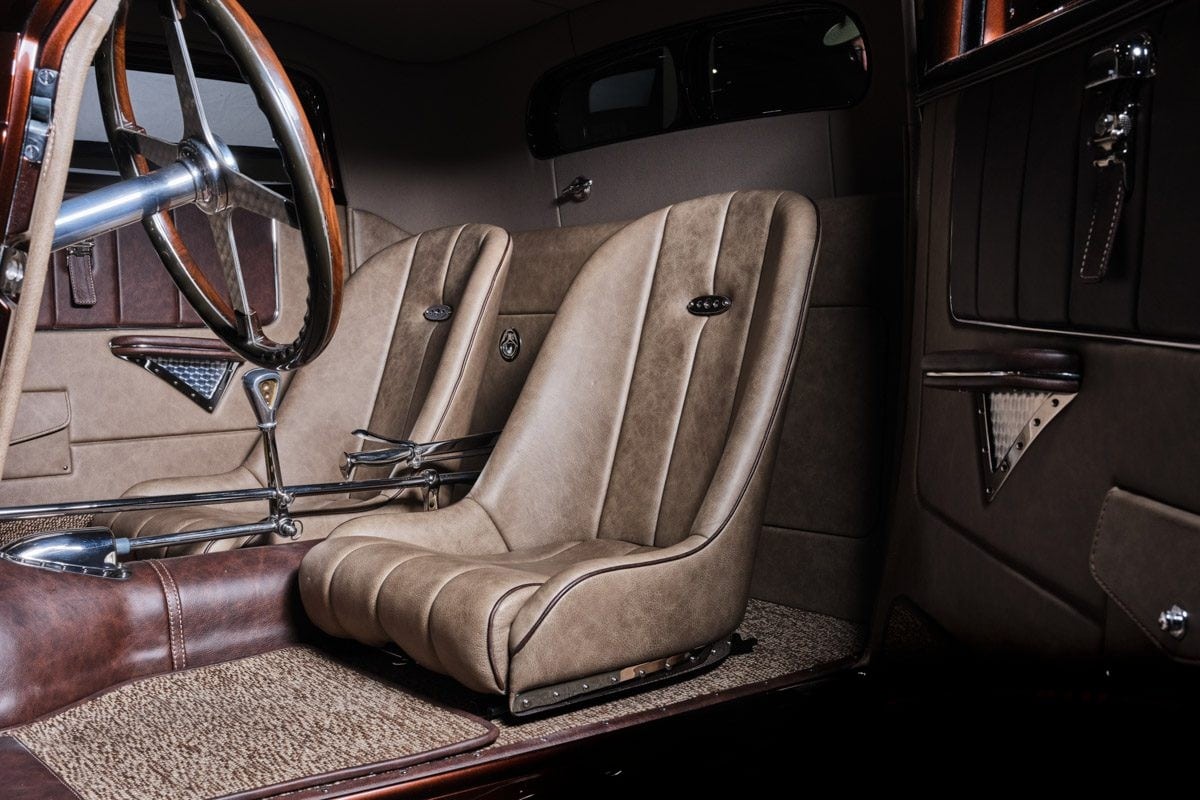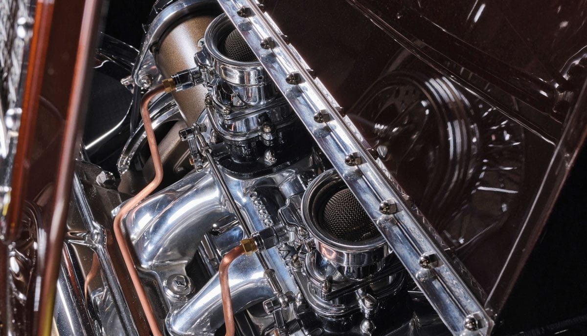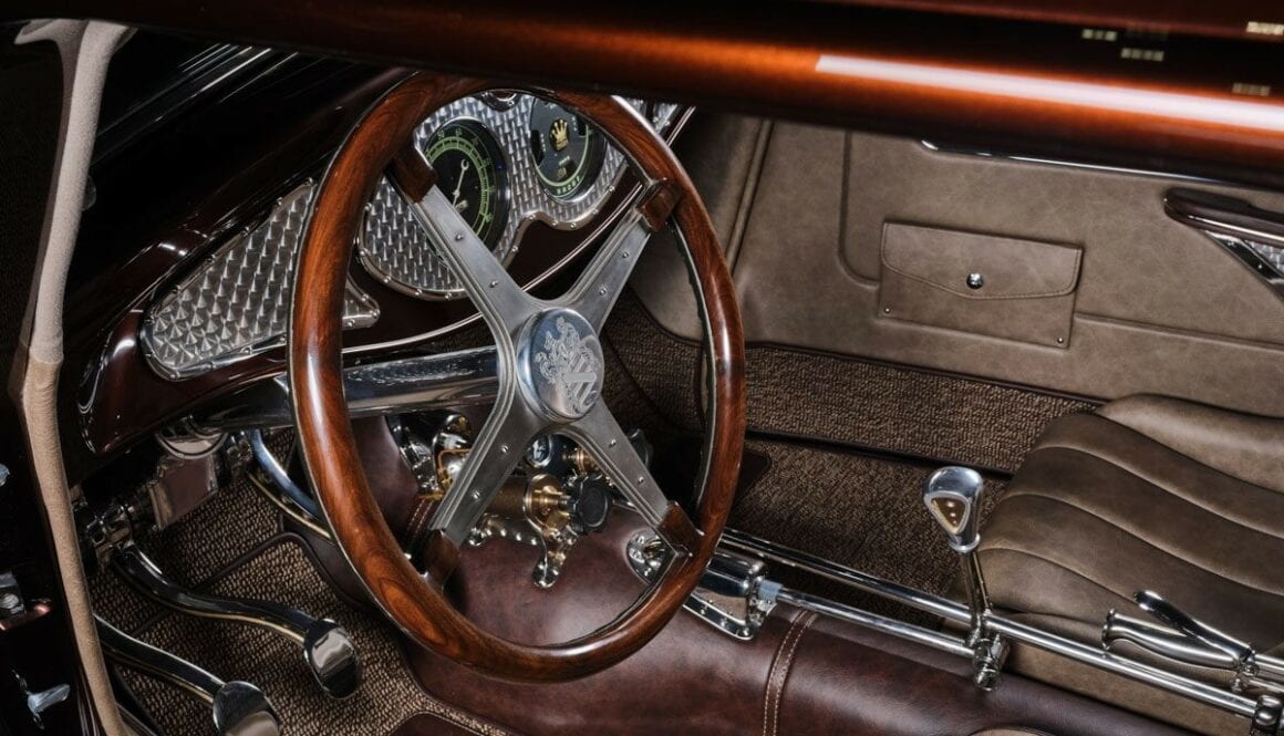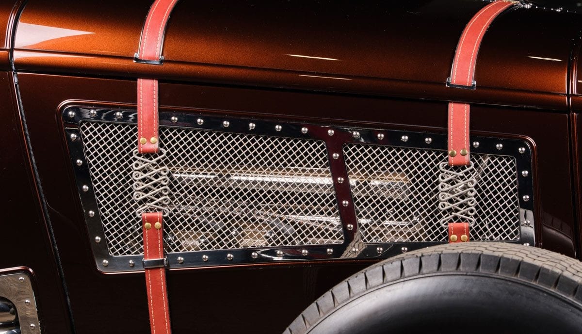 Un peu de technologie d’après-guerre a été utilisée avec la récupération d’un V8 Cadillac vintage 390ci, le premier des V8 “domestiques” à soupapes en tête. Celui-ci a été pourvu d’une paire de carburateurs Stromberg’97. Les détails sont incroyables, combinant un mélange de placages et de surfaces peintes. Les échappements personnalisés sortent par un relief enveloppé dans le capot, mais les gaz d’échappement peuvent également être acheminés sous la voiture.