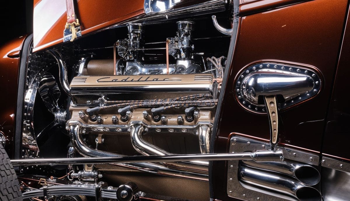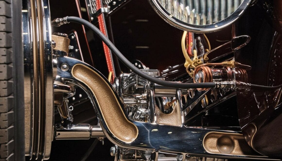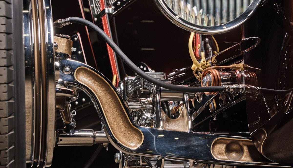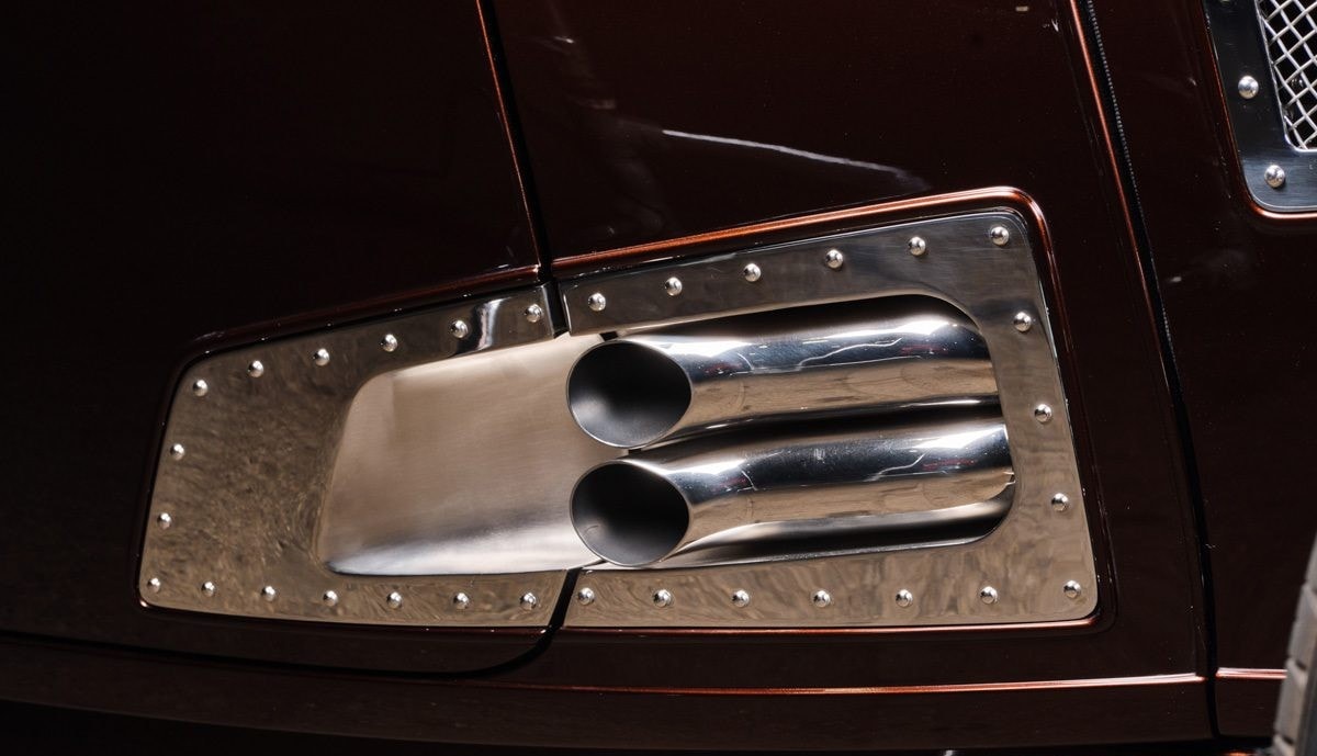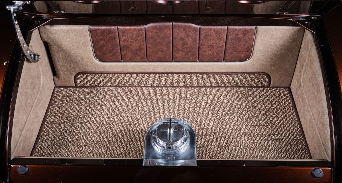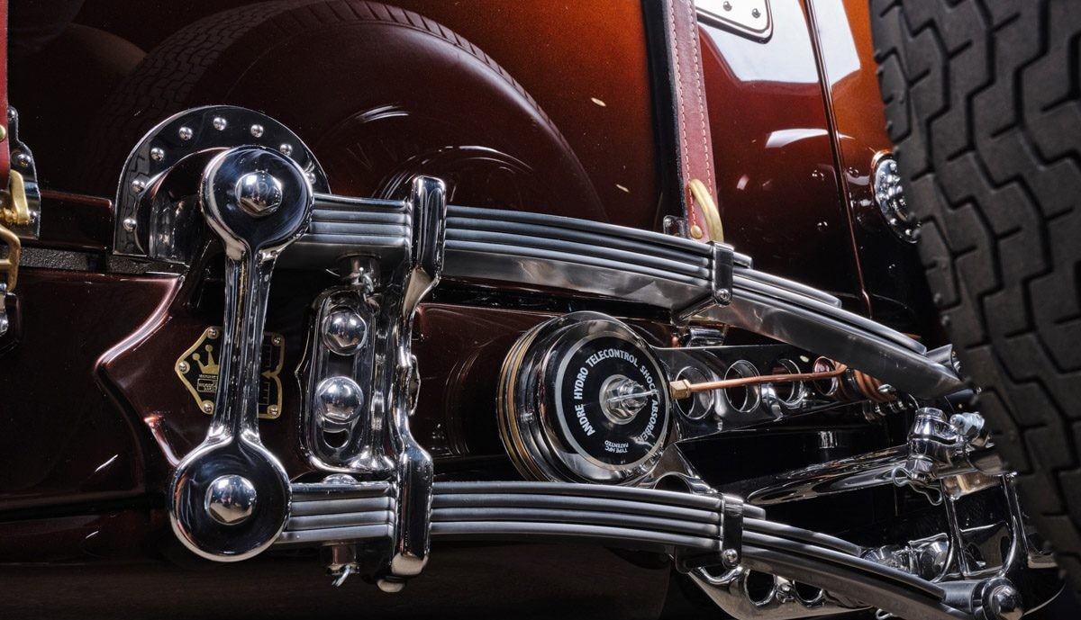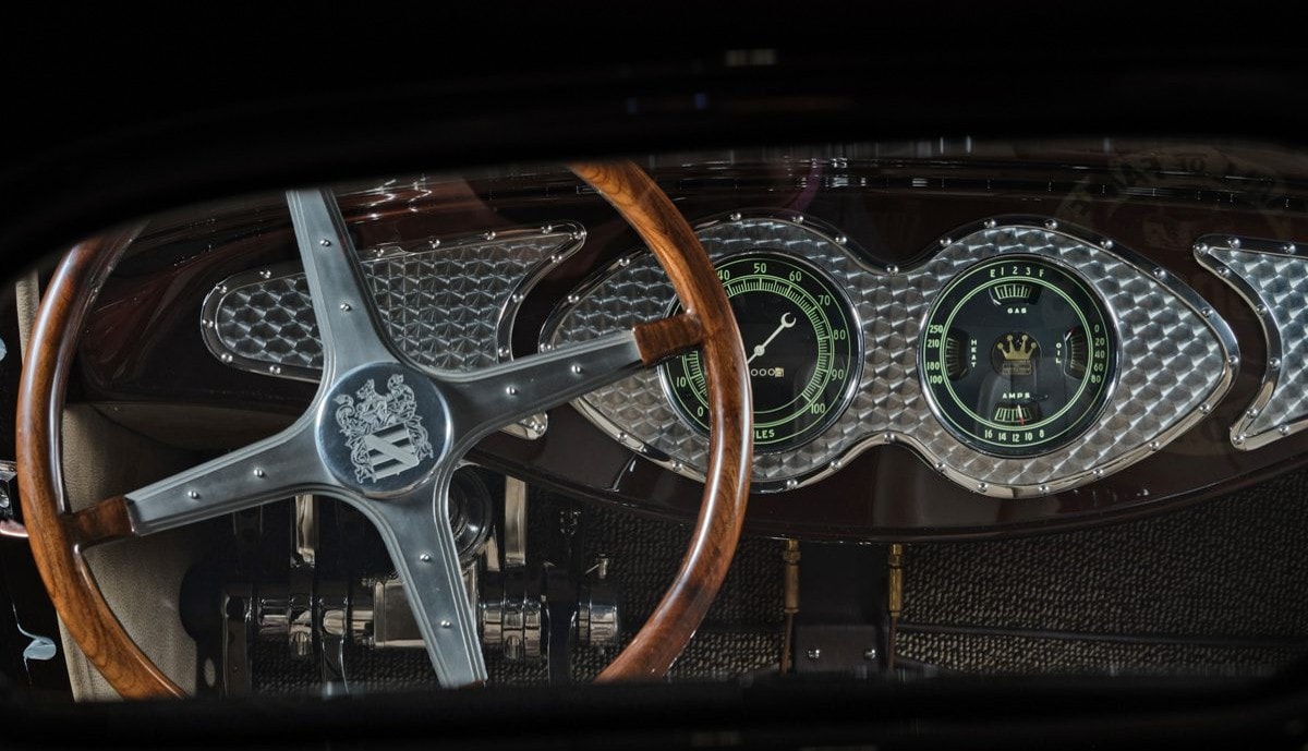 Un peu de technologie d’après-guerre a été utilisée avec la récupération d’un V8 Cadillac vintage 390ci, le premier des V8 “domestiques” à soupapes en tête. Celui-ci a été pourvu d’une paire de carburateurs Stromberg’97. Les détails sont incroyables, combinant un mélange de placages et de surfaces peintes. Les échappements personnalisés sortent par un relief enveloppé dans le capot, mais les gaz d’échappement peuvent également être acheminés sous la voiture.