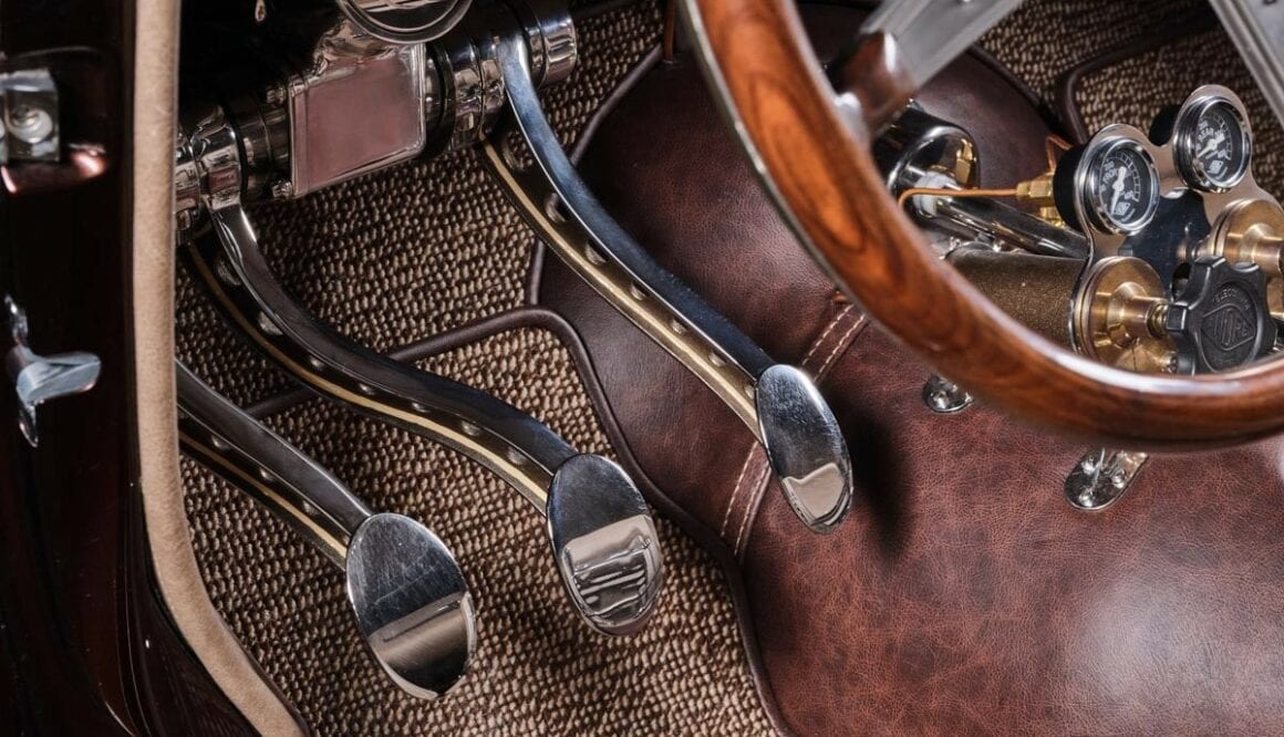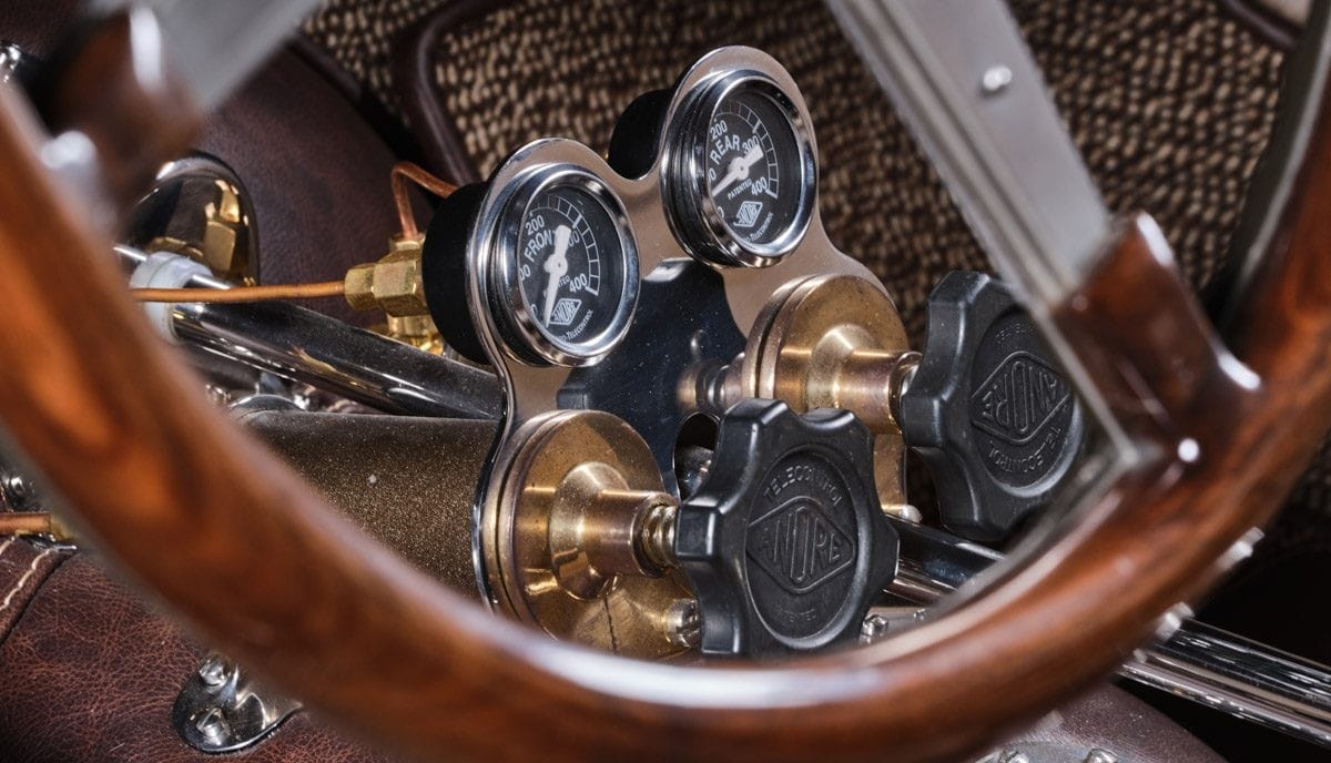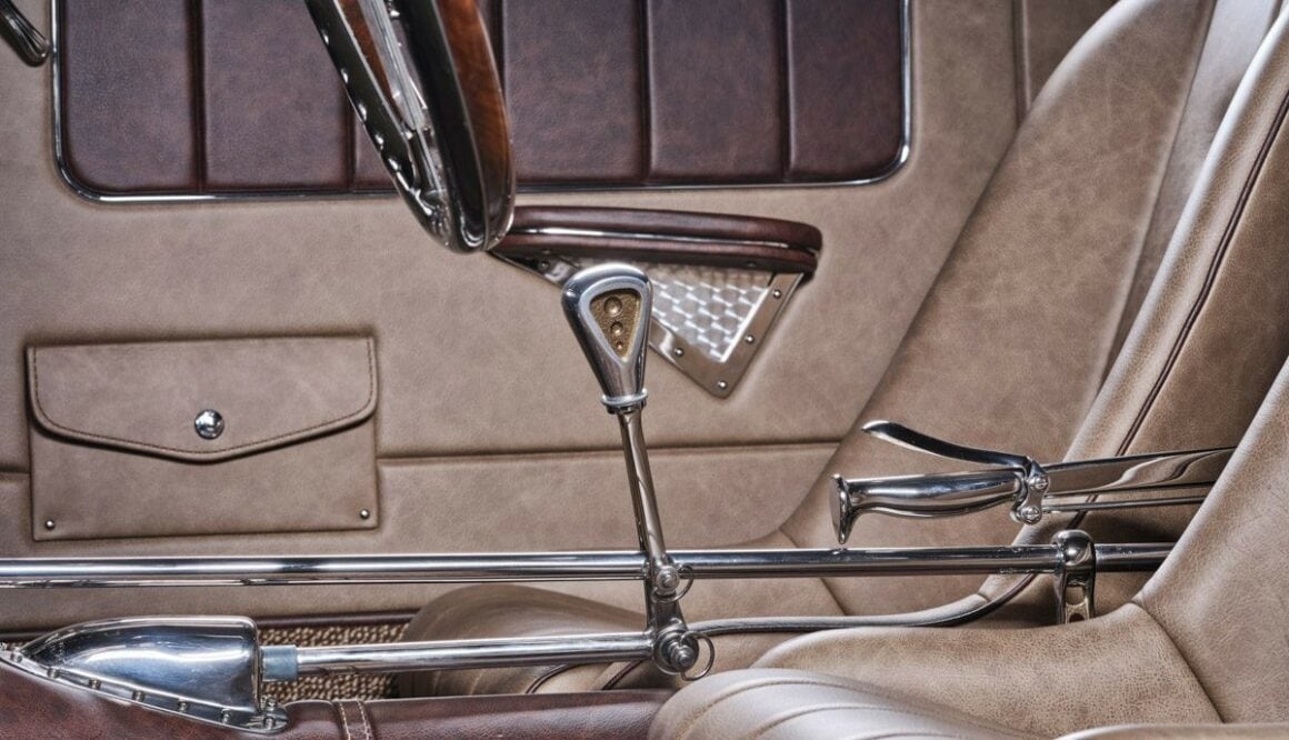 Mick Jenkins et son équipe de Mick’s Paint sont les artisans se cette carrosserie. Le caractère général se retrouve dans le cockpit, qui est recouvert d’une sellerie en cuir bicolore d’un style épuré évoquant les premières voitures de sport. Mark Lopez d’Elegance Auto Interiors est crédité pour ce travail. Les inserts du tableau de bord et d’autres pièces de garniture rehaussent la saveur générale, tout comme le levier de vitesses, les pédales et le volant en bois.