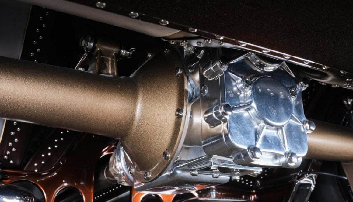 Les trous d’allègement (sic !), les milliers de rivets; la peinture bronze et autres détails donnent à l’engin l’impression d’un décalage temporel… Le reste n’est que de l’adaptation quasi cinématographique pour un film uchronique… Wheelsmith a construit les roues fils de 16 et 18 pouces en utilisant des “moyeux britanniques” récupérés d’une Jaguar SS100, avec des pneus Dunlop aidant à compléter l’apparence d’une voiture de ancienne construite par un full félé.