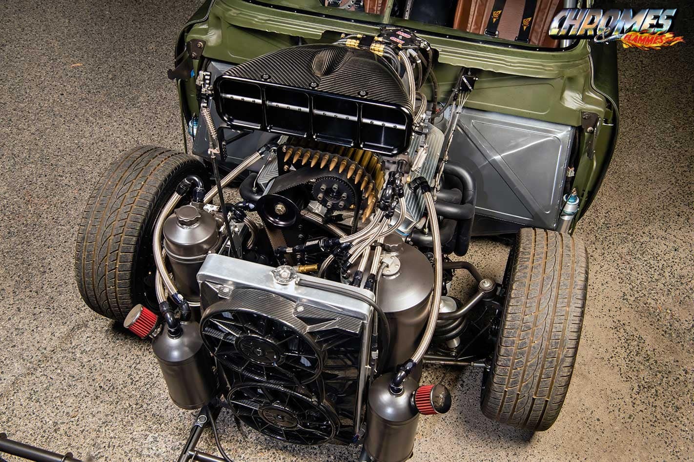 Comme vous l’avez probablement compris par le nom “BMRC” de leur entreprise, Black père et fille sont tout deux au top au sujet de la construction de Kustom’s et Hot-Rod’s à l’Australienne façon Dragsters, et c’est à peu près comme ça qu’ils ont abordé cette construction nommée en australien d’un intraduisible “Epuisement professionnel” que je n’ai pas réussi à interpréter ! : “Je crois beaucoup à l’aspect sécurité des choses. À la vitesse à laquelle ils basculent, la merde commence à devenir rapide et dangereuse. Pour faire ce que nous devions faire, c’était plus facile pour moi de la construire comme une voiture de course de drag de rue, alors nous pouvions mettre les choses où nous voulions et faire en sorte que tout fonctionne” a surenchérit Geoff Black.