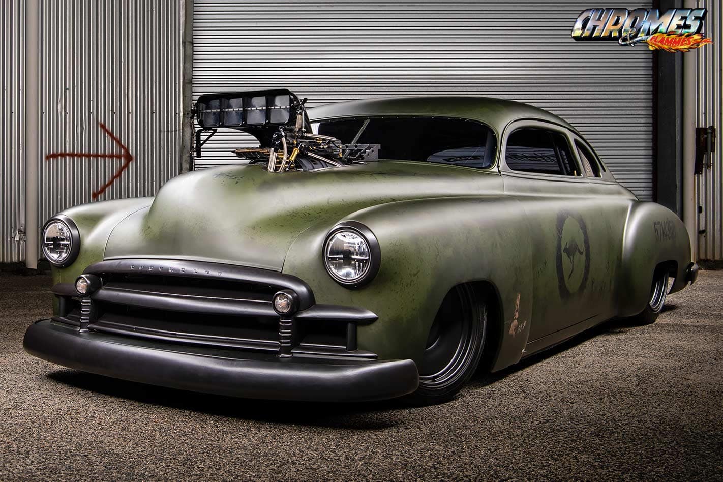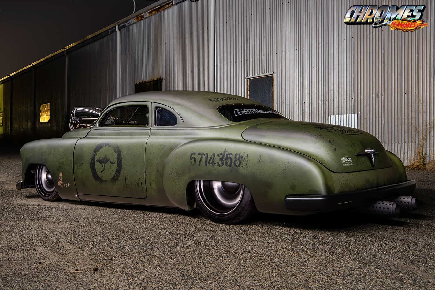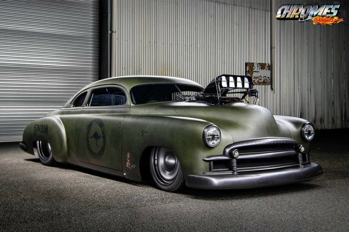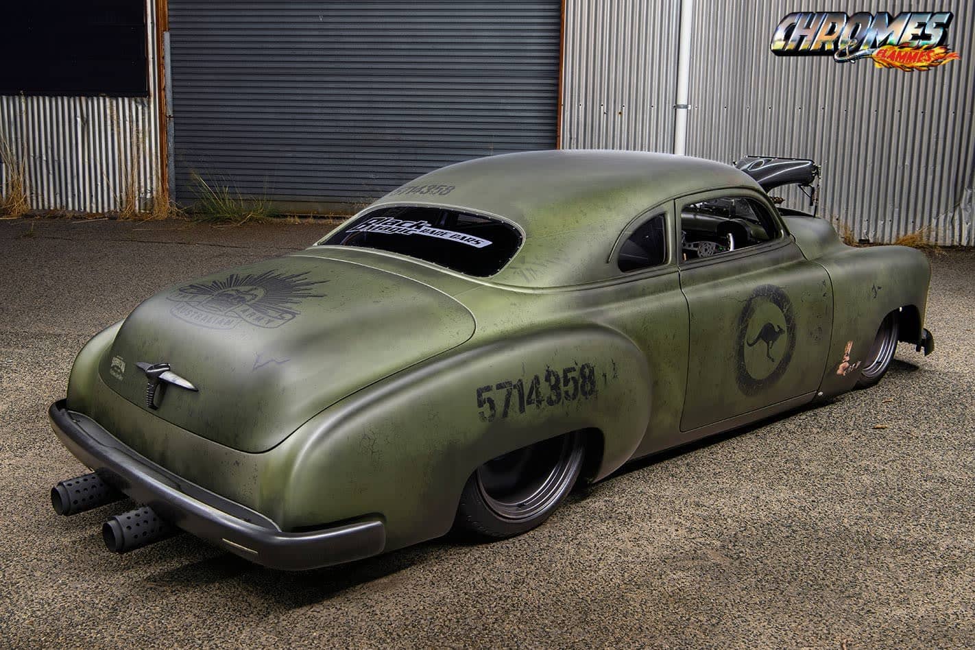 Voilà donc l’ambiance dans laquelle cette Street Machine “verdache” construite par des membres de la communauté “blanche”, se meut sur le thème de l’armée australienne… Elle est complètement différente de tout ce qui se fait dans l’univers du Hot-Rodding et du Kustomizing, mais aussi parce qu’elle s’affiche avec une tonne de touches et de caractéristiques de conception, alors que la tendance dominante des constructions de voitures similaires affichent un “épuisement professionnel” au cours des dernières années qui s’orientent à la transformation de voitures plus récentes en “destructrices de pneus” !